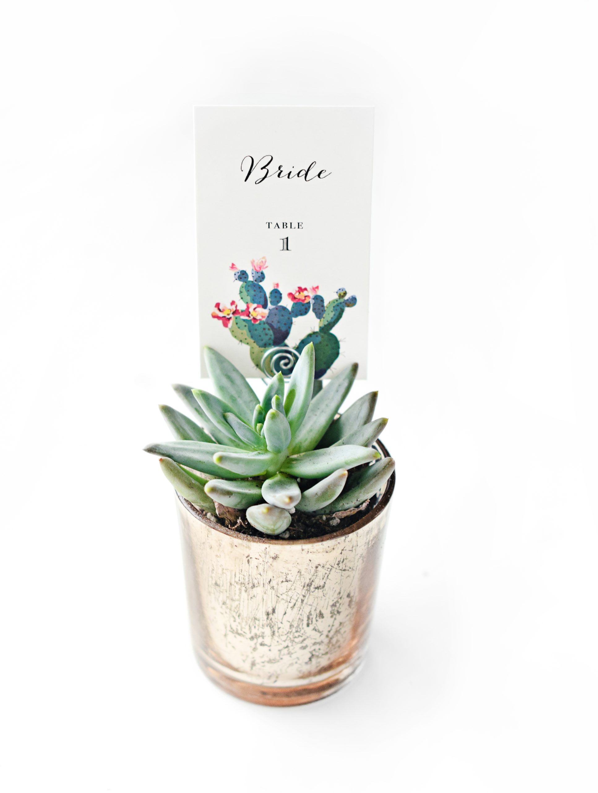 Our Desert Love flat place cards and matching invite compliment the planters in color and style – especially if you choose a few different kinds of succulents to use! The slight variation in textural details adds an eclectic, unique look to your tablescape.