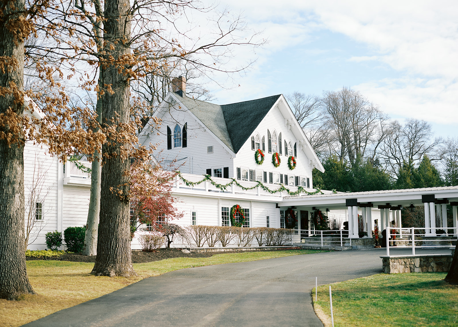 Jenna and Billy’s elegant and modern emerald green winter wedding. The couple got married at The Ryland Inn which was decorated for Christmas with wreaths, winter garland and nutcracker statues. Jenna customized our Blush Bouquet wedding invitations with white paper, emerald envelopes and a custom monogram and venue watercolor illustration. Floral arrangements featured lots of white roses and hydrangeas with evergreen accents for a wintery feel. The bride wore a long sleeve lacy gown while her bridesmaids dressed in emerald satin and velvet. The groom and his groomsmen wore elegant black tuxedos with black velvet bowties. Ceremony and reception decor included pine trees with white lights and cedar garland with candles.f