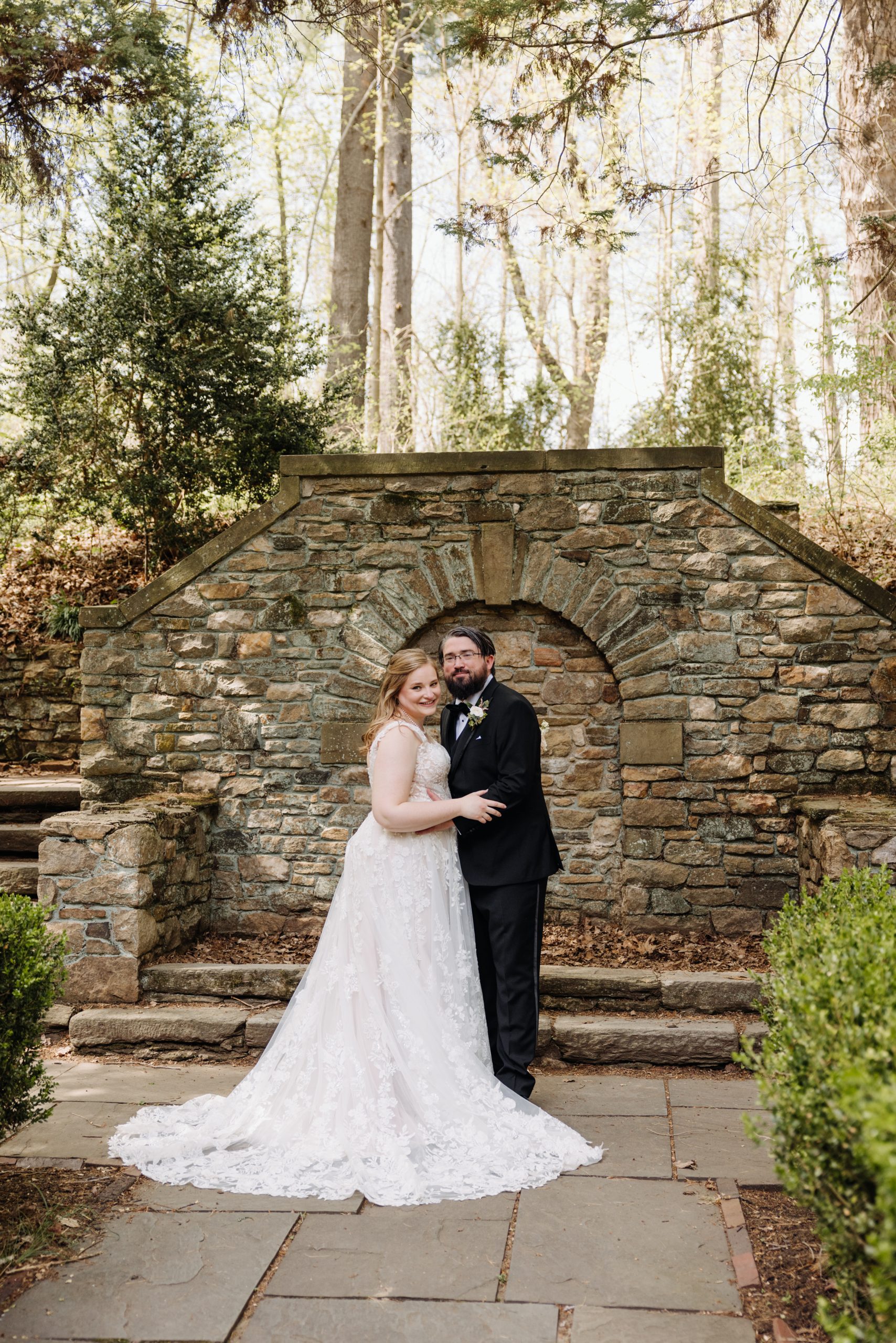 Rachel and Christian’s wildflower garden wedding features plenty of vintage cottagecore details! The couple held their ceremony and reception in a dreamy stone mansion at Parque at Ridley Creek State Park in Newtown Square, Pennsylvania. Our Earthy Garden bundled invitations set the perfect tone for the day! The bridal party carried soft blush rose, peony and eucalyptus bouquets. The bridesmaids dressed in blush and rose while Rachel wore a floral lace gown to match the floral theme. We love the colorful flowers in vintage glass vases used as centerpieces! The wildflower decor continues with flower seed packet escort cards and tables named after flowers.