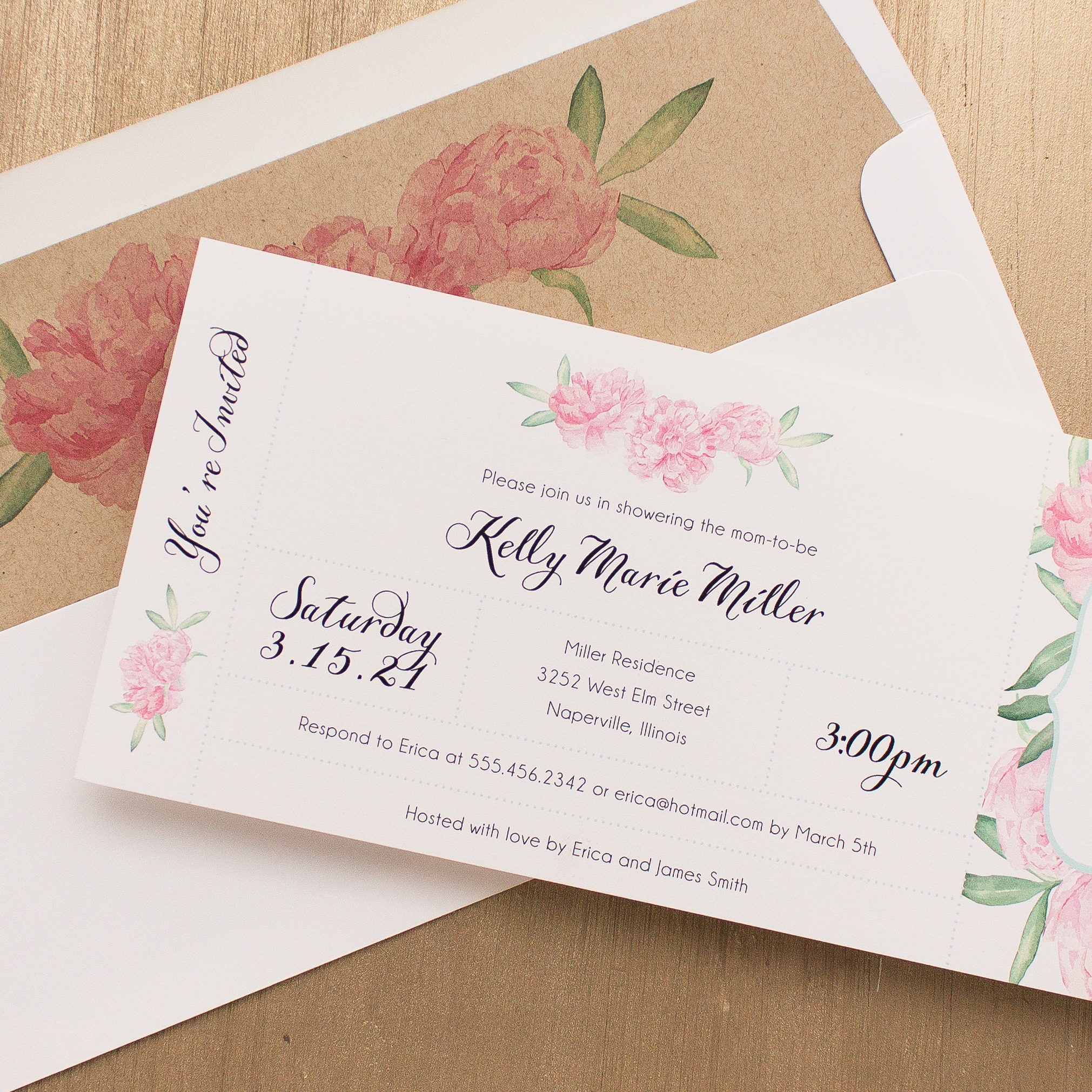 Our peony baby shower invitations are small, cute and such a delight. Unique long baby shower invitations with matching envelope liners. Perfect for a pink themed baby shower. Each invite is made to order with your personalized wording and then hand assembled with a matching envelope liner printed on the paper of your choice.