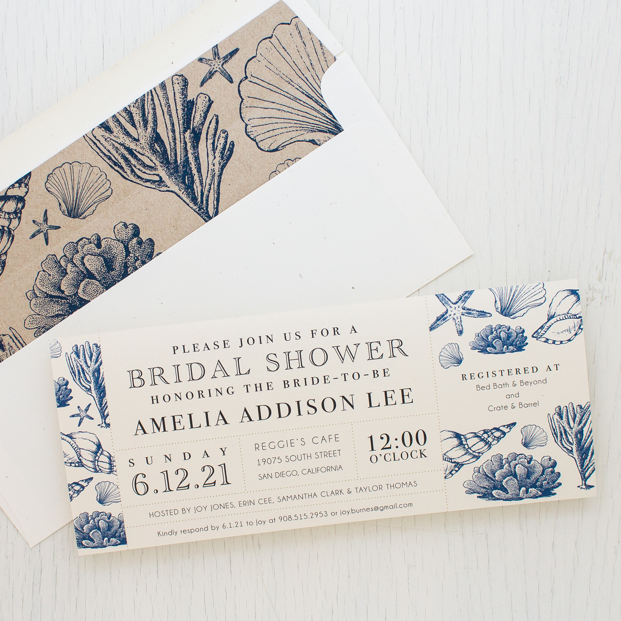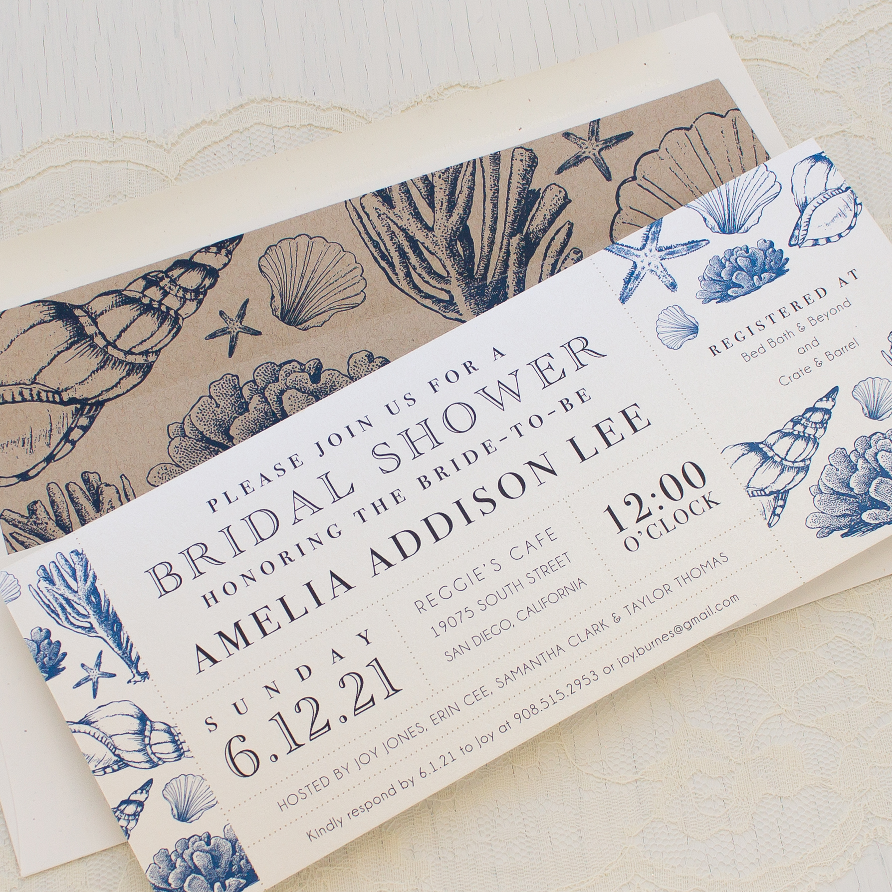 Our unique long invitations are printed on luxe heavyweight paper with a pearl shimmer finish, offering a touch of vintage flair. These beach bridal shower invitations come fully assembled with a matching hand crafted envelope liner.