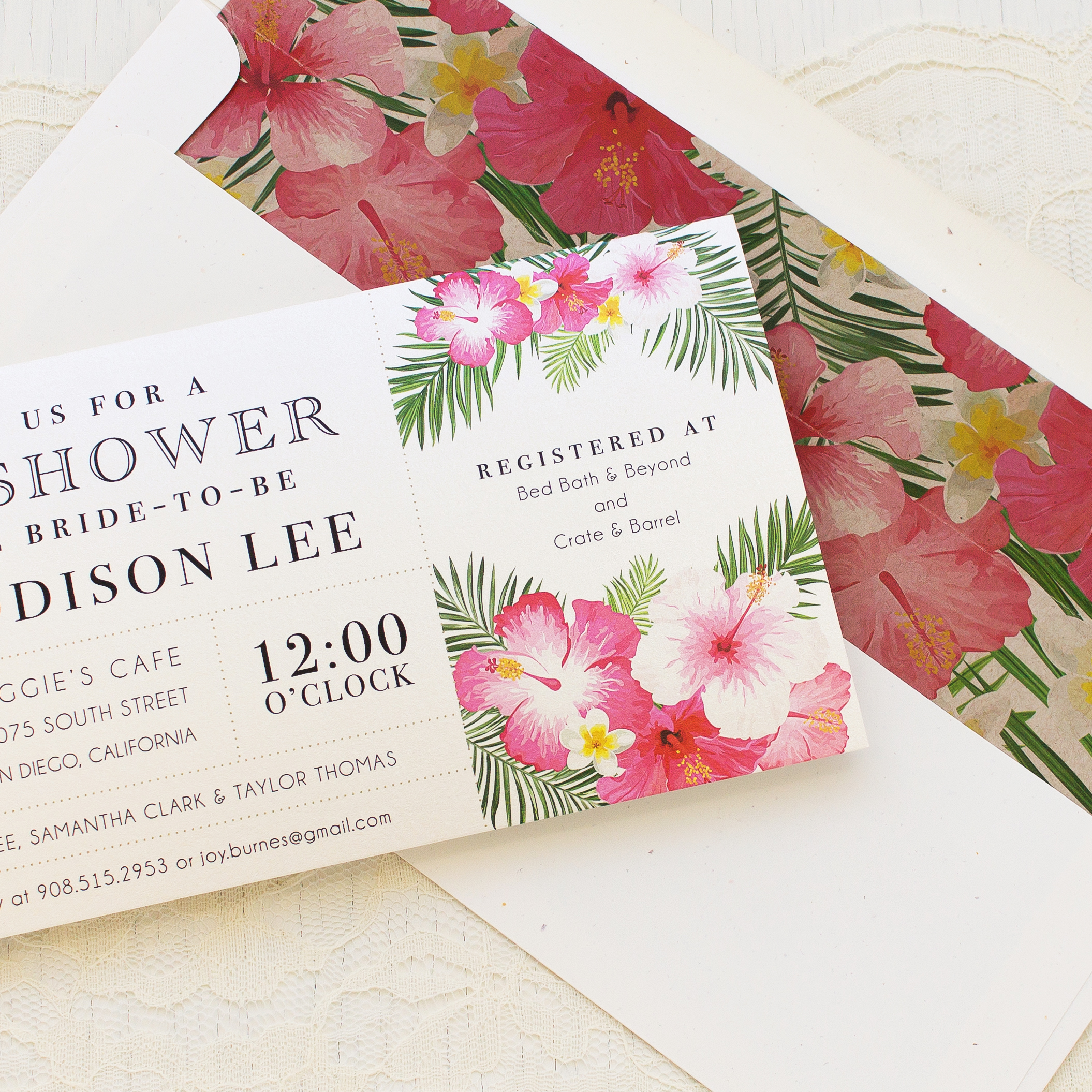 Delight your guests with our Bright Tropical bridal shower invitations. Featuring bright pink hibiscus and palm leaf illustrations with simple fonts, they set the perfect tone for your tropical garden bridal shower brunch.