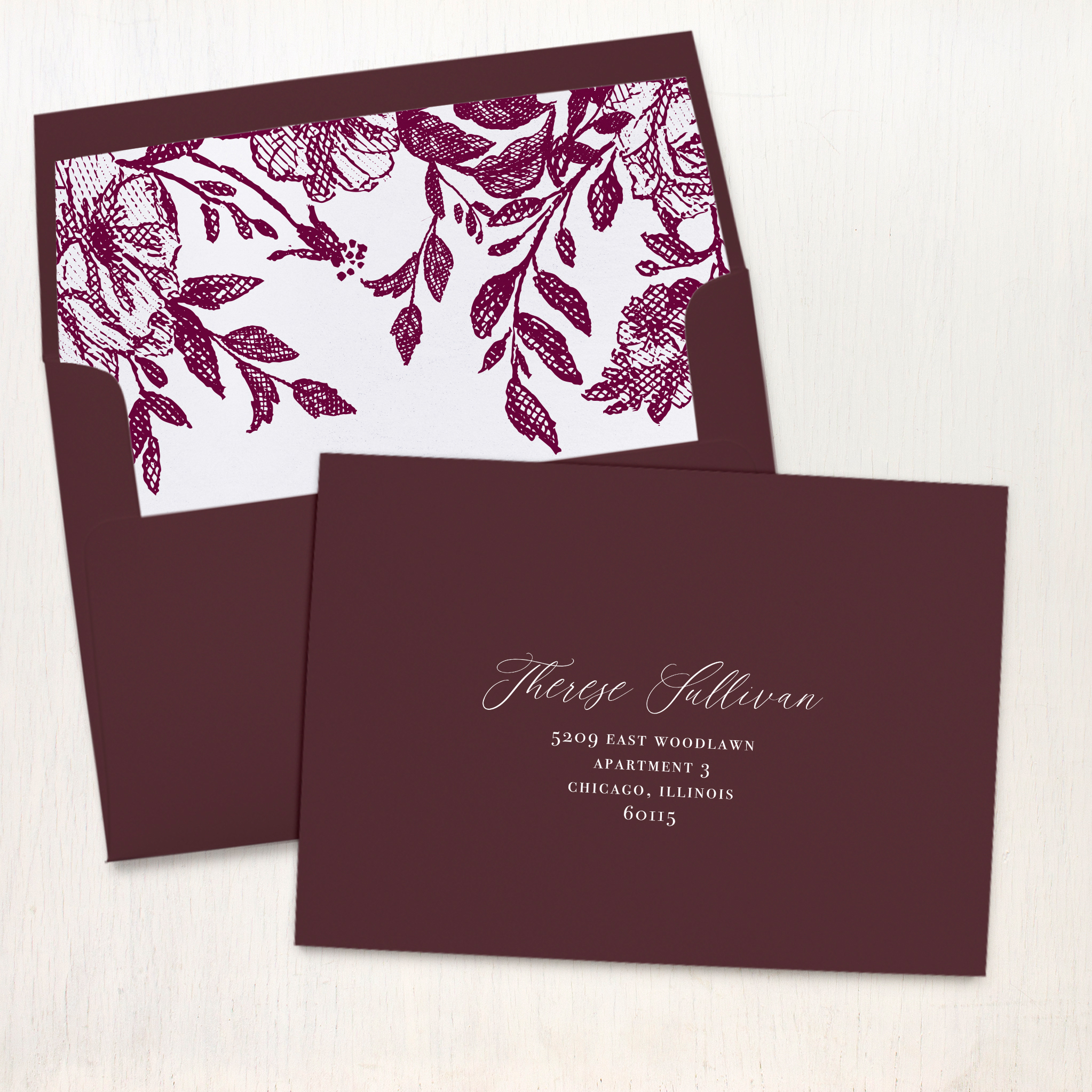 - Burgundy solid envelope w/ matching floral envelope liner
