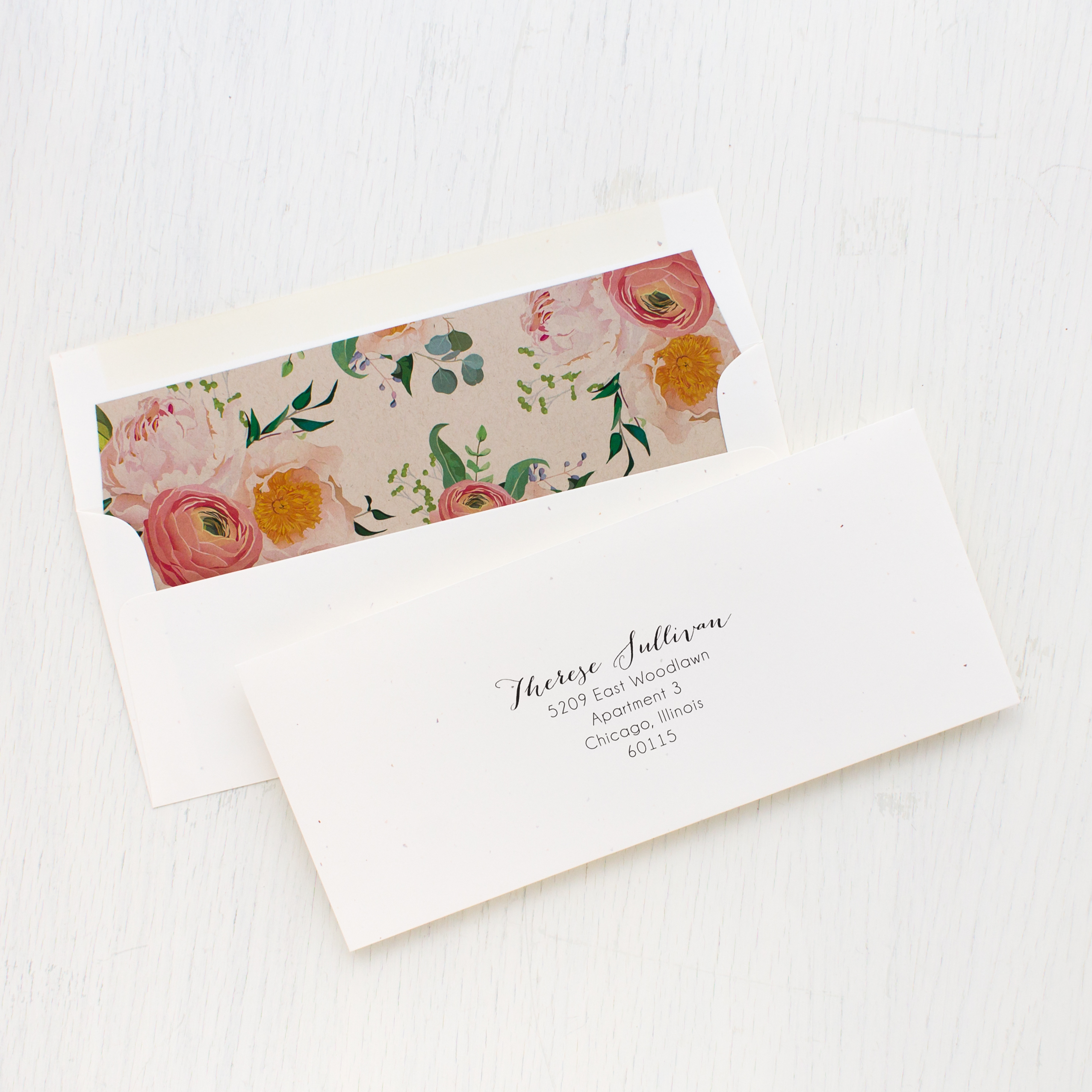 Our unique long invitations are printed on luxe heavyweight paper with a pearl shimmer finish, offering a touch of vintage flair. These cards come fully assembled with a matching hand crafted envelope liner.