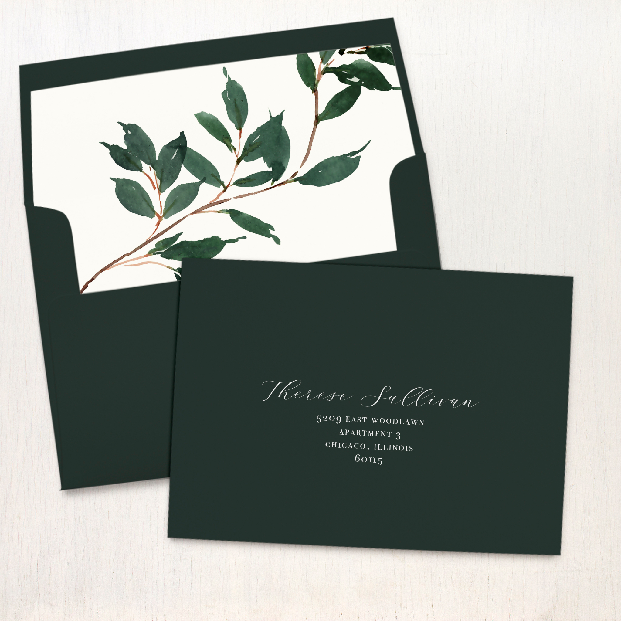 Delight your guests with these Forest Green Modern bridal shower invitations. These cards come fully assembled with matching greenery envelope liners. Add on envelope printing to mail your invites in style. Shower the bride with matching day of stationery items like menus, favor tags, place cards, and more!