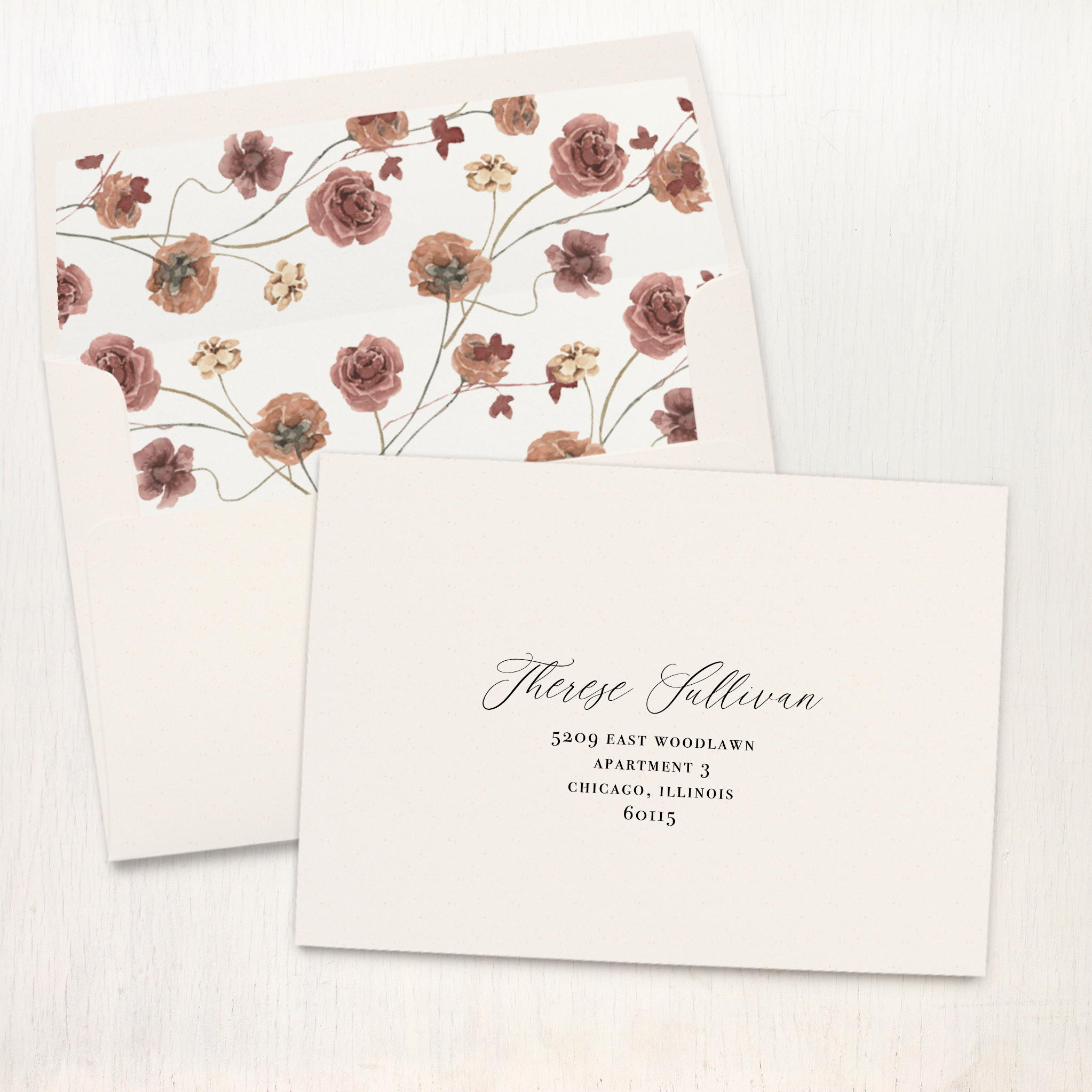Delight your guests with these rustic boho bridal shower invitations. These cards come fully assembled with matching floral envelope liners. Add on envelope printing to mail your invites in style. Shower the bride with matching day of stationery items like menus, favor tags, place cards, and more!