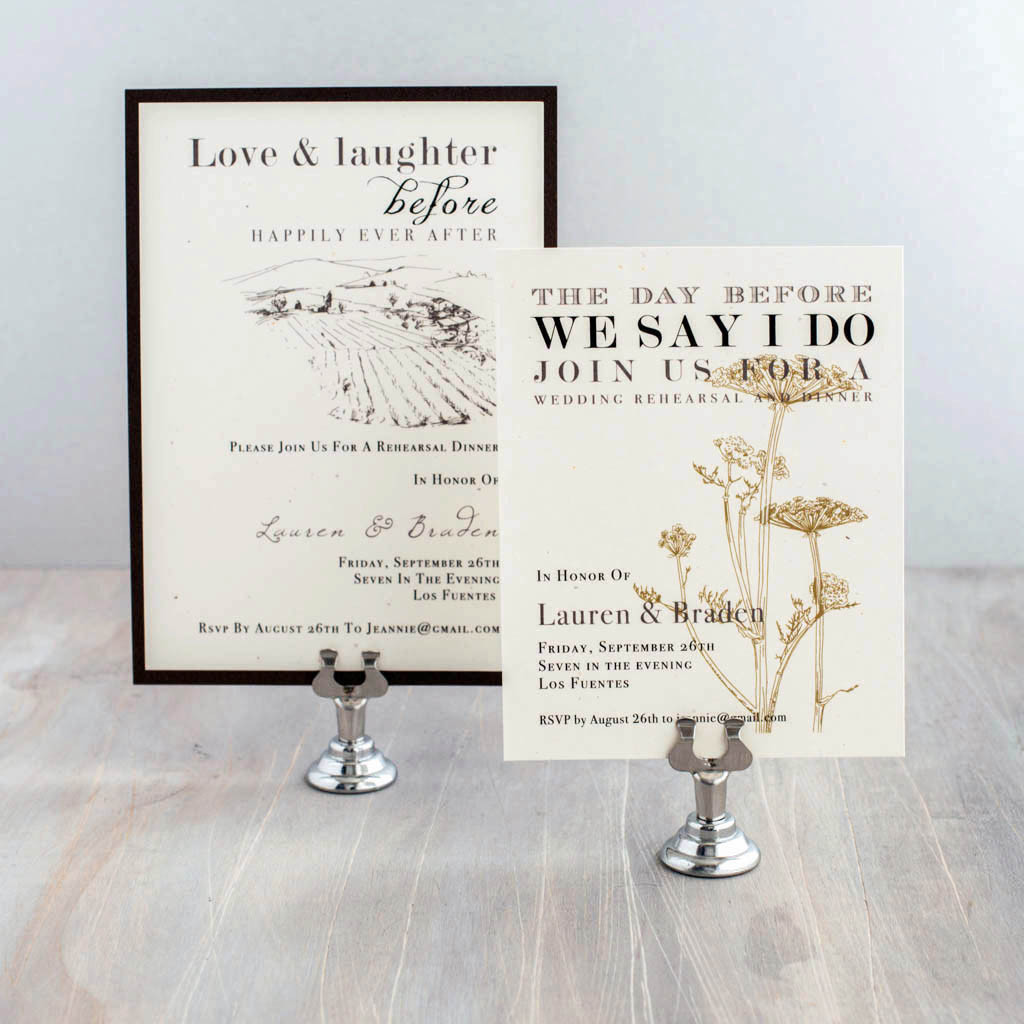Practice makes perfect! Invite family and friends to celebrate with you the night before with these modern Farm Chic rehearsal invitations. Inspired by a farm to table dinner soiree, these invites have the right amount of country charm.