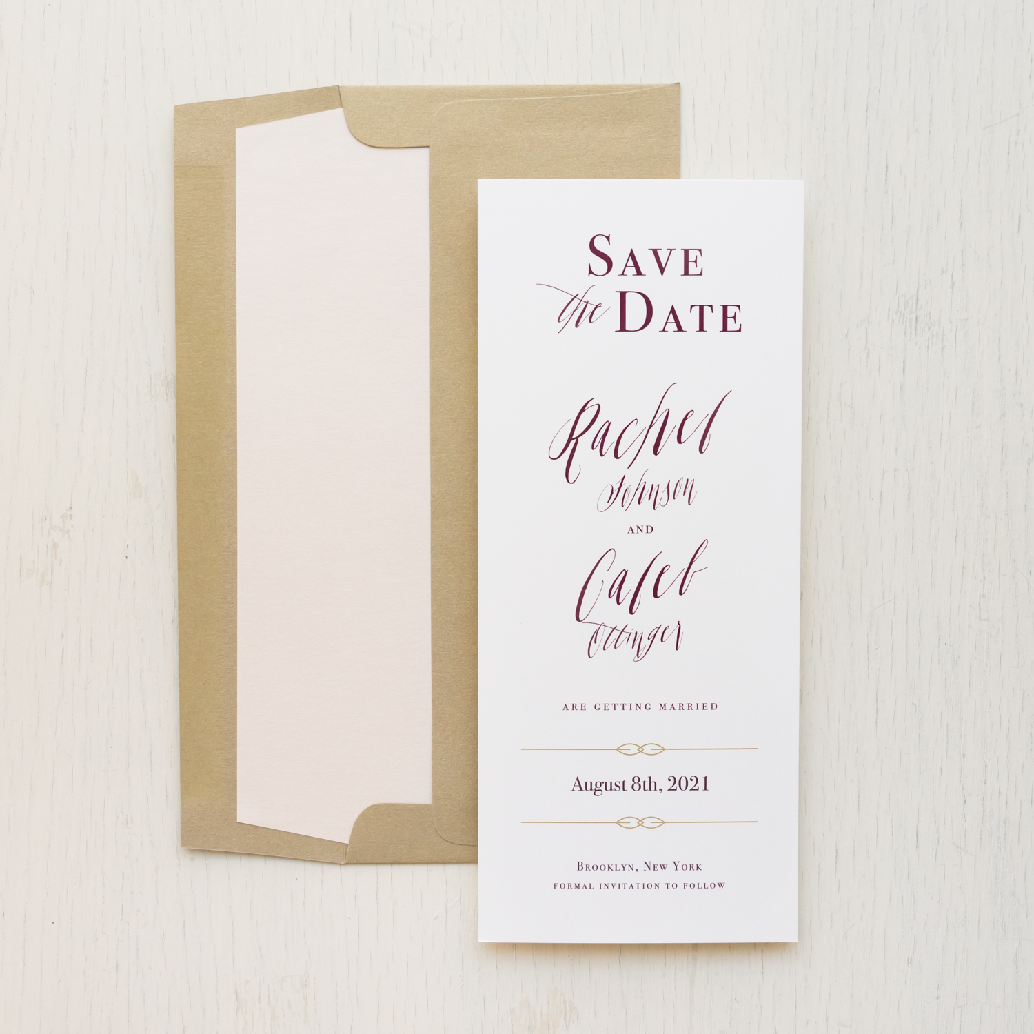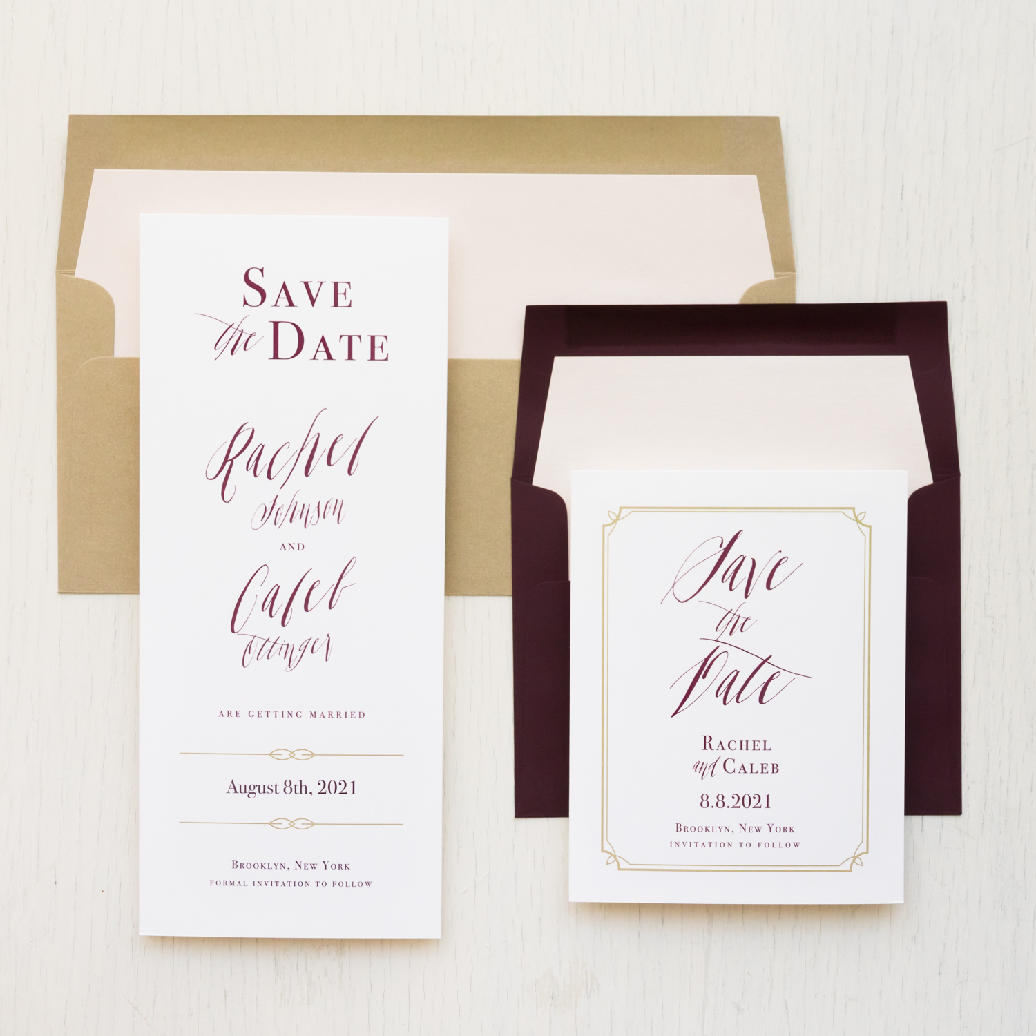 Burgundy calligraphy save the dates layered with romantic script fonts, ivory paper and hand crafted envelope liners. Sleek and classy, they’ll set a modern yet timeless tone for your sophisticated nuptials.