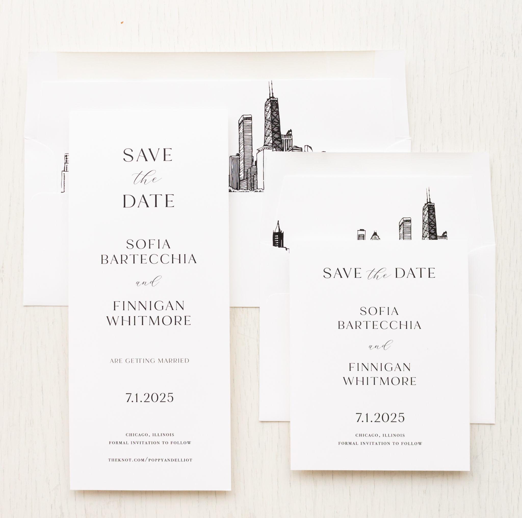 Chicago Modern save the dates layered with modern fonts, white paper and hand crafted envelope liners. Sleek and classy, they’ll set an elegant tone for your sophisticated nuptials.