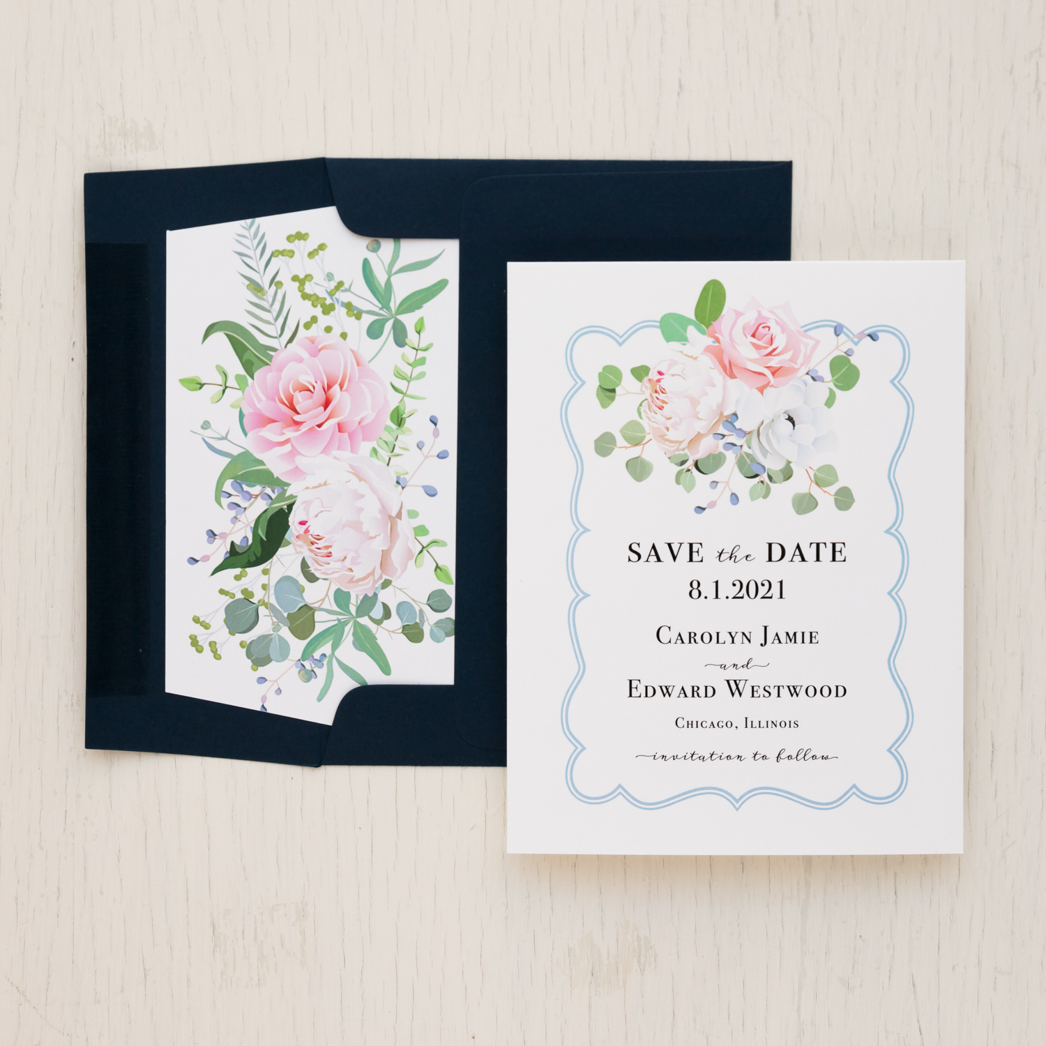These Dusty Blue Save the Dates are layered with modern fonts, white paper, pink and white florals and hand crafted envelope liners. Sleek and classy, they’ll set an elegant tone for your sophisticated nuptials.