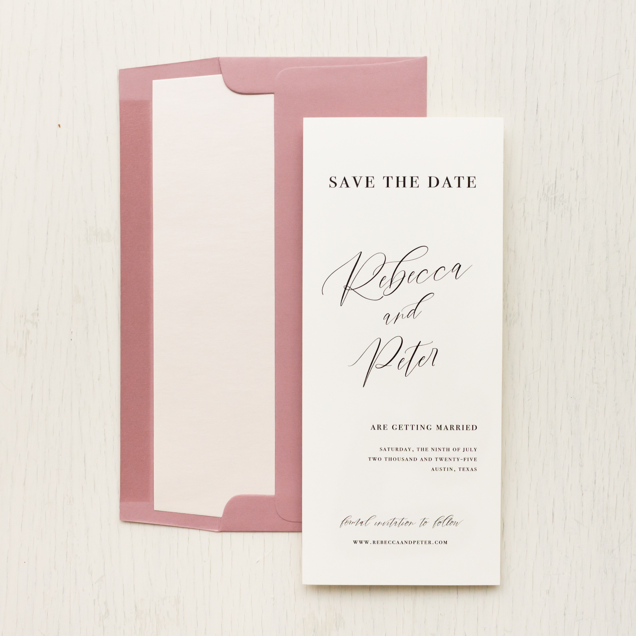 Dusty rose save the dates layered with calligraphy fonts, soft ivory paper and blush envelope liners. Sleek and classy, they’ll set an elegant tone for your sophisticated nuptials.
