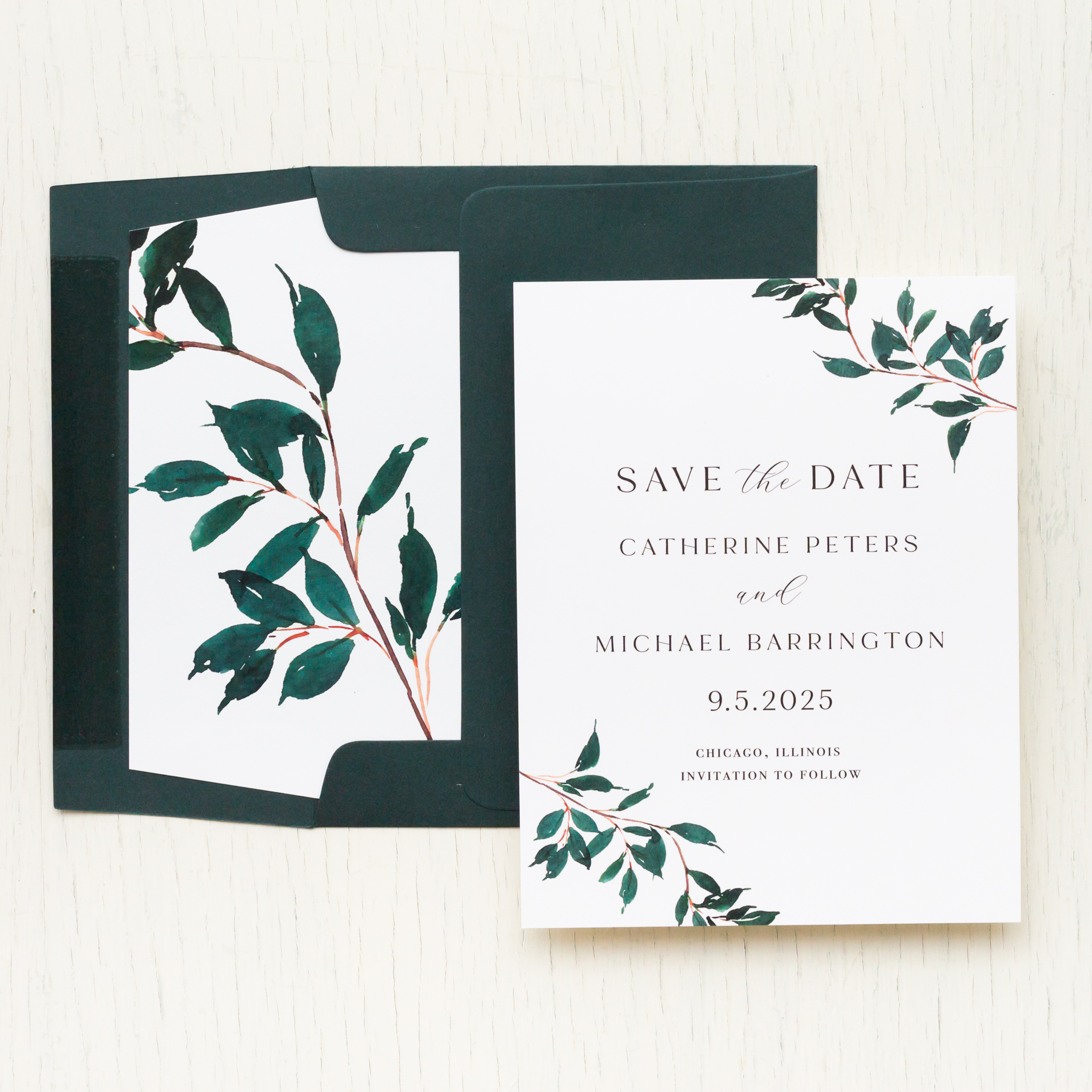 To calculate pricing for these modern forest green save the dates, click on the place your order button below.