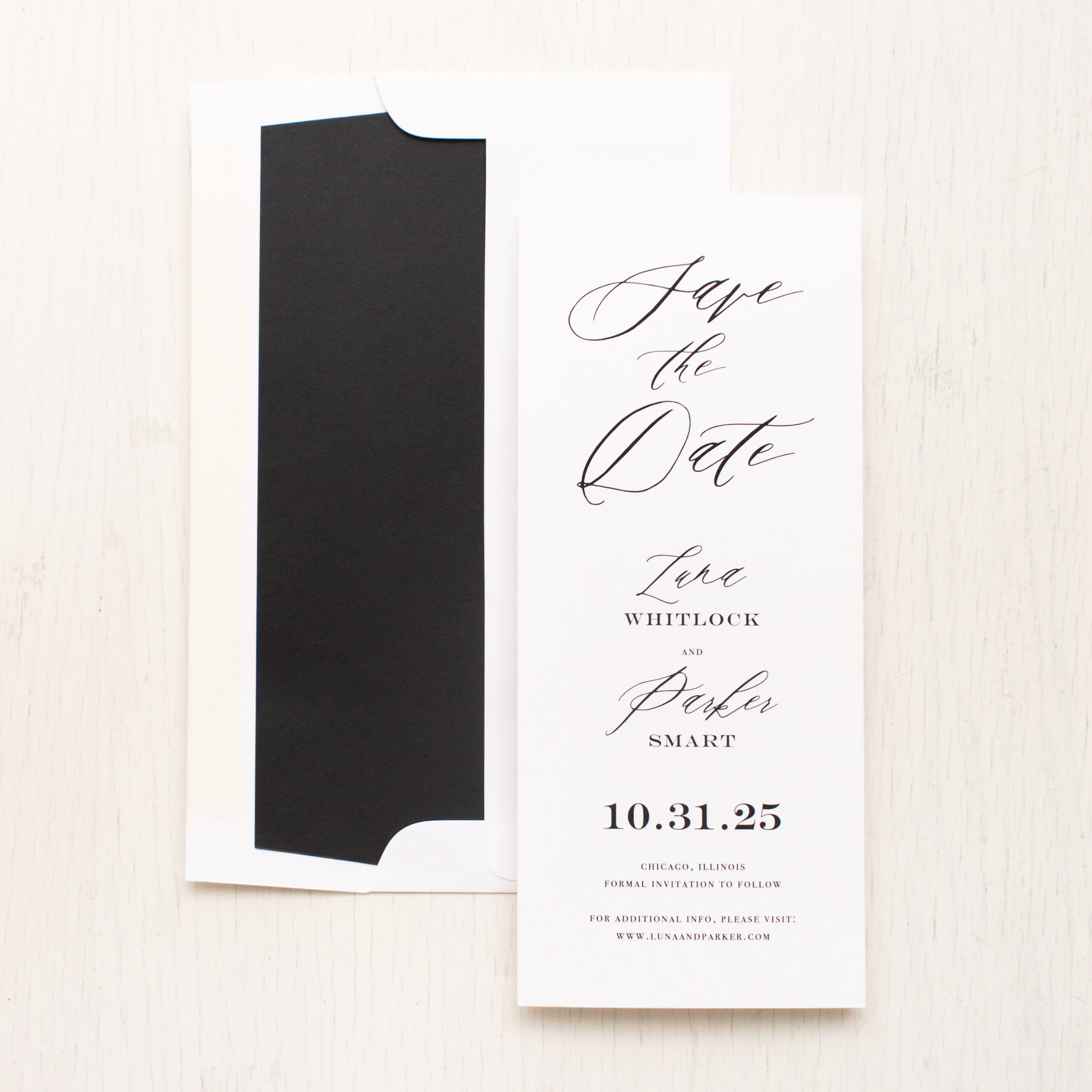 Modern black & white save the dates layered with calligraphy fonts, white paper and hand crafted envelope liners. Sleek and classy, they’ll set an elegant tone for your sophisticated nuptials.