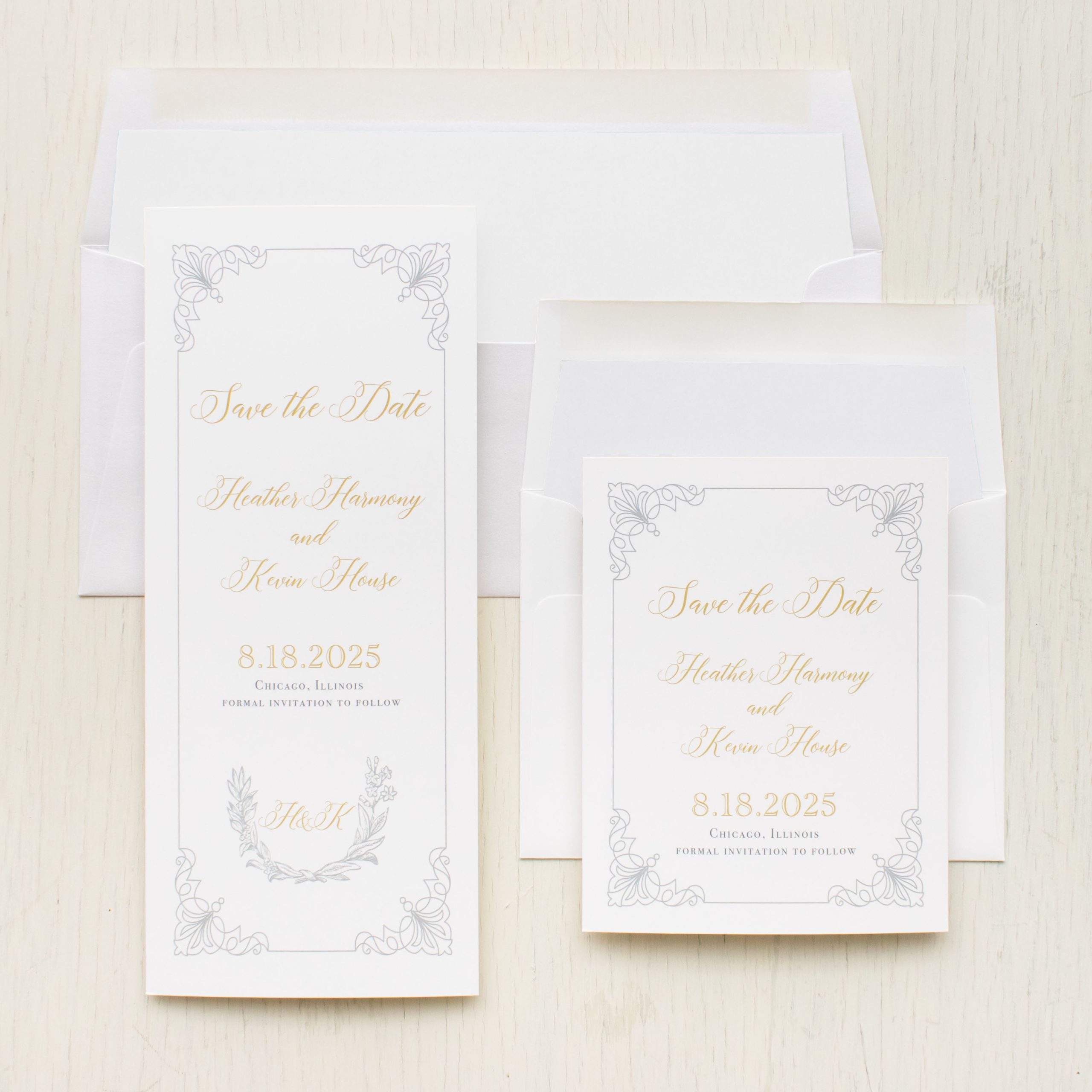 Silver & gold save the dates layered with calligraphy fonts, white shimmer envelopes and handcrafted gold metallic envelope liners. Sleek and classy, they’ll set an elegant tone for your sophisticated nuptials.