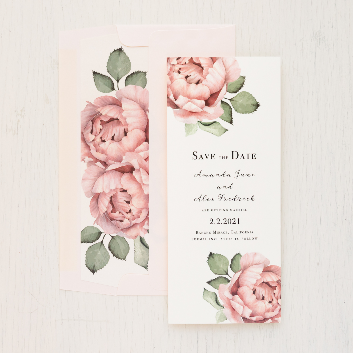 Simple blush save the dates layered with modern fonts, ivory paper, blush florals and hand crafted envelope liners. Sleek and classy, they’ll set an elegant tone for your sophisticated nuptials.