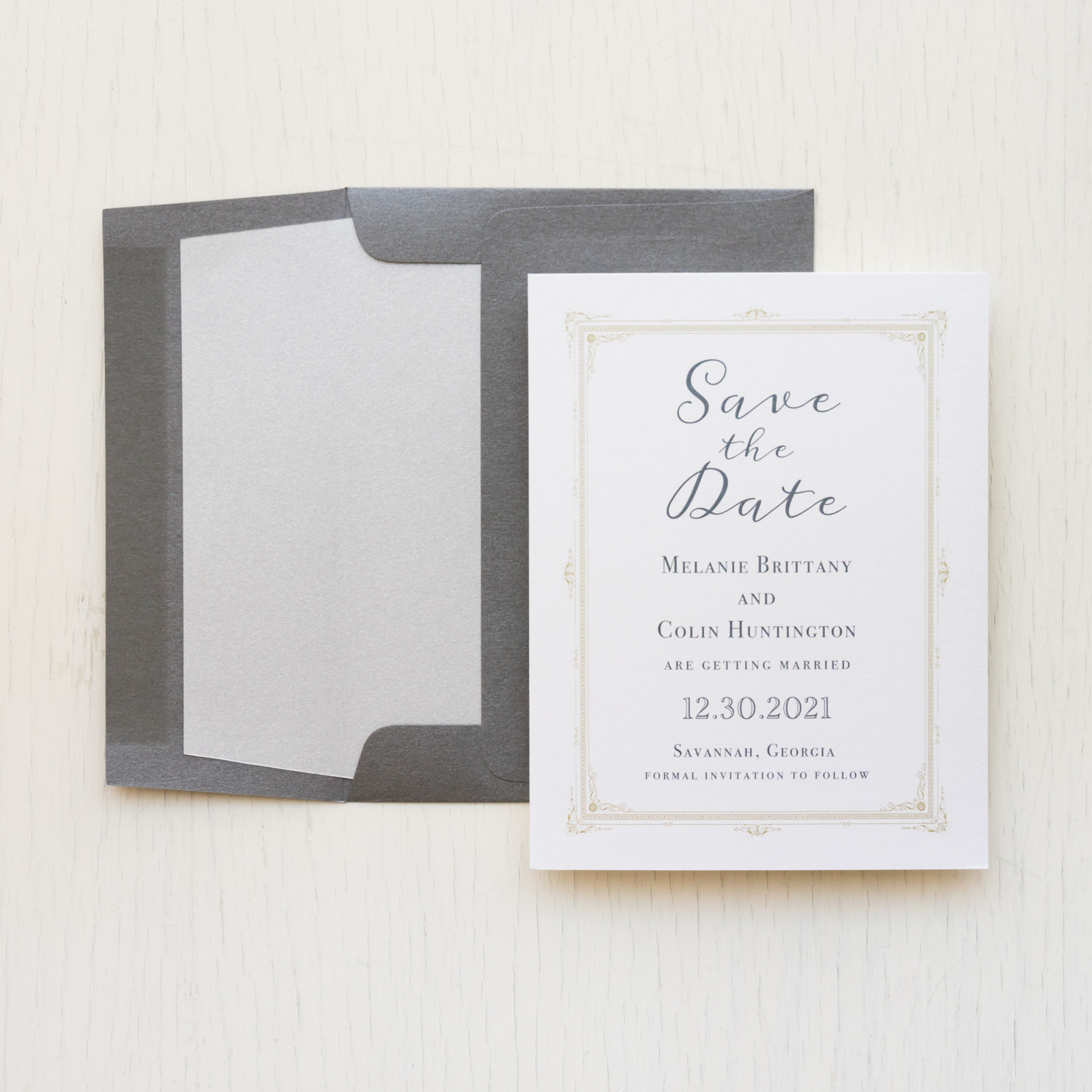 Traditional gray save the dates layered with romantic script fonts, white metallic paper and hand crafted envelope liners. Simple and classy, they’ll set a modern yet timeless tone for your sophisticated nuptials.