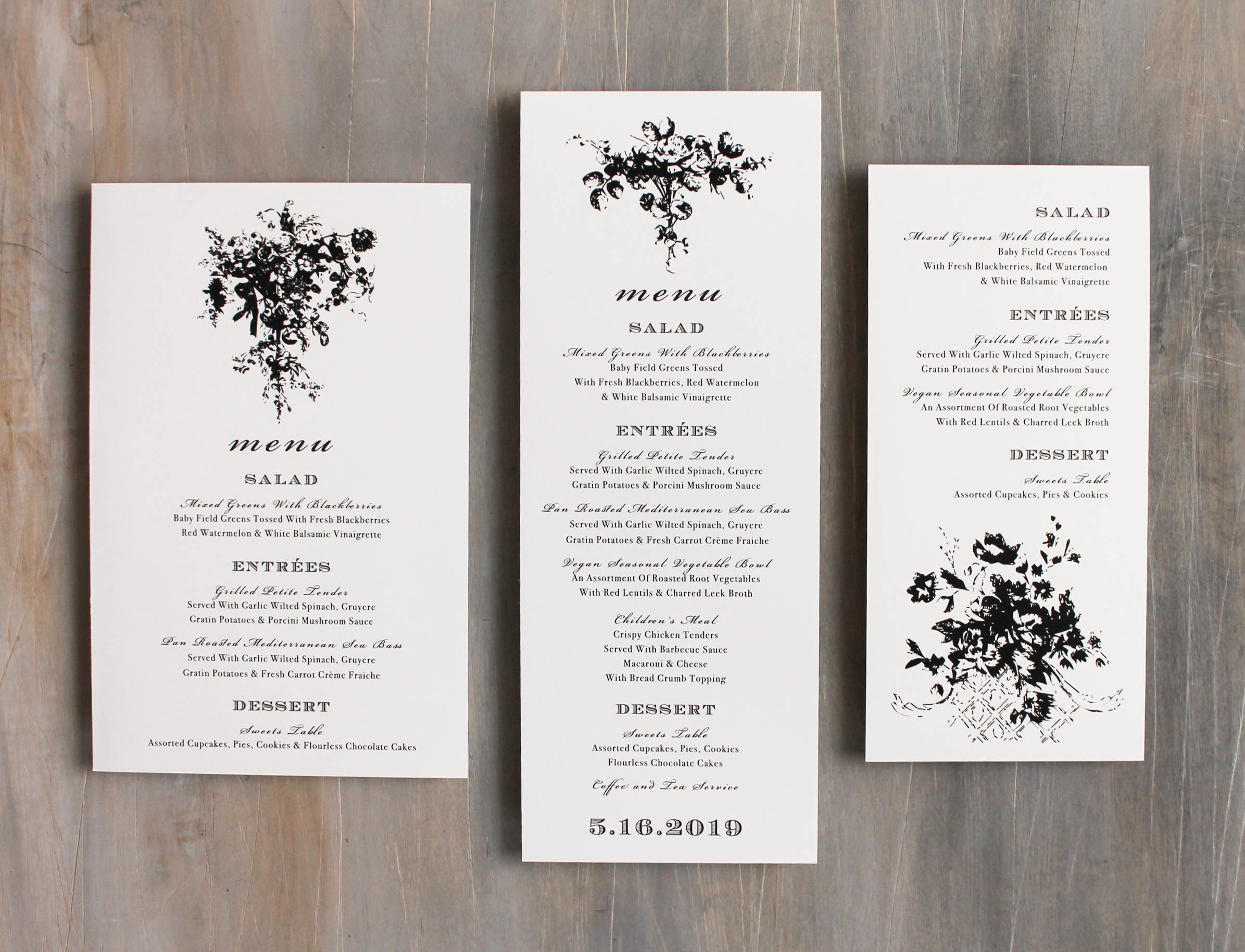 Eat, drink & be marry! White and Black Lace flat menu cards are the perfect way to let guests know what’s for dinner. Place one on each place setting to add an elegant vibe to your reception. Menus are available in 3 sizes and can be customized to match your wedding stationery.