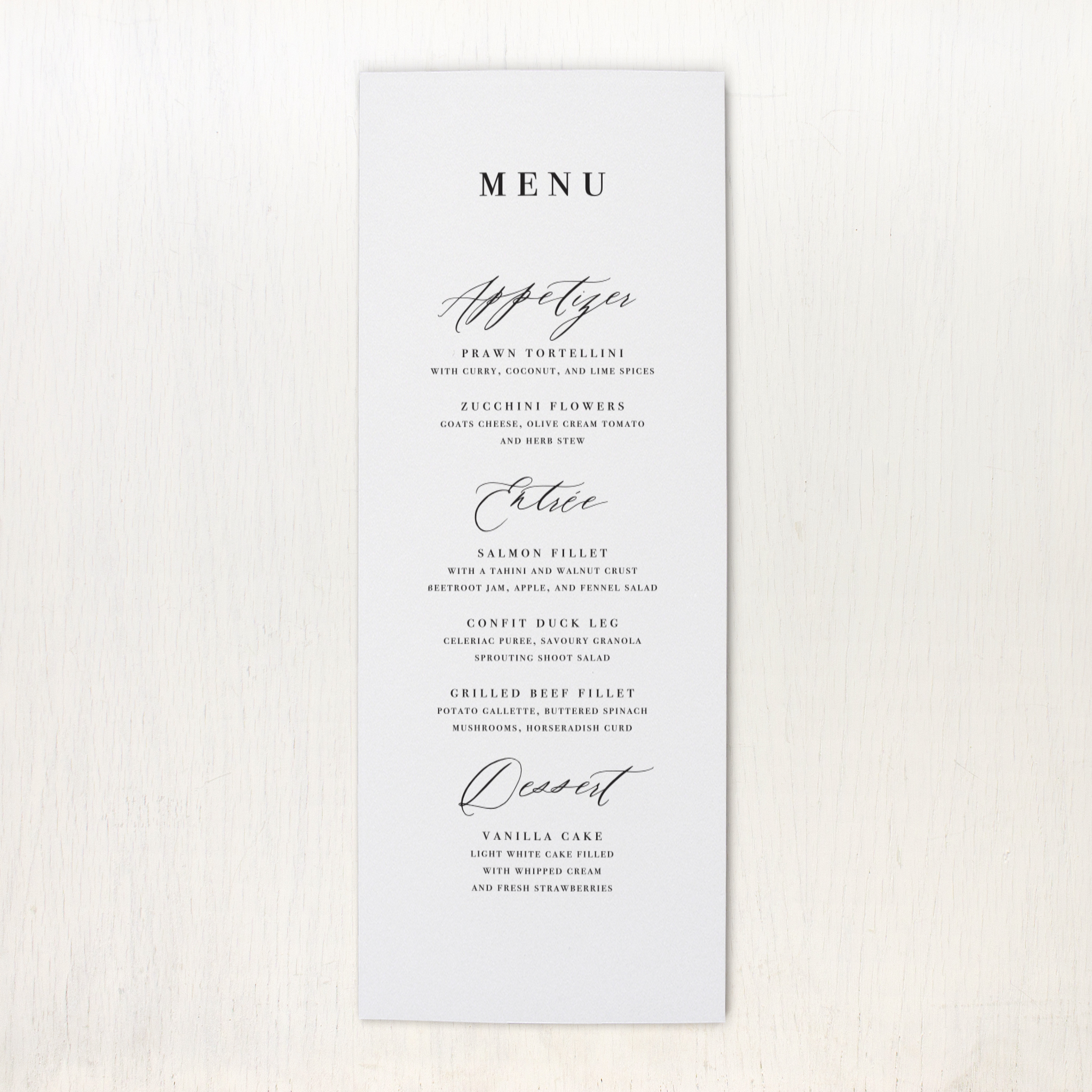 Eat, drink & be marry! Black & White Type flat menu cards are the perfect way to let guests know what’s for dinner. Place one on each place setting to add an elegant vibe to your reception. These menus are available in 3 sizes and can be customized to match your wedding stationery.