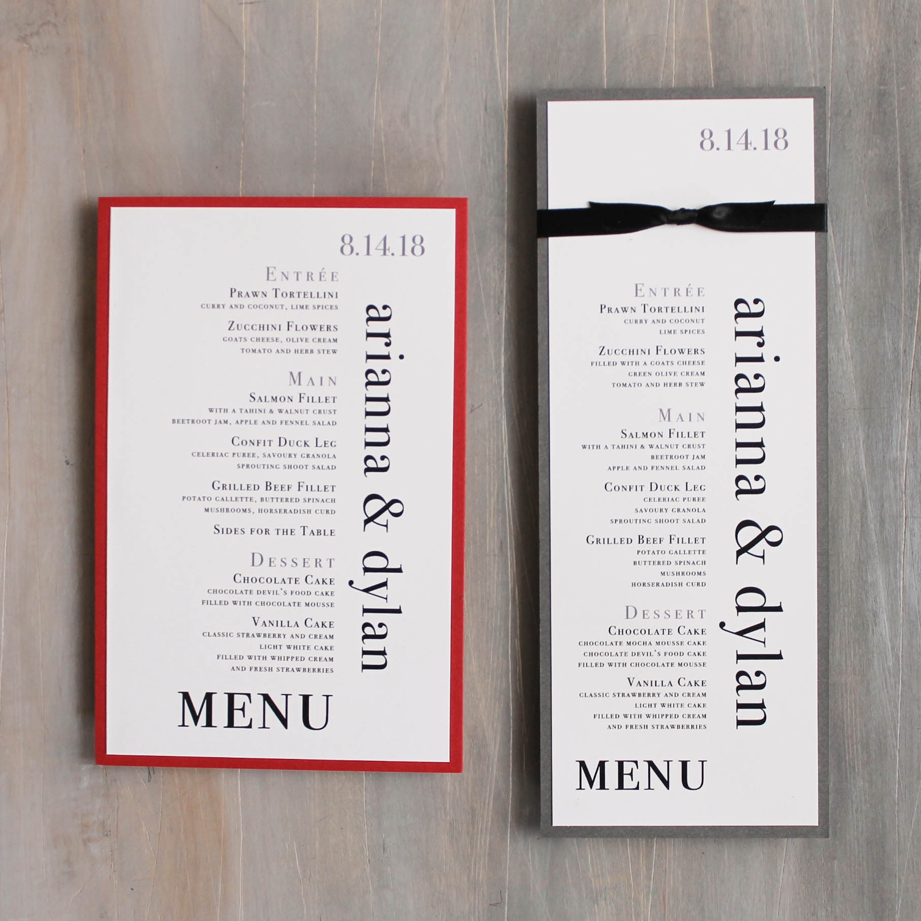 Eat, drink & be marry! Urban Elegance flat menu cards are the perfect way to let guests know what’s for dinner. Place one on each place setting to add an elegant vibe to your reception. These menus are available in 3 sizes and can be customized to match your wedding stationery.