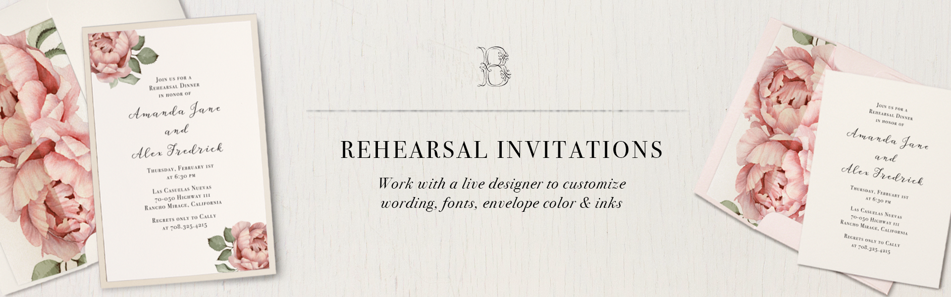Practice makes perfect! Invite family and friends to celebrate with you the night before with our rehearsal dinner invitations. These invitations come in two sizes: a small card style or a large option with an added layer or backing paper. Choose your favorite style and then work with a designer to customize your invitations to match the rest of your wedding stationery.