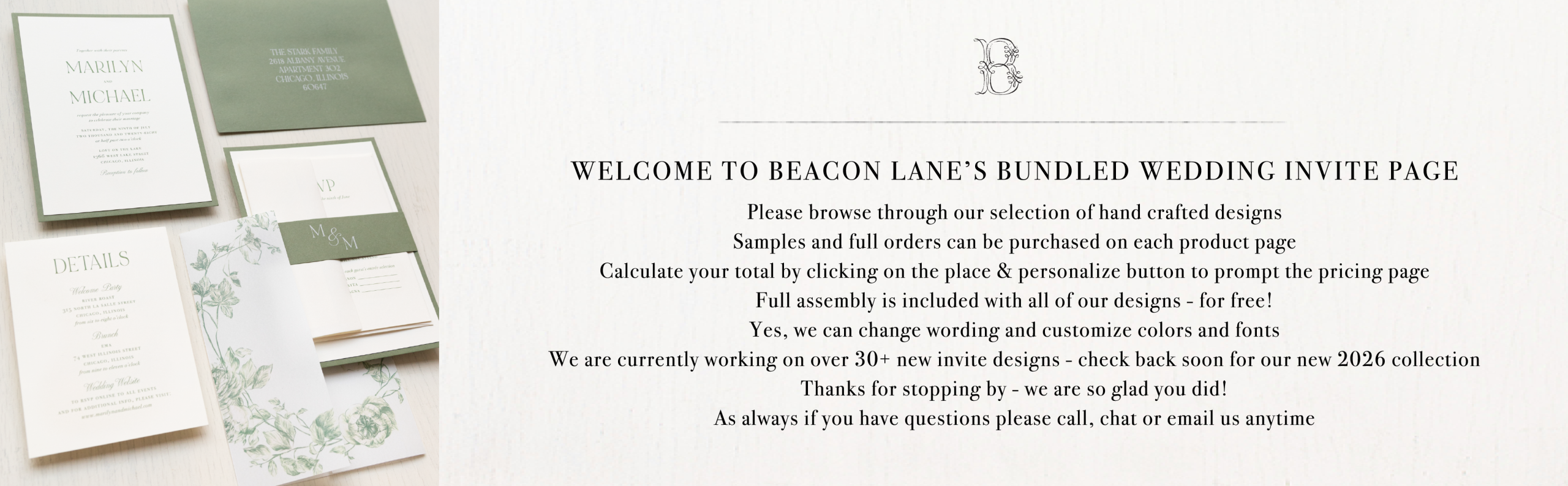 We offer a variety of customizable and affordable bundled wedding invitations. Each bundle includes an RSVP card and details card. Full assembly is included. Our watercolor and floral designs are perfect for a boho wedding. Invite your guests to your destination beach wedding with tropical, desert and pineapple styles. Having a wedding in the desert? If so, our cactus wedding invitations are a unique and fun way to set the tone. Modern or rustic mountain wedding invitations are a client favorite! We handcraft each elegant bundle using luxury materials. We offer free samples of all wedding invitations so you can see, touch and feel before ordering.