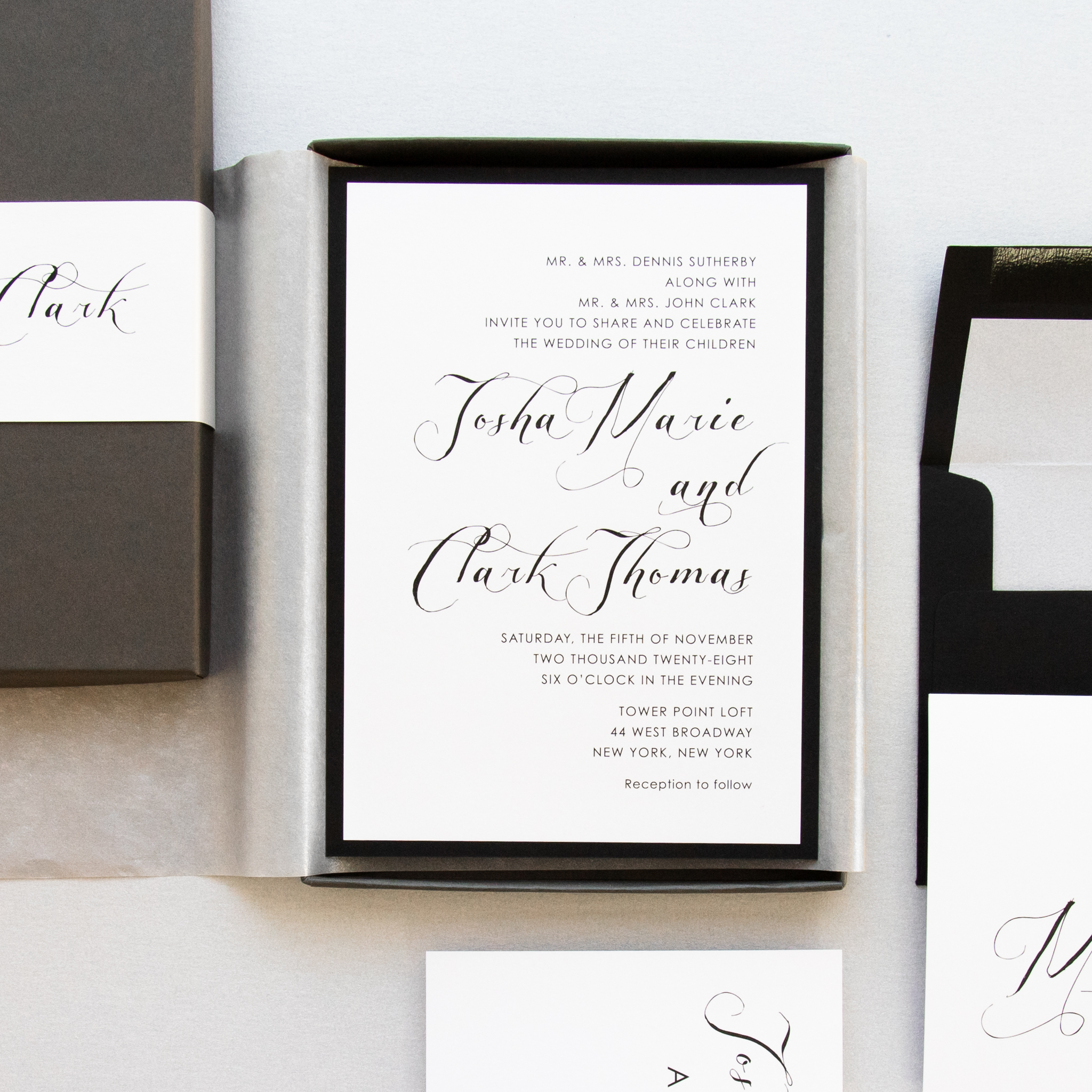 - RSVP envelope: black solid