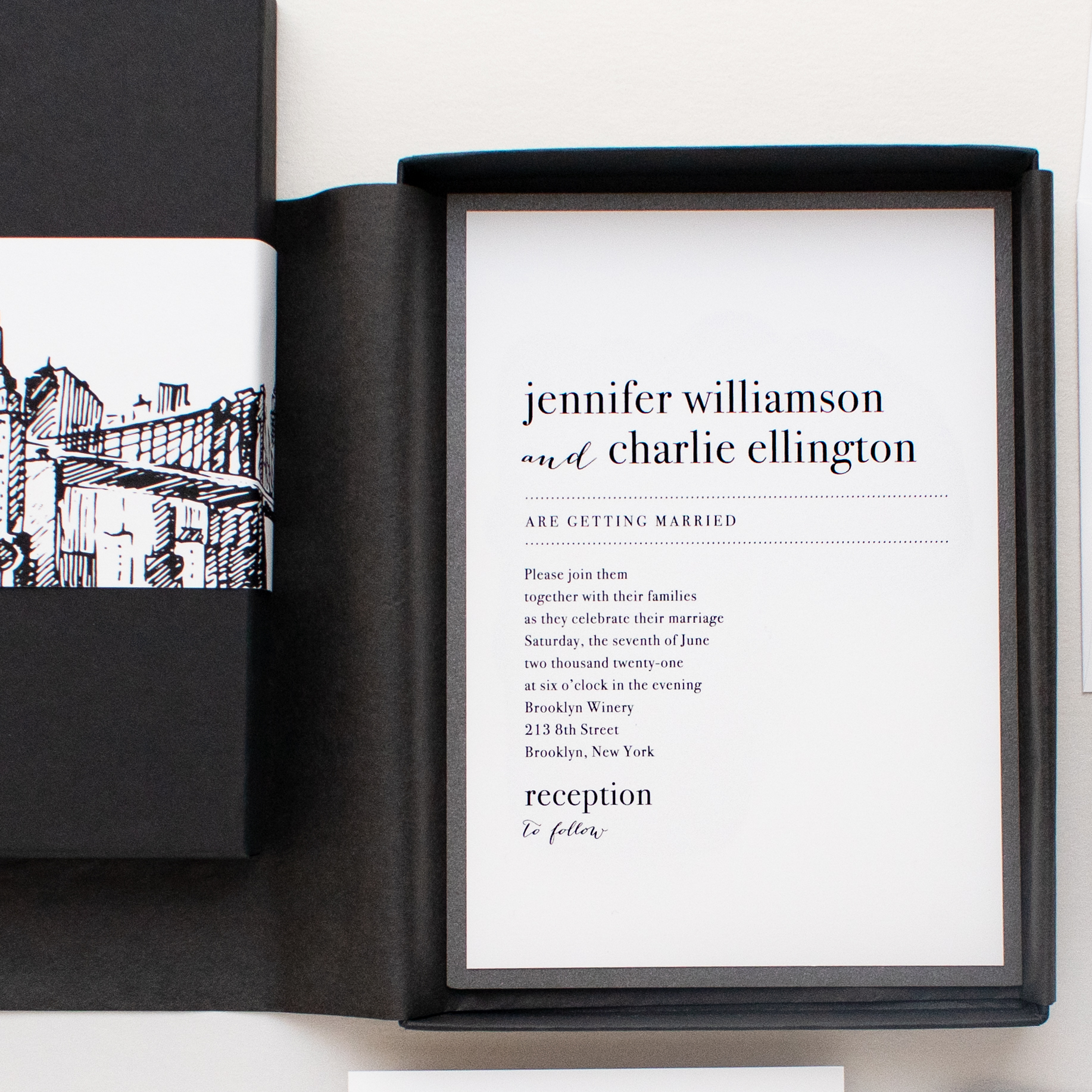 Unique New York City inspired modern skyline wedding invitations. So modern and chic! Each set features simple typographic fonts, bright white paper, gray metallic backing paper all bundled with black silk ribbon. They are then wrapped with black tissue and placed in a black box. It’s like unwrapping a gift!