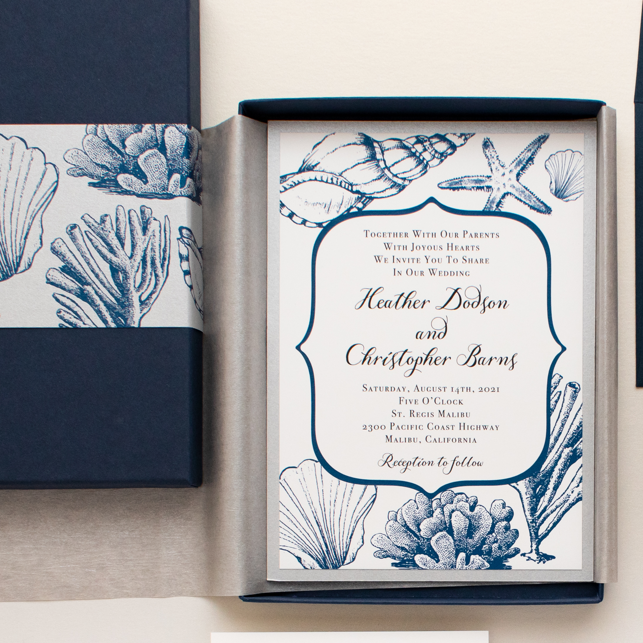 Classic and chic navy beach wedding invitations with modern shell patterns, ivory burlap, silver metallic and bright white. Simply stunning! Each set is wrapped in navy tissue paper and placed in a navy box. It’s like unwrapping a gift!