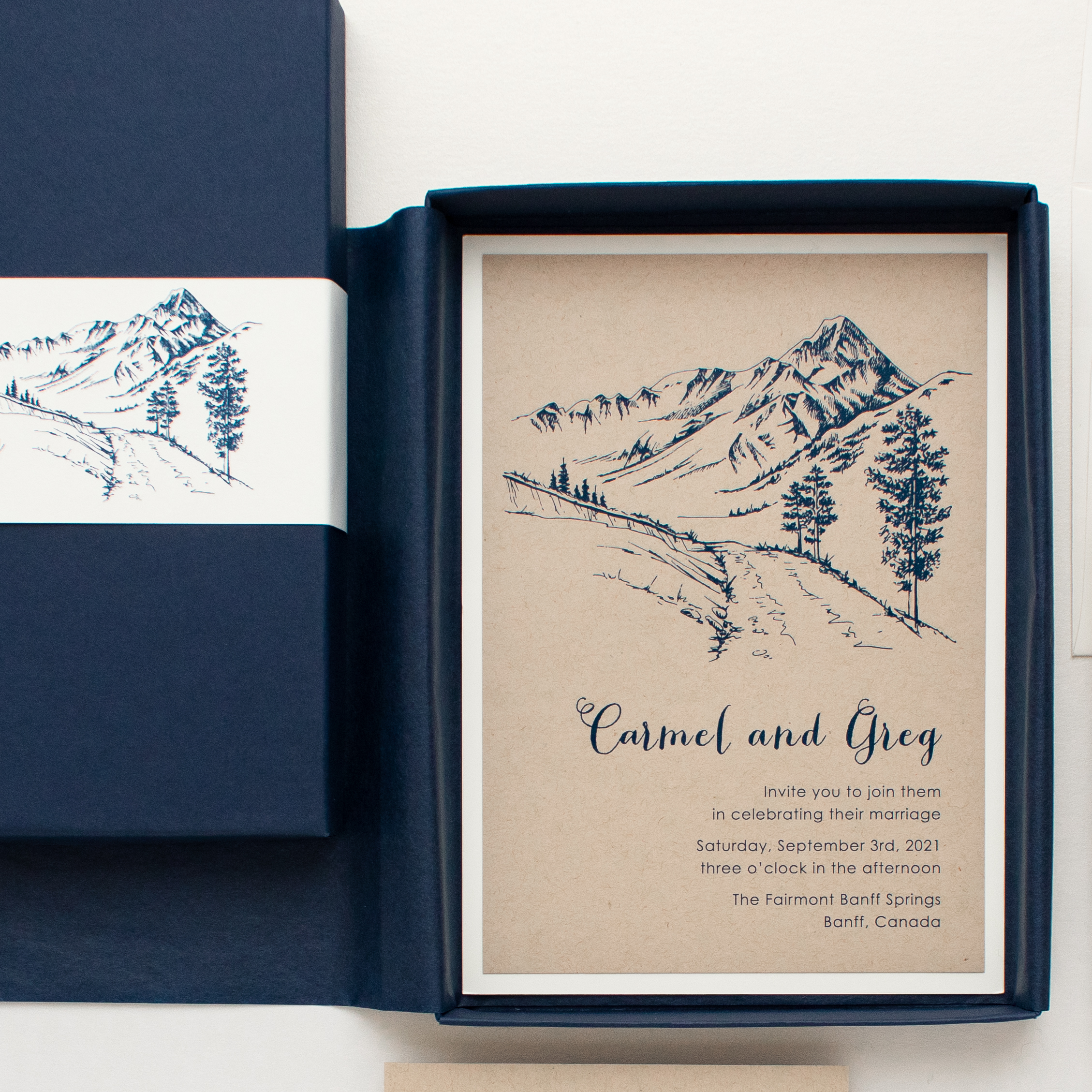 Navy Rustic Mountain wedding invitations features warm taupe paper, layered with ivory & navy and then bundled with twine. Perfect for a Colorado mountain wedding! Each set is wrapped in navy tissue paper and placed in a navy box. It’s like unwrapping a gift!