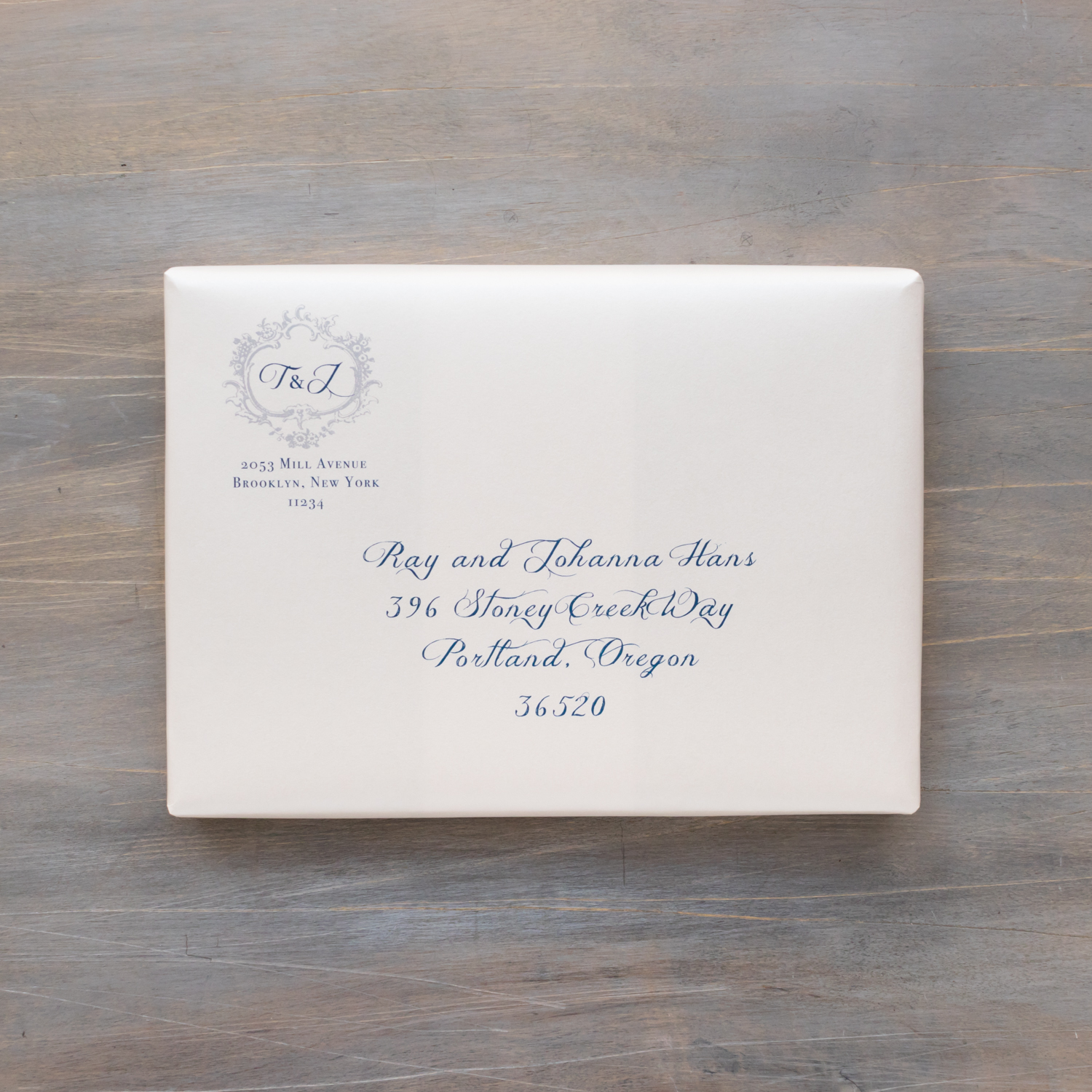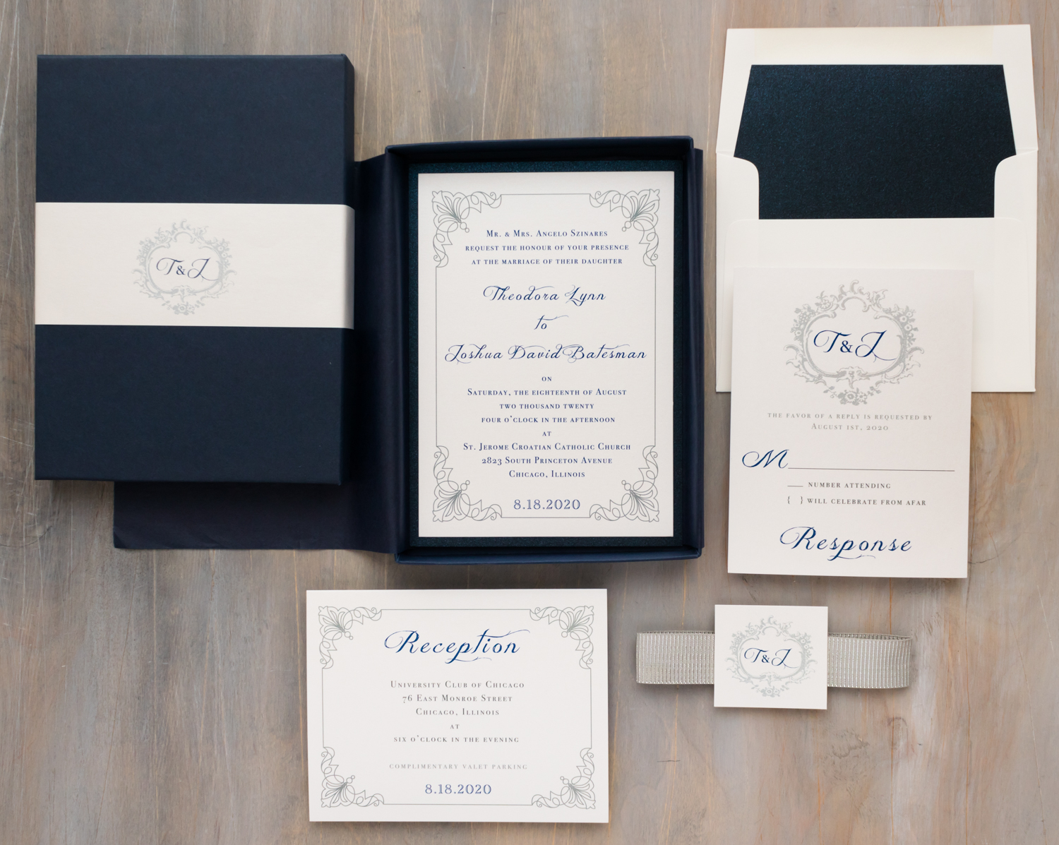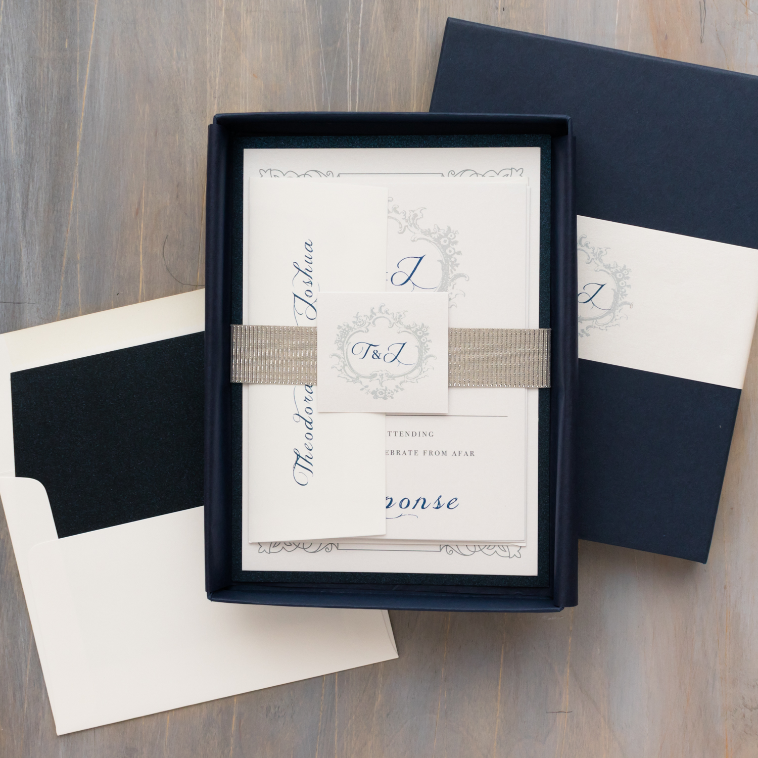 Navy & silver Classic Love wedding invitations are traditional and elegant with a glamorous flair. Navy, gray and ivory paired with decadent monograms add vintage touches to the modern wedding. Each set is bundled with a luxe silver ribbed belly band, wrapped in navy tissue paper and then placed in a navy box. It’s like unwrapping a gift!