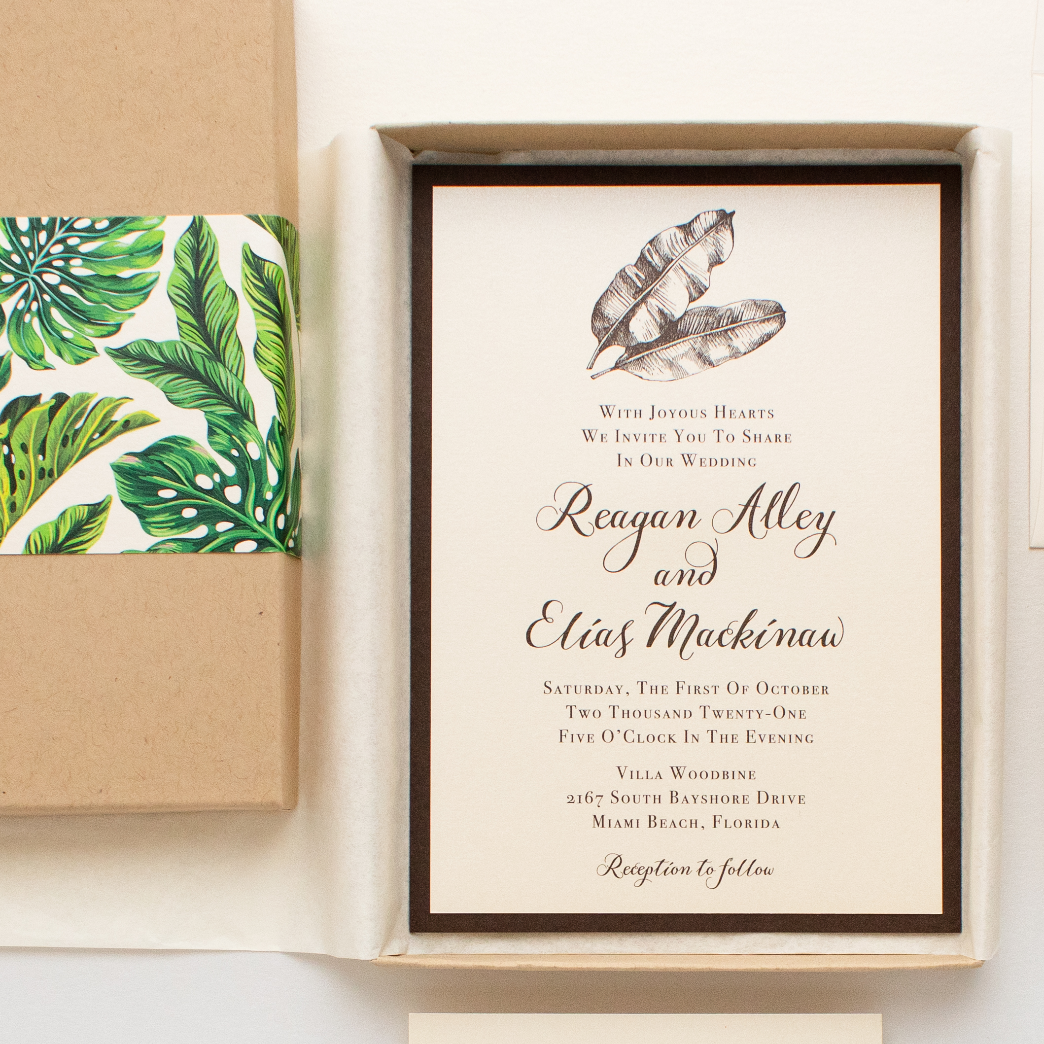 Simple Elegant Tropical wedding invitations with brown, ivory and green details. These bundled invitations combine calligraphy fonts with a classic design. Perfect if you are looking for a traditional invitation with a tropical twist! Each set is wrapped in taupe tissue paper and placed in a taupe box. It’s like unwrapping a gift!