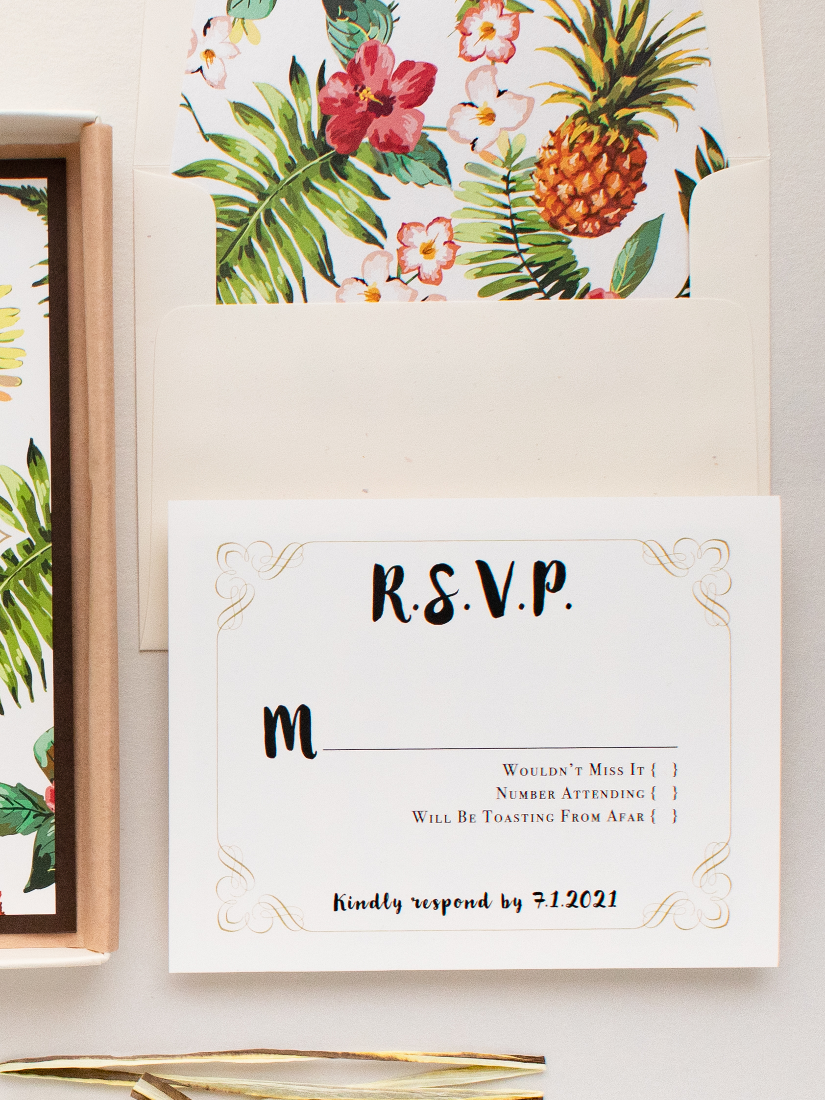 Our boxed tropical pineapple wedding invitations include full assembly, postage on the rsvp envelope, and guest addressing. Add on a matching rsvp envelope liner to complete the look.