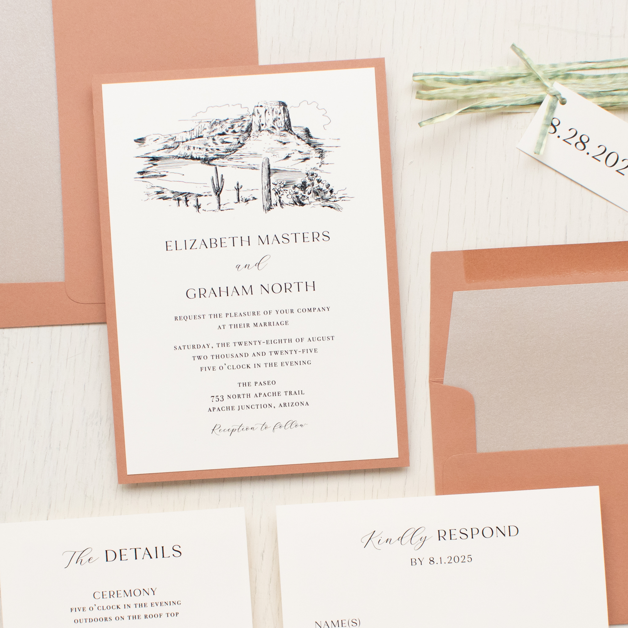 Arizona Landscape wedding invitations layered with bold fonts, soft ivory paper and terracotta envelopes. Beige metallic envelope liners and a desert illustration complete the theme. Simple and minimalist, they set a rustic tone for your Arizona wedding!
