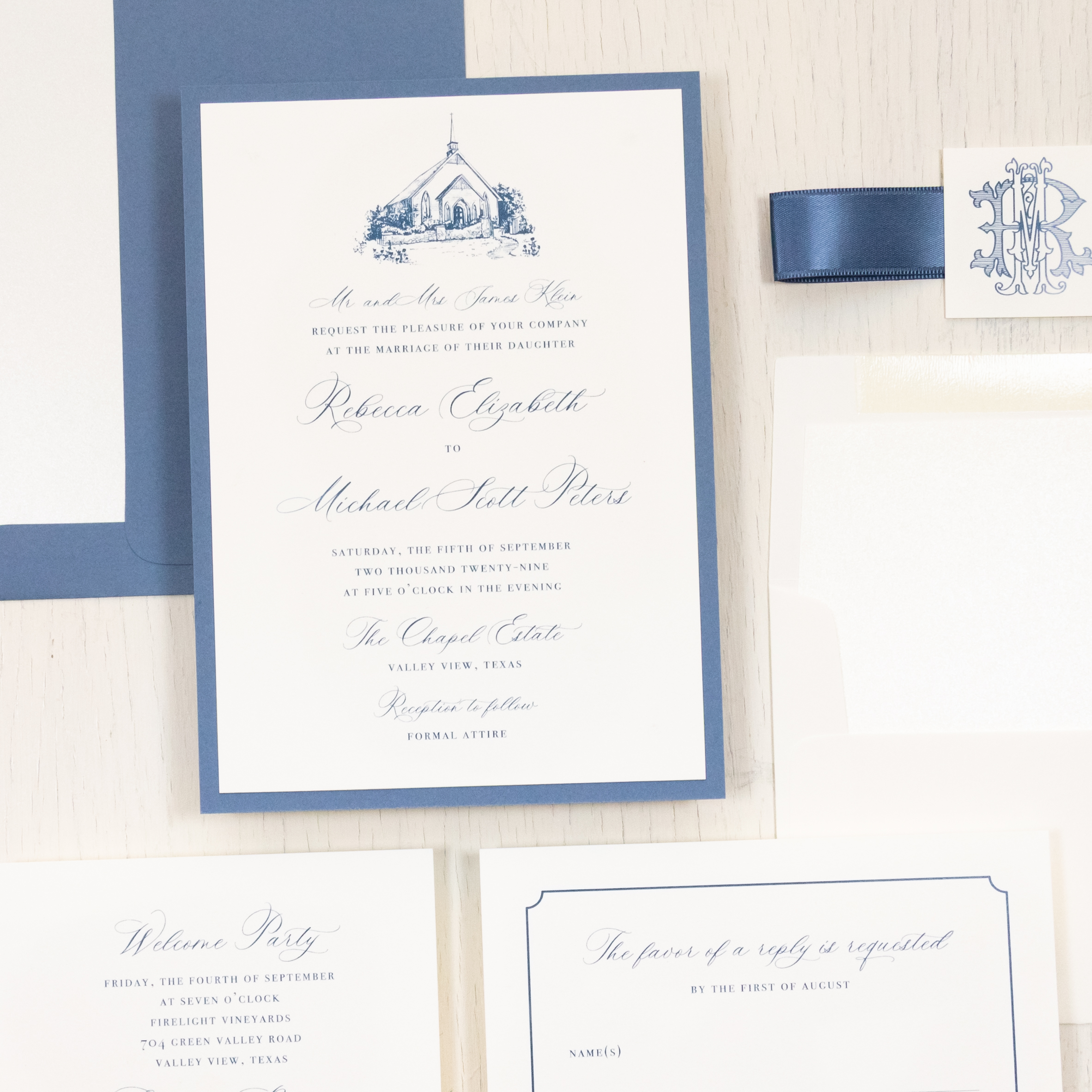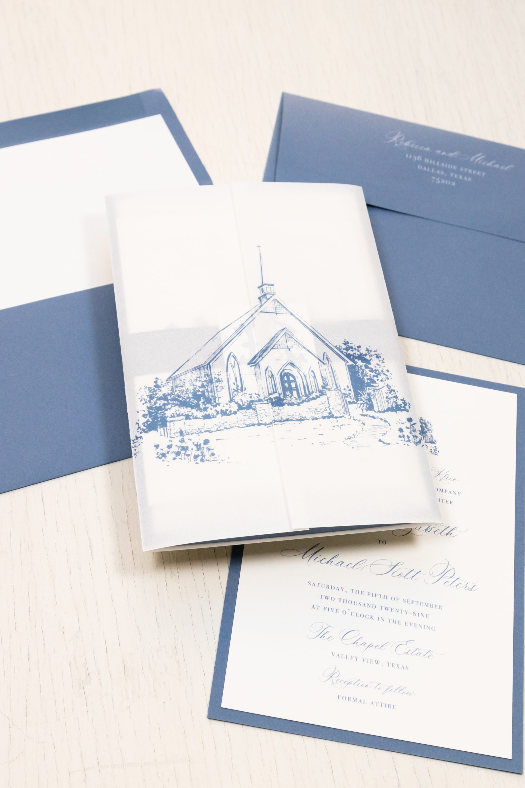 Stylish and modern Blue Bliss wedding invitations with church detail, steel blue envelopes and formal fonts. Work with a live designer to customize wording, fonts, materials, and colors until you are 100% happy!