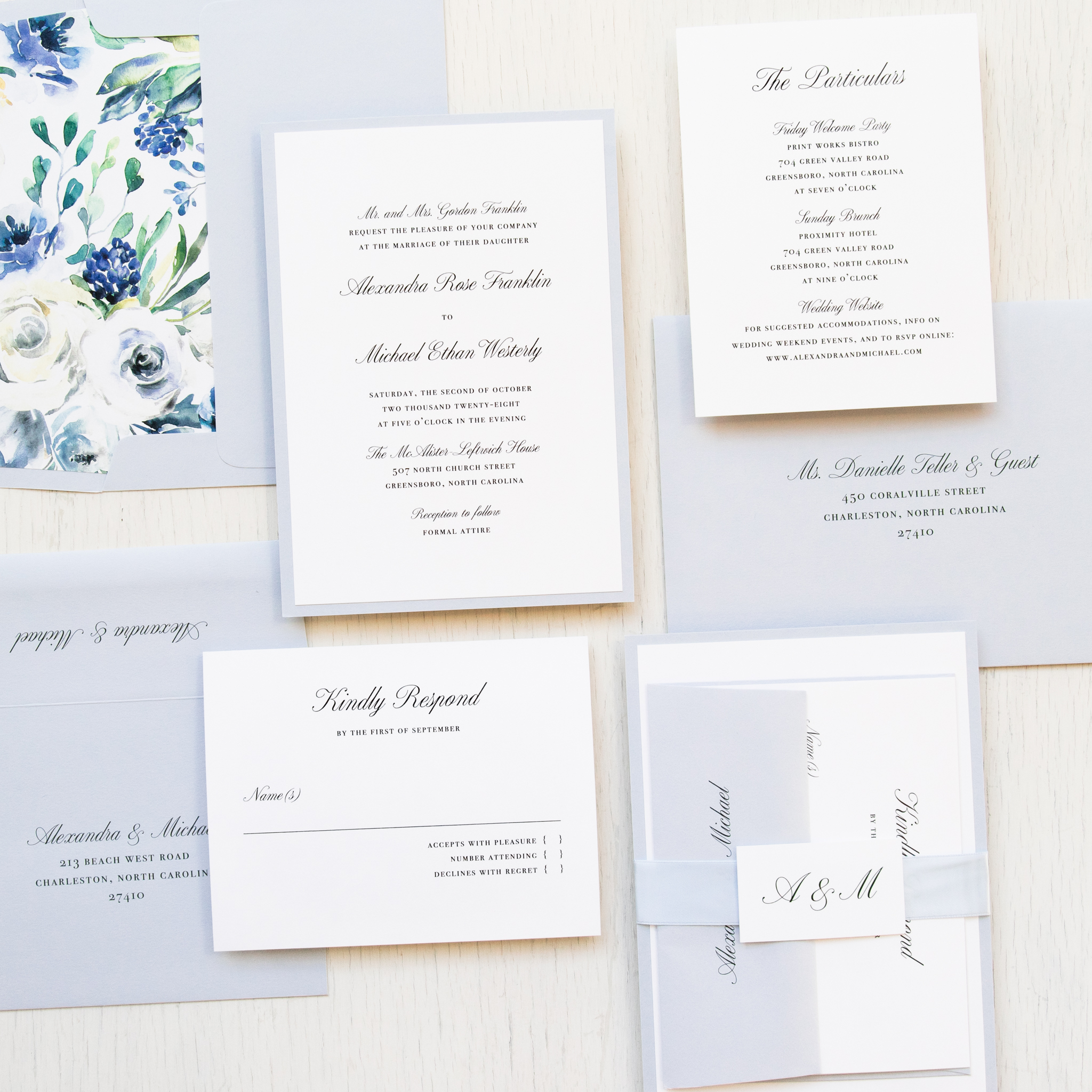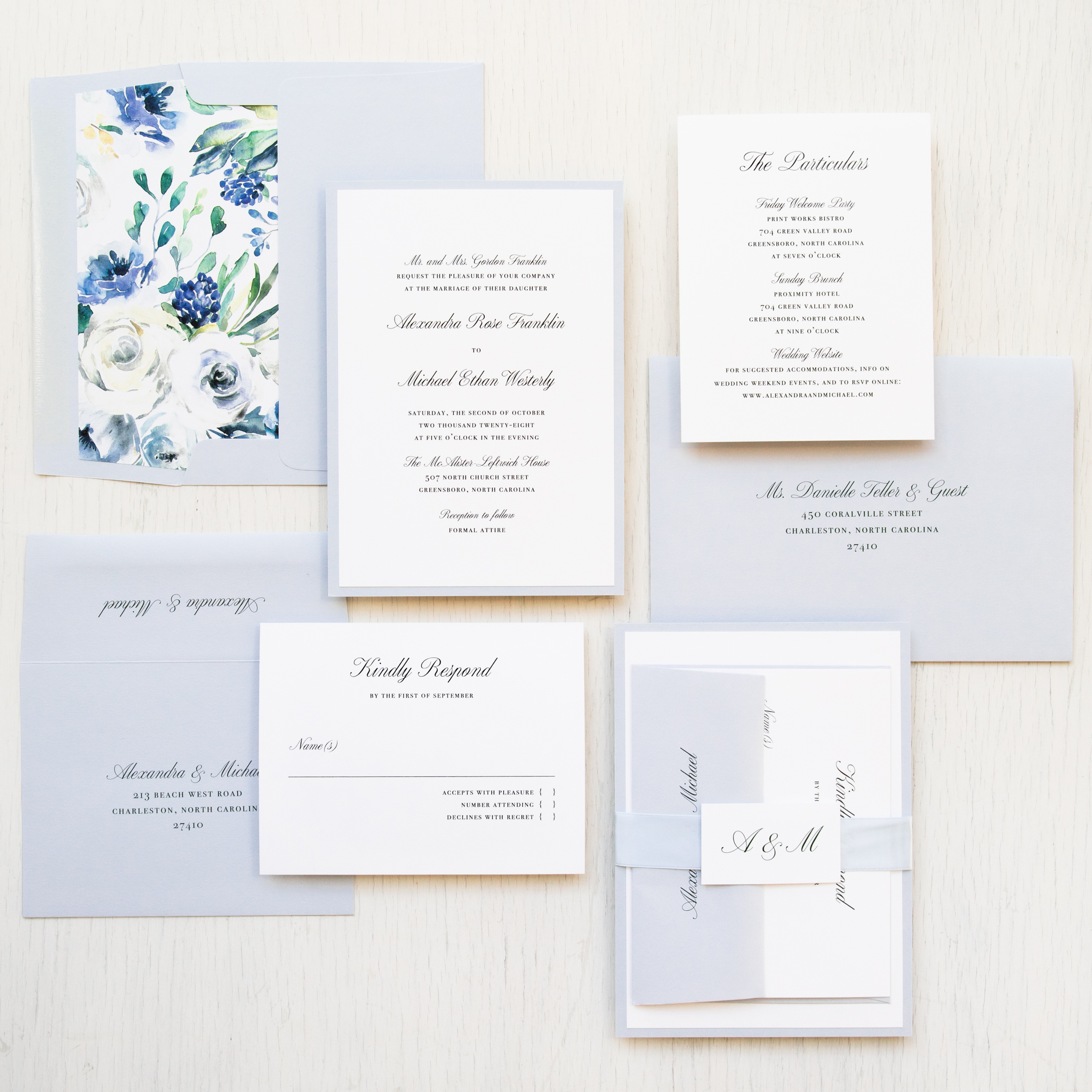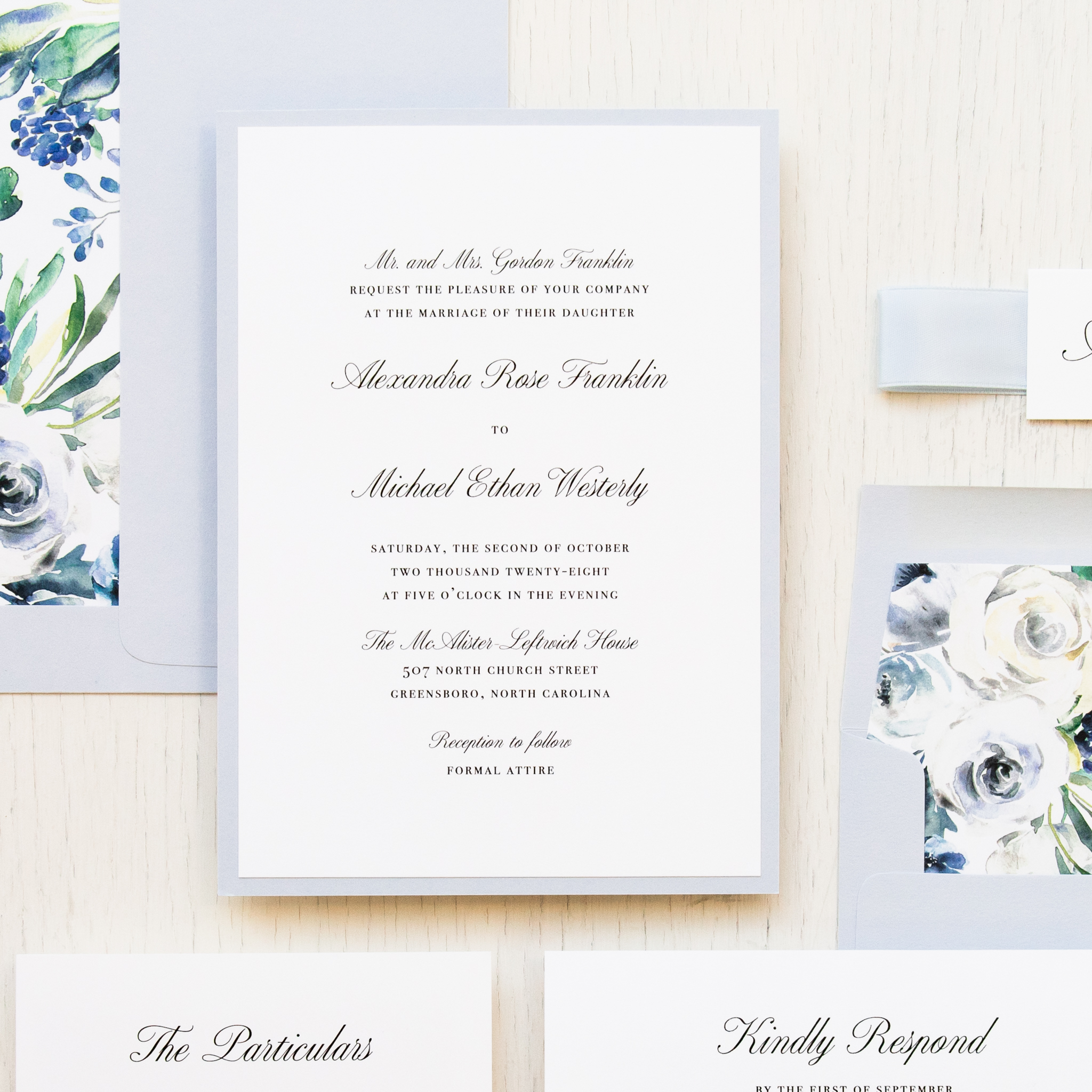 Cool Blue Floral wedding invitations layered with elegant fonts, cool blue envelopes and bright white paper. Floral envelope liners add just a touch of romance. Simple yet classy, they set an elegant tone for your garden wedding.