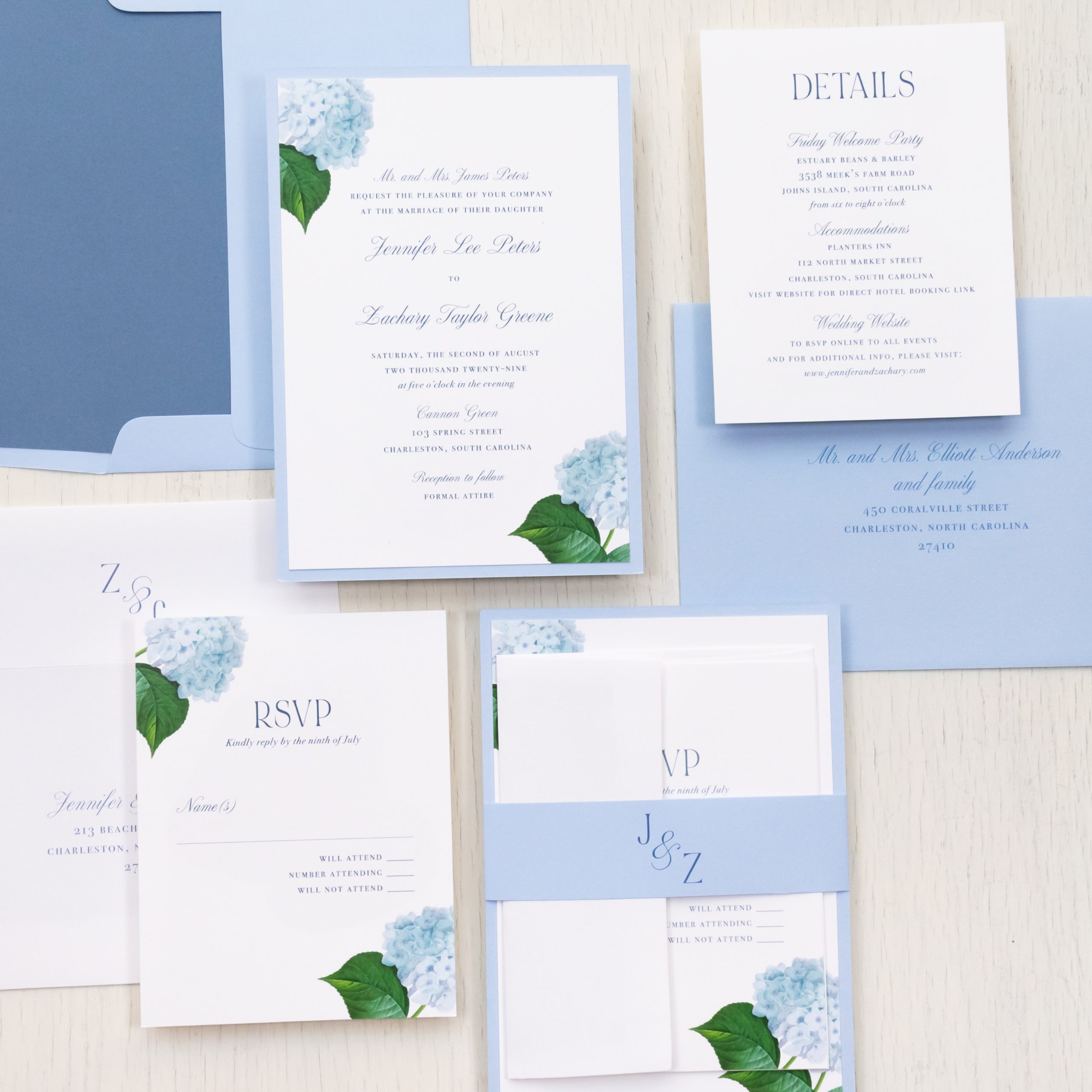 Stylish and modern Blue Hydrangea wedding invitations with a blue florals, pale blue envelopes and formal fonts. Work with a live designer to customize wording, fonts, materials, and colors until you are 100% happy!