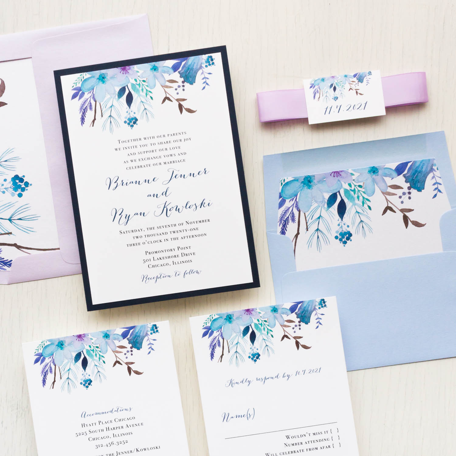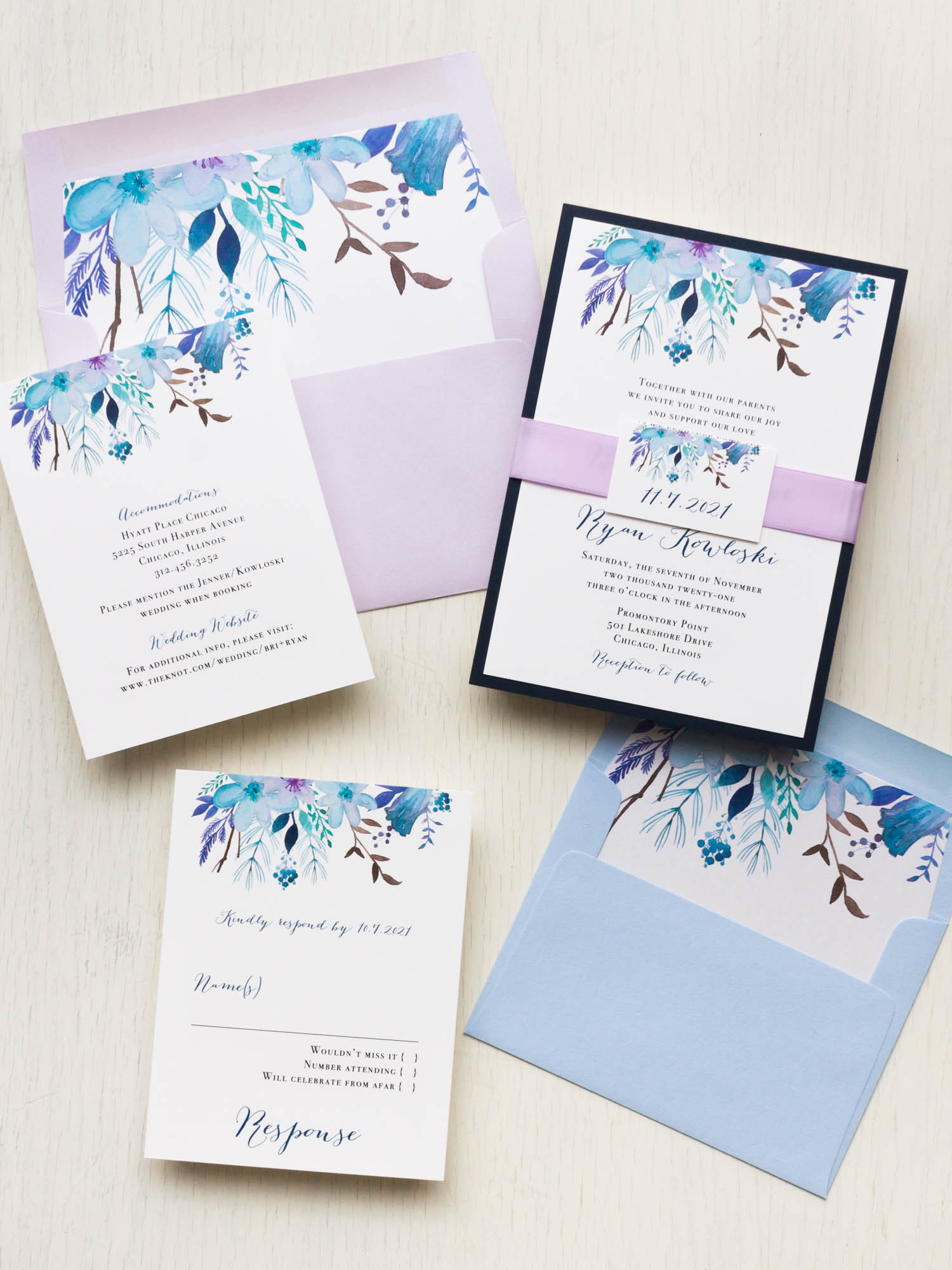 These blue and lilac wedding invitations are shown with upgrades. To calculate pricing, click on the place your order button below.