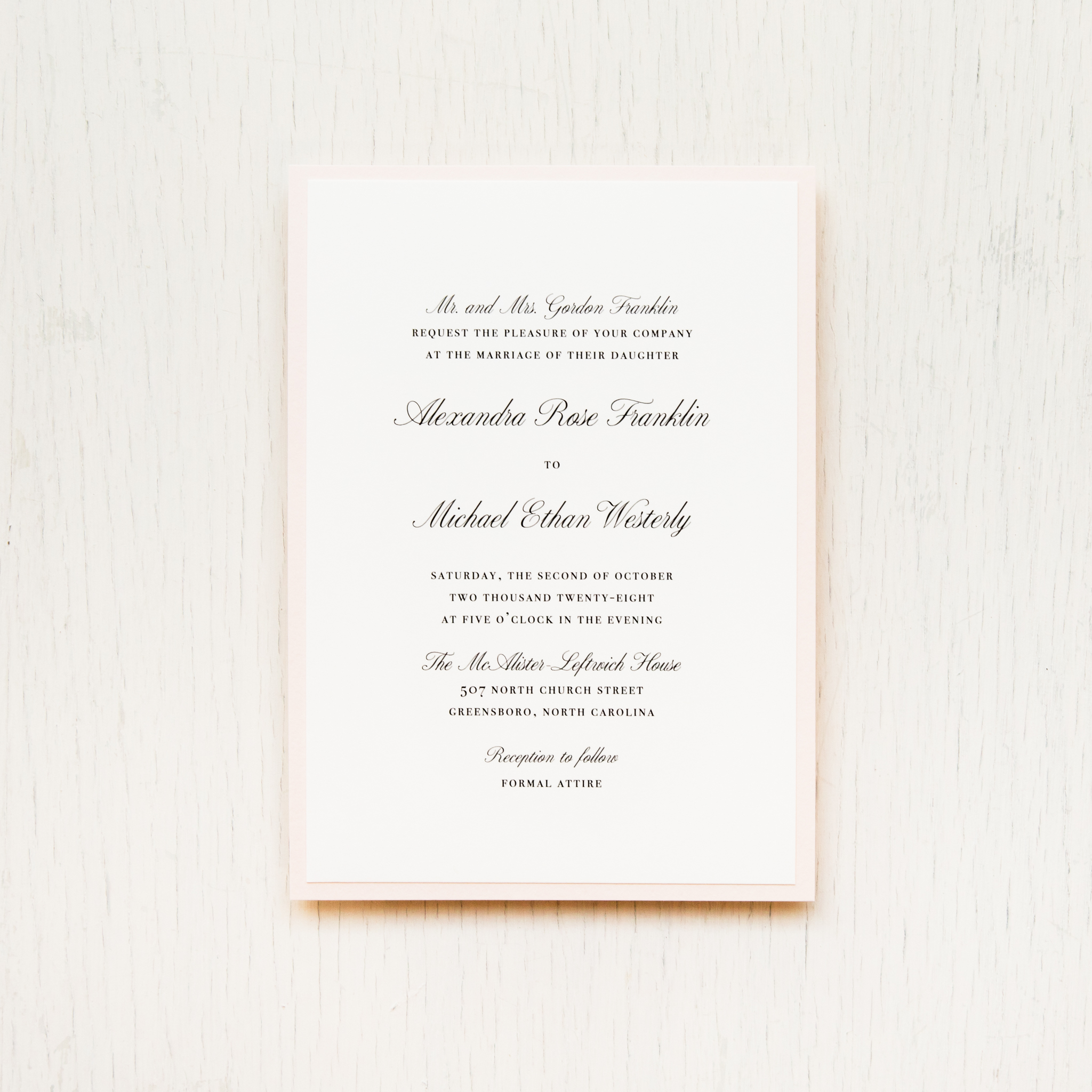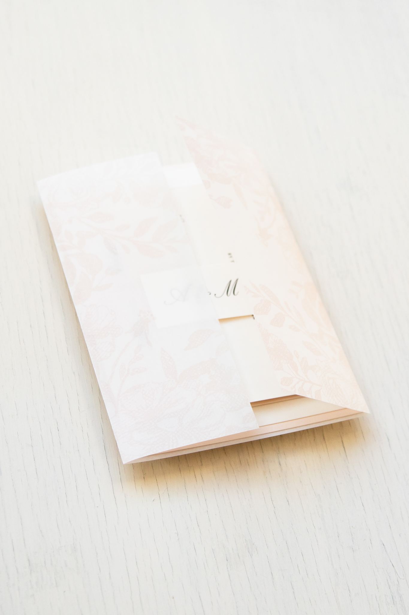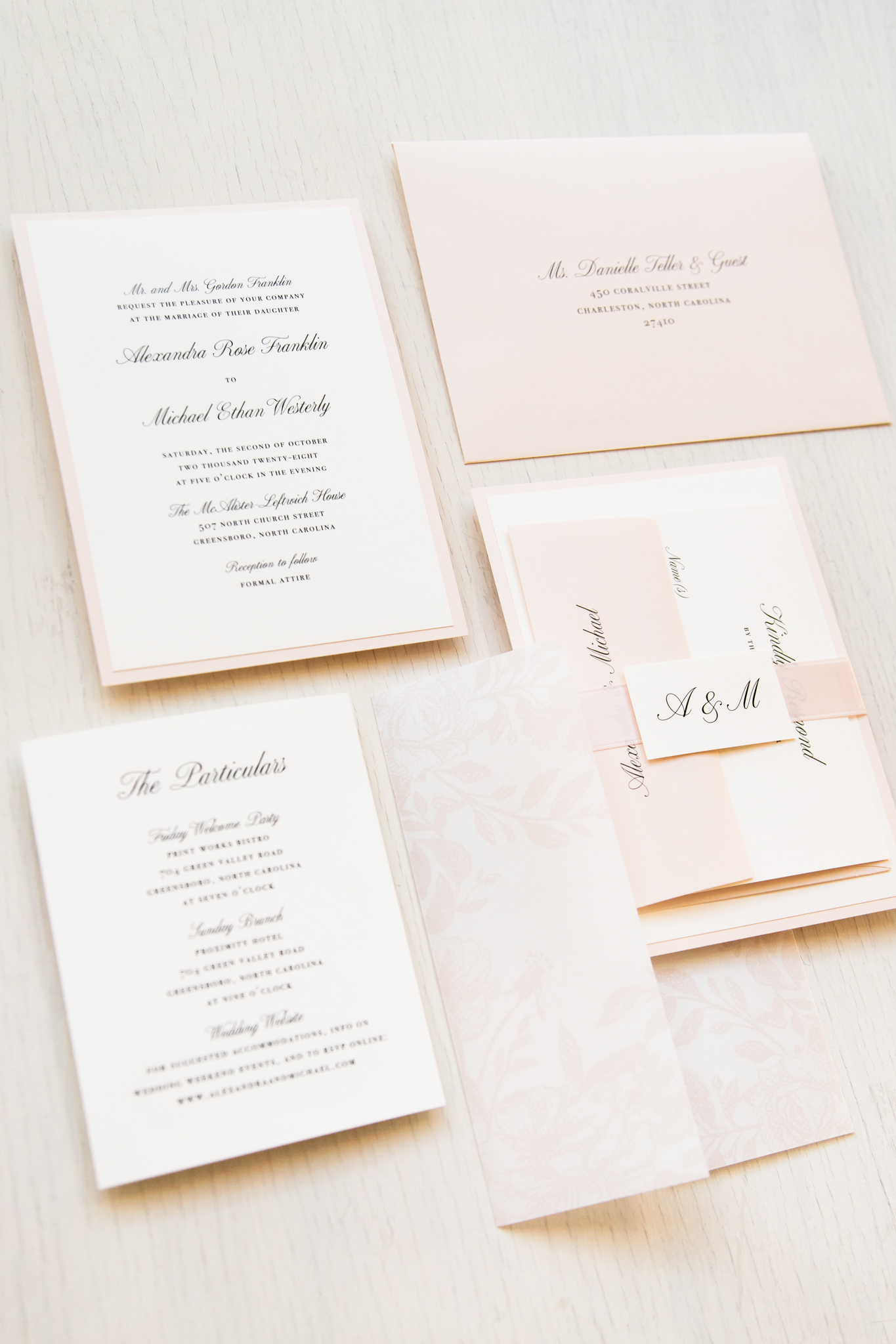 Blush Bouquet Floral wedding invitations layered with elegant fonts, blush envelopes and soft ivory paper. Floral envelope liners add just a touch of romance. Simple yet classy, they set an elegant tone for your garden wedding.