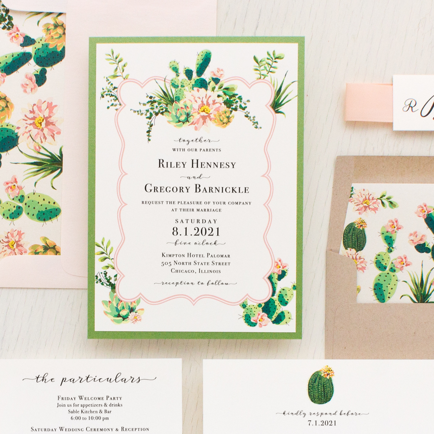Blush Cactus wedding invitations with blush, green, taupe and ivory. A mix of elegant and easy to read script and serif fonts creates a modern romantic and refined look, perfect for your desert wedding!