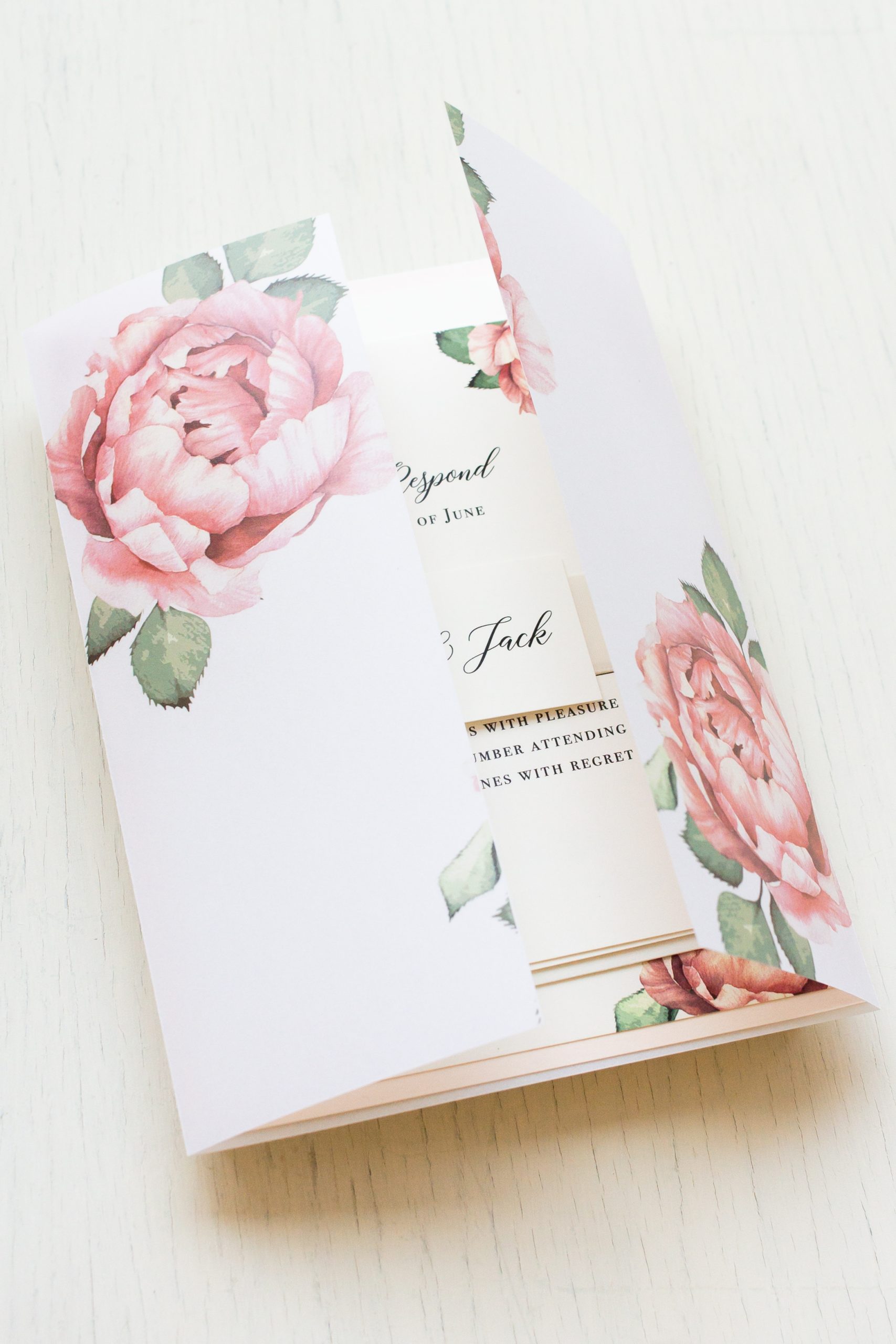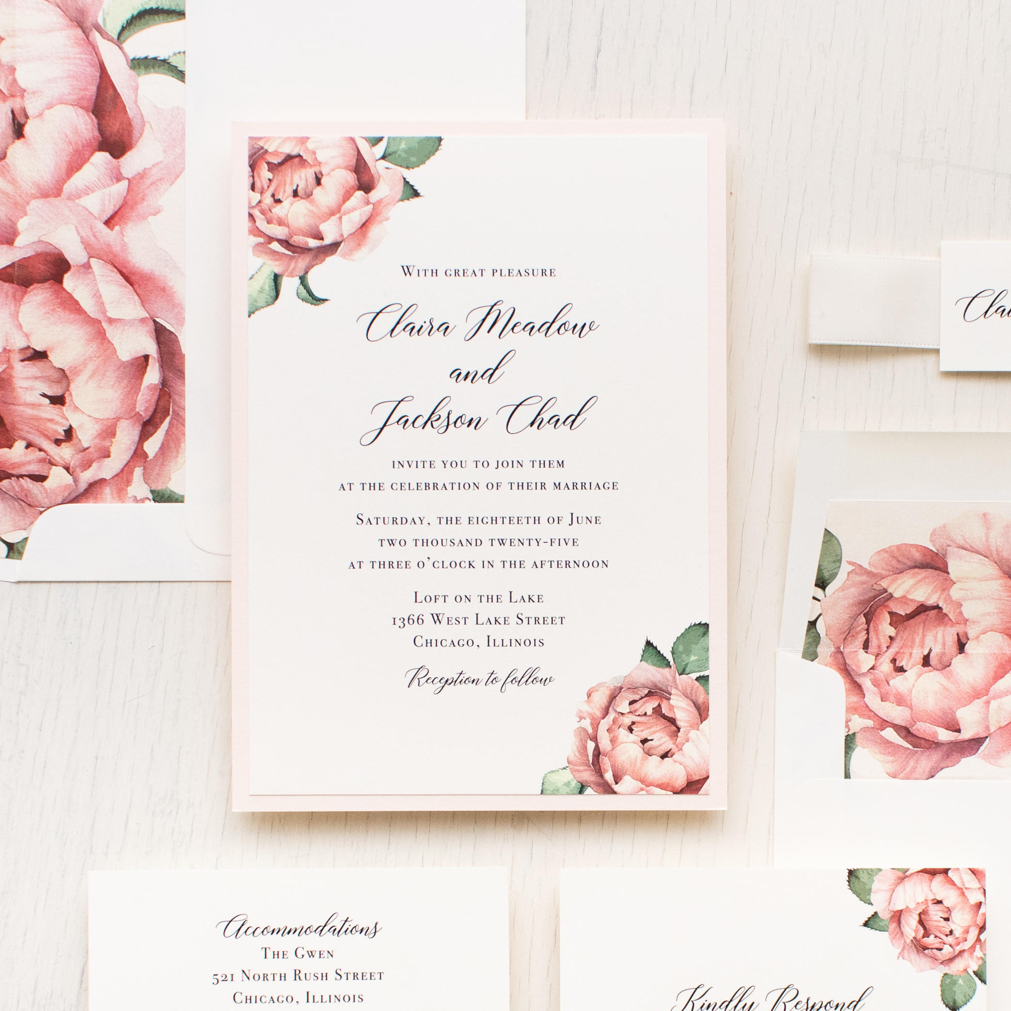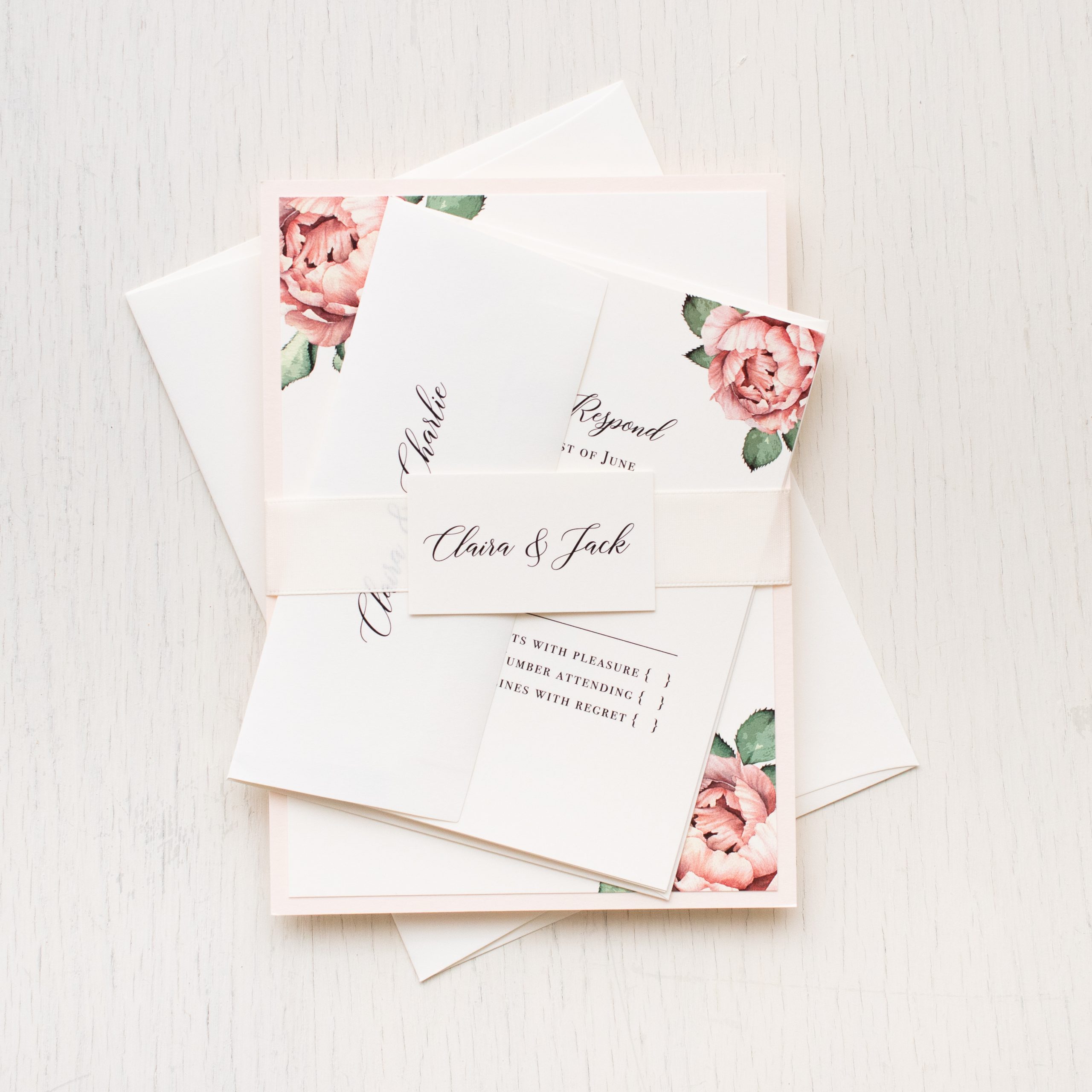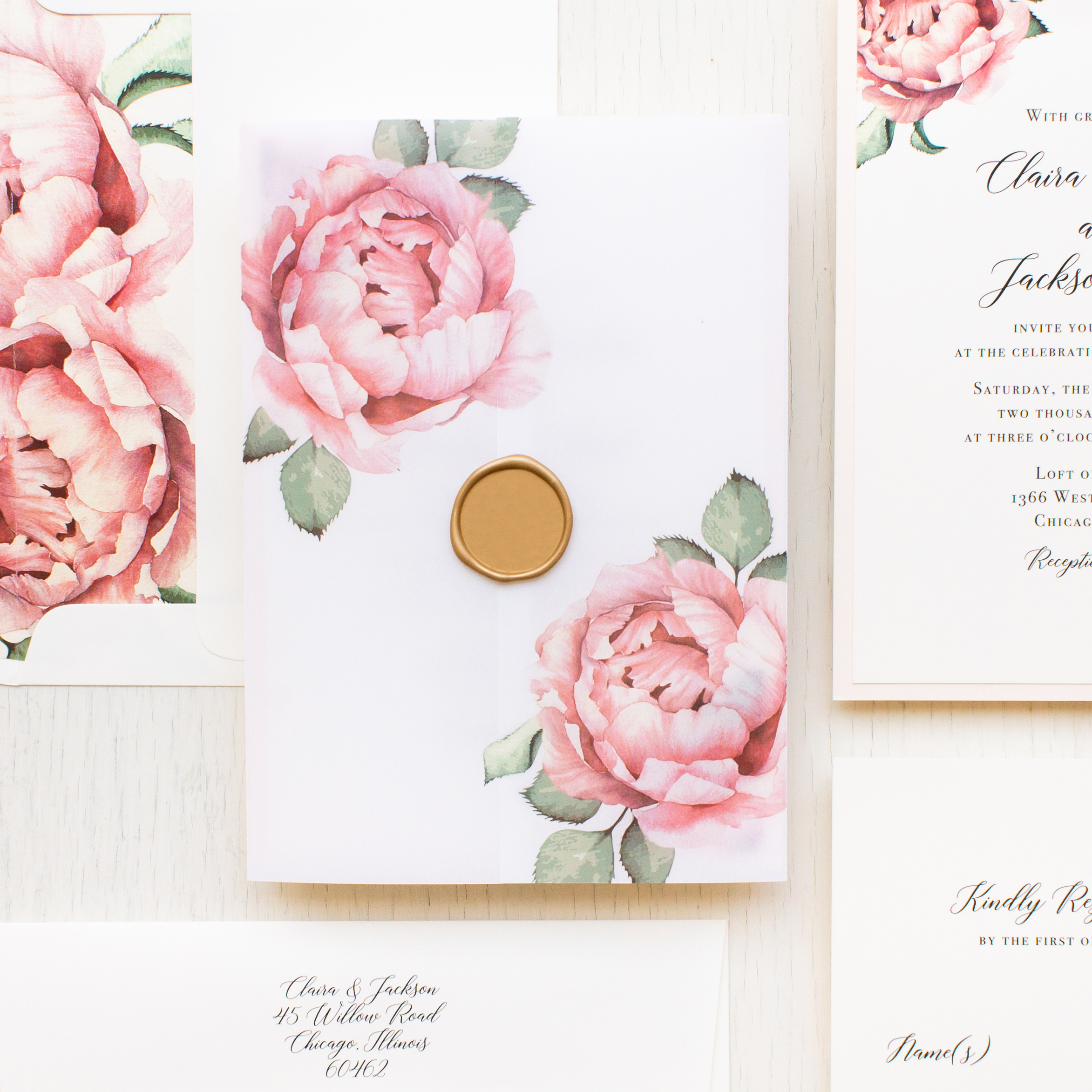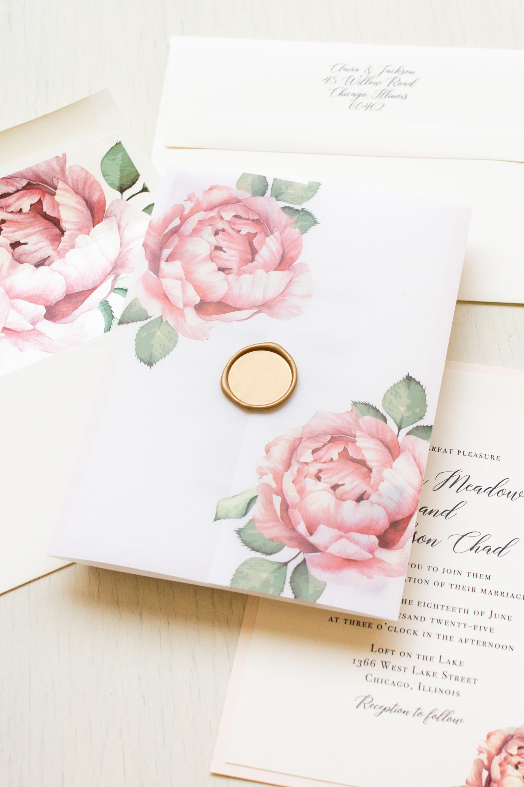 Blush floral vellum wedding invitations layered with romantic script fonts and vintage floral envelope liners. Each set is bundled with an ivory satin ribbon and personalized paper tag.
