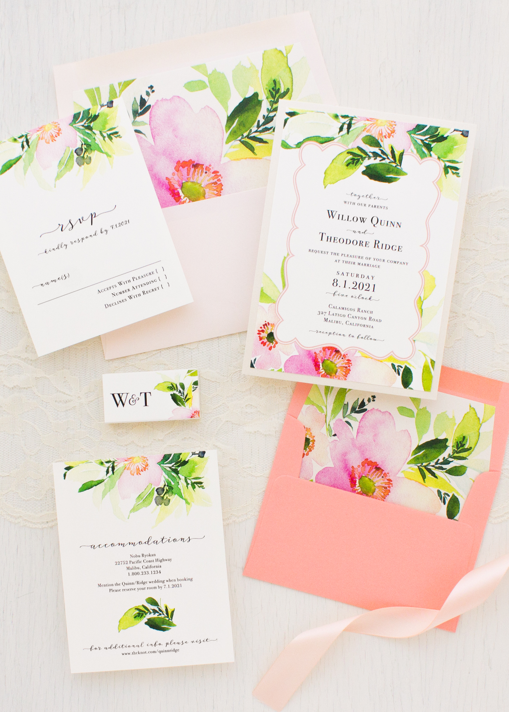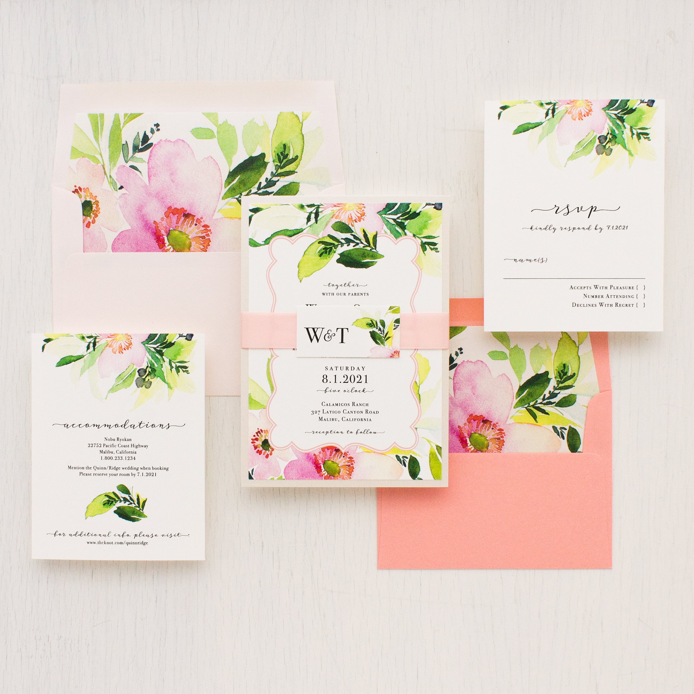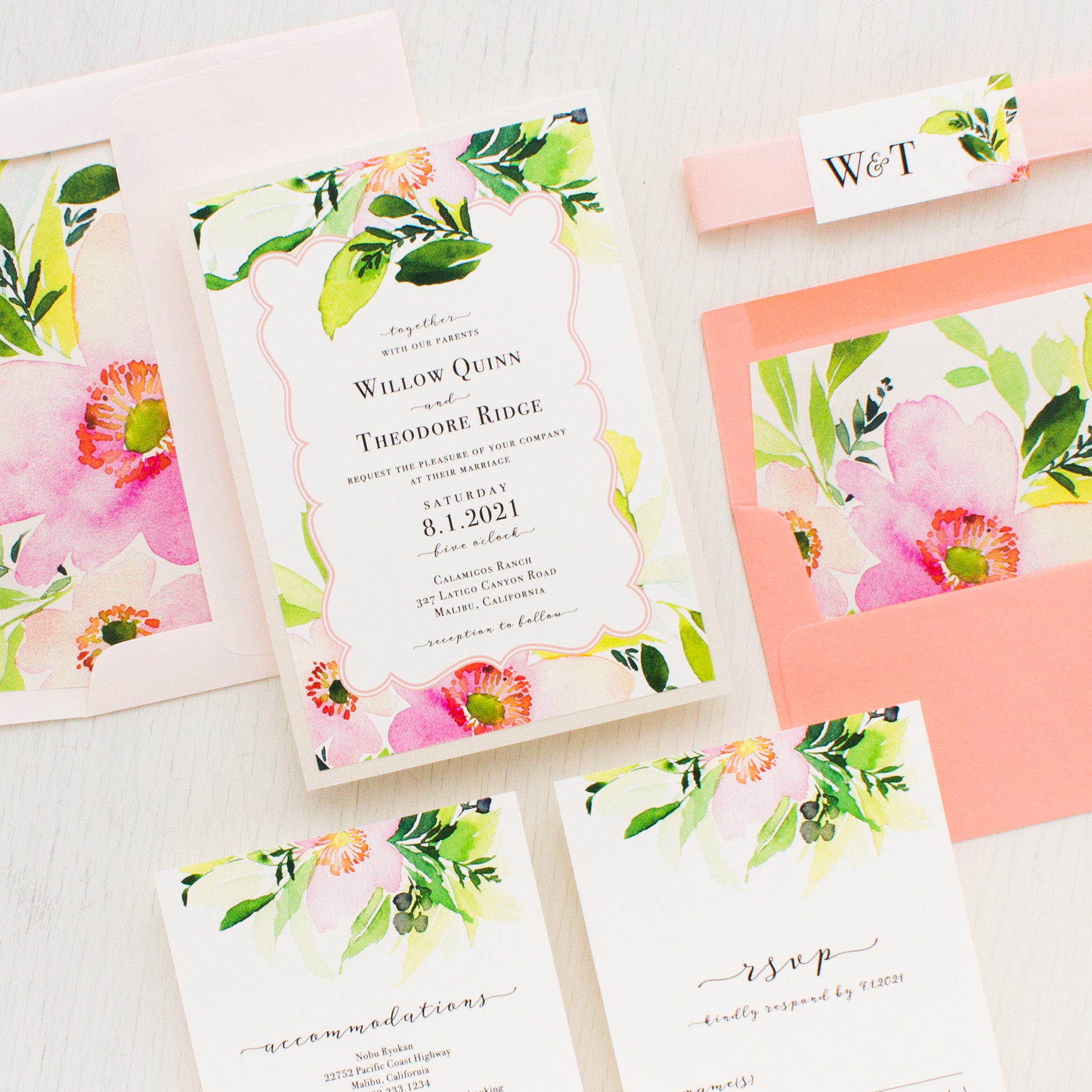 Bright coral wedding invitations with blush peach, coral, green and champagne. A mix of elegant and easy to read script and serif fonts creates a modern romantic and refined look, perfect for a wedding styled in any season.