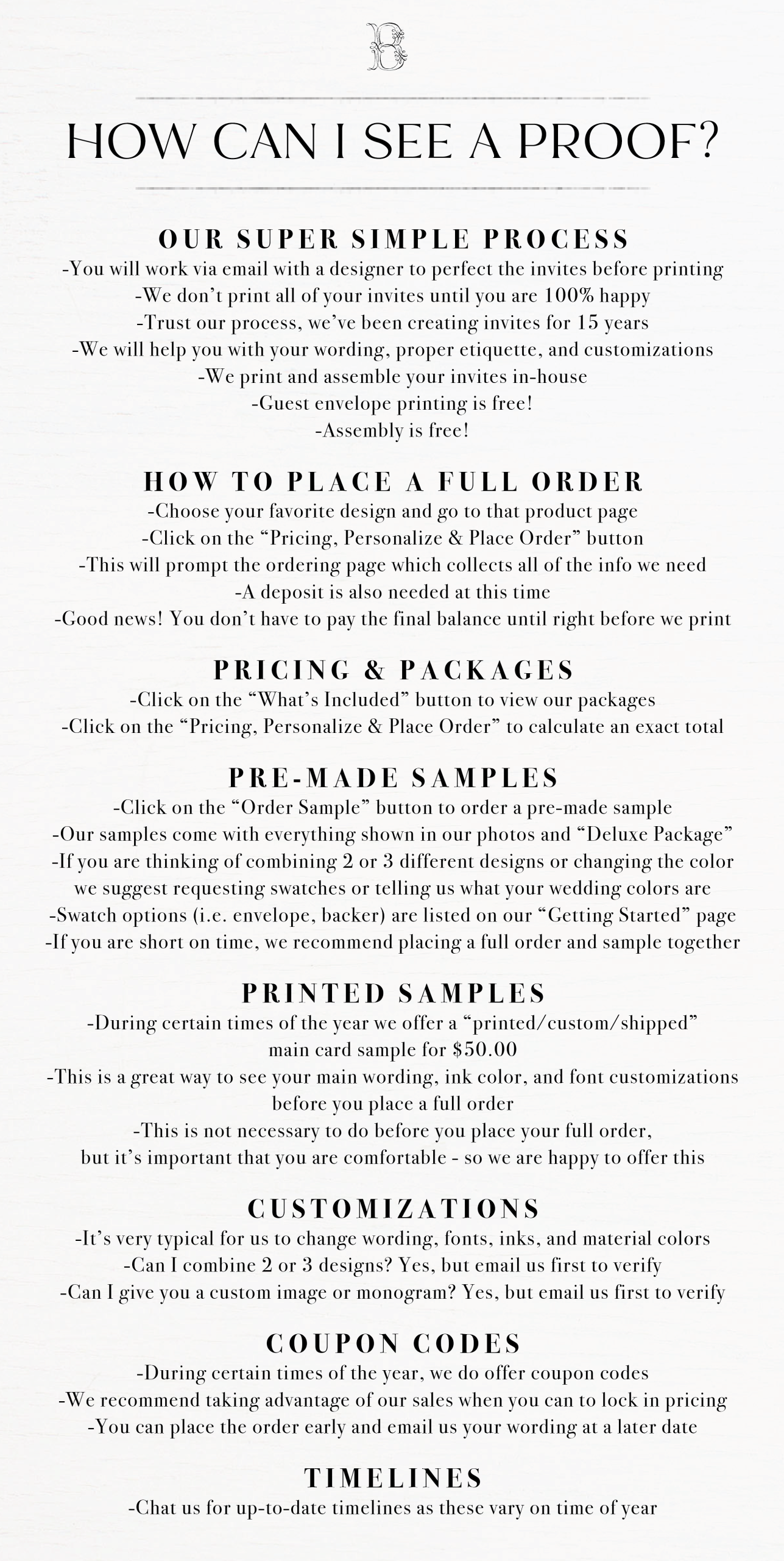 - Allow 5 business days for the initial proof. Once the proof is approved for printing, allow 7 business days for printing/assembly. Chat or email us at info@beaconln.com for up-to-date timelines. During peak wedding season these timelines may extend.