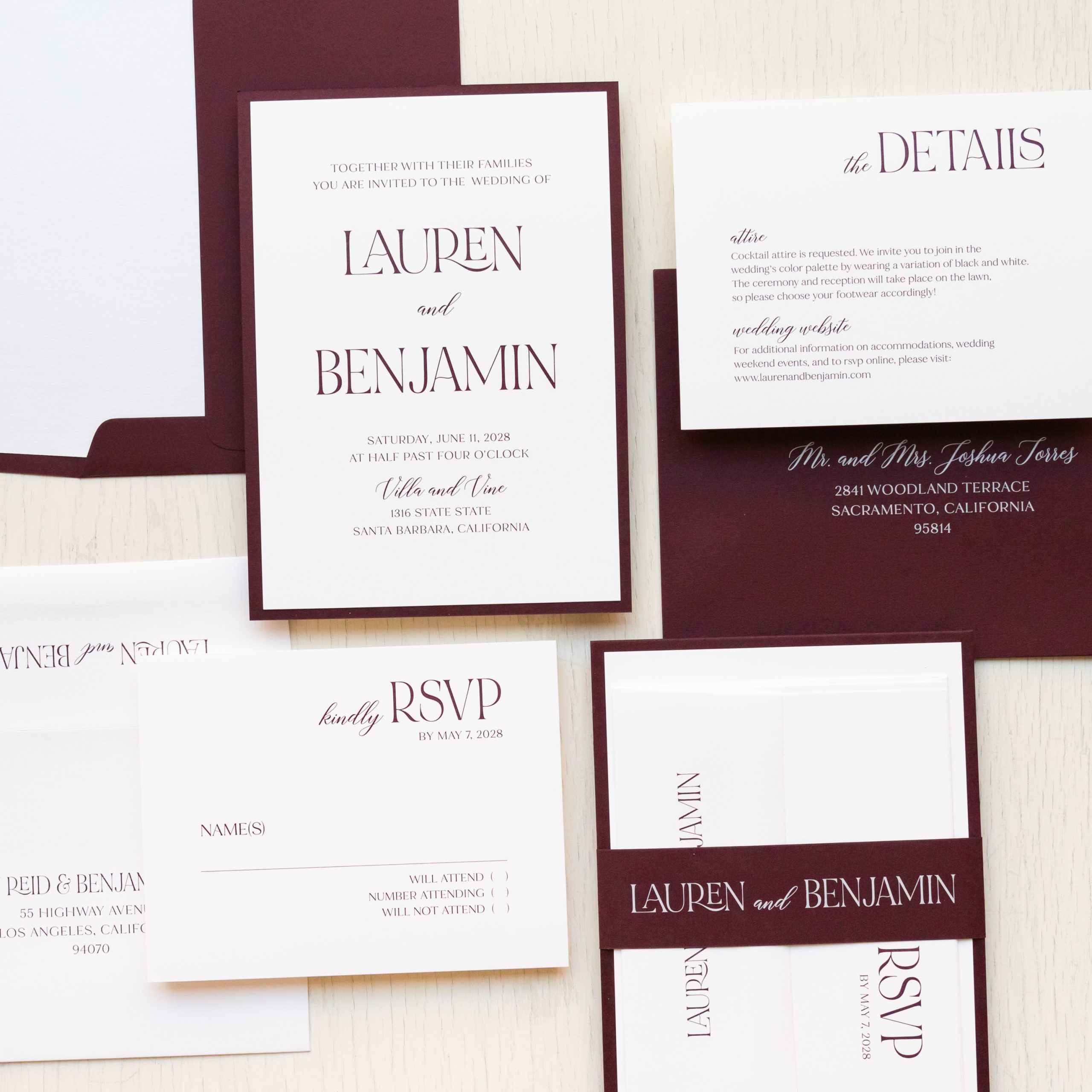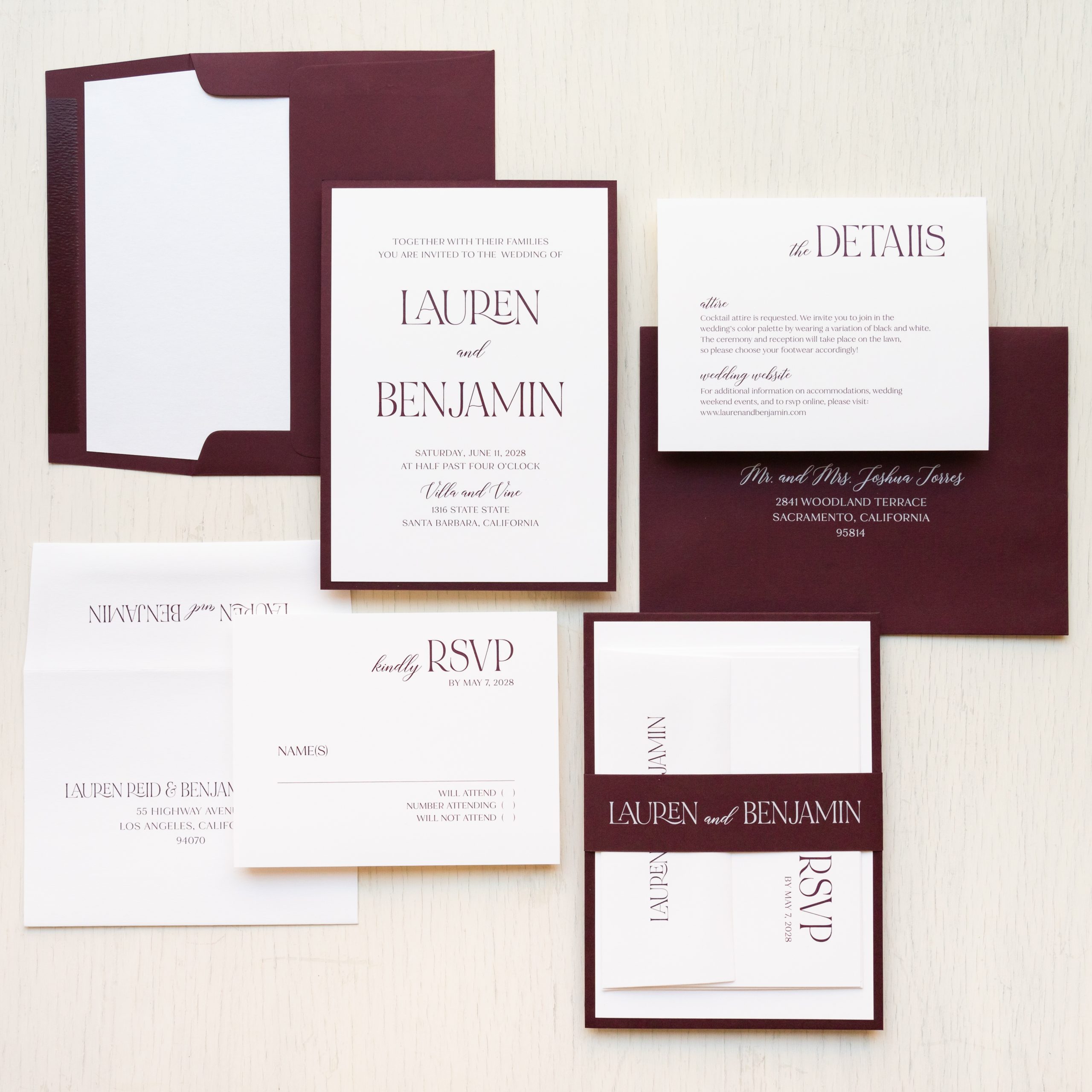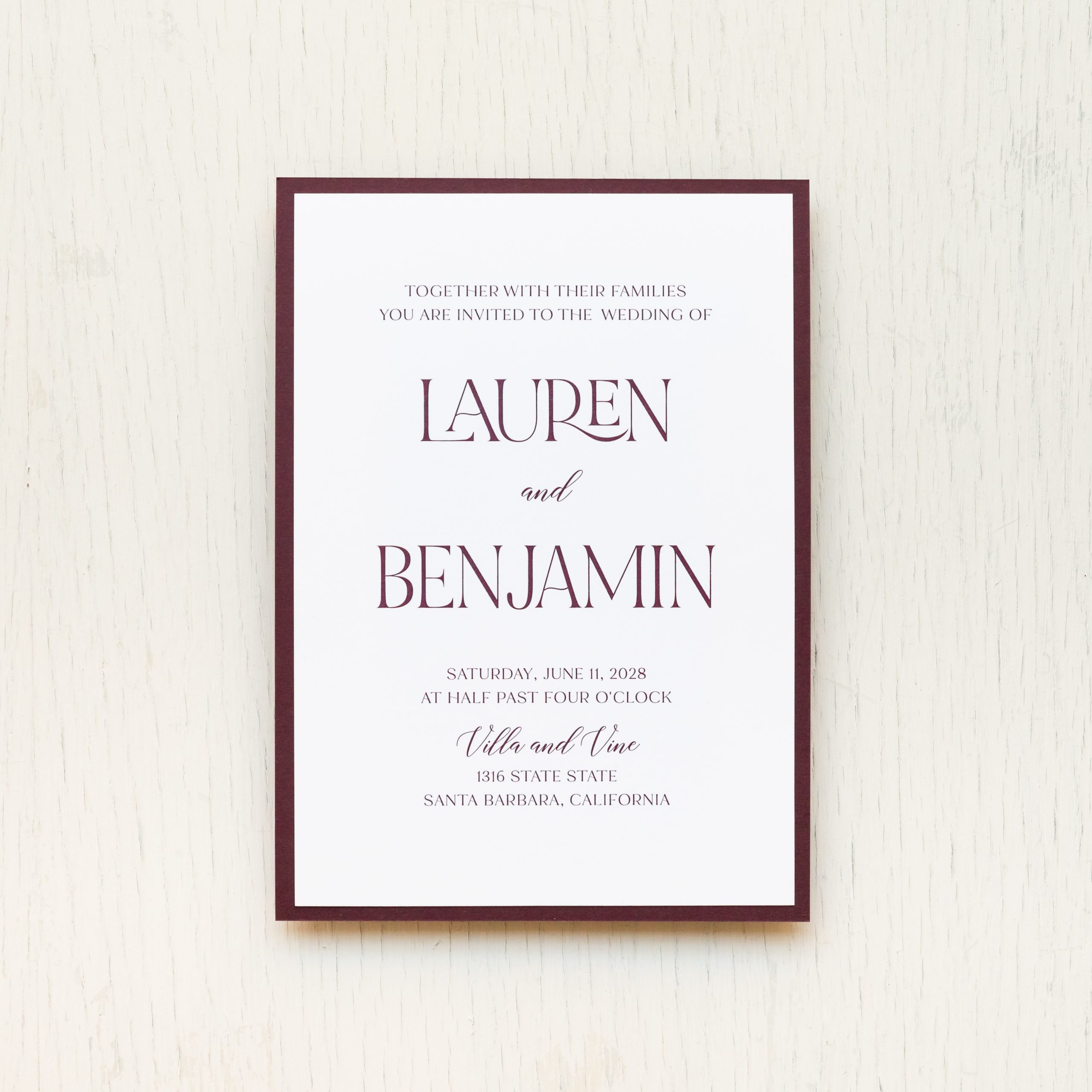 Modern burgundy wedding invitations layered with bold fonts, burgundy envelopes and bright white paper. Shimmery white envelope liners add just a touch of elegance. Simple yet classy, they set an elegant tone for your modern wedding!