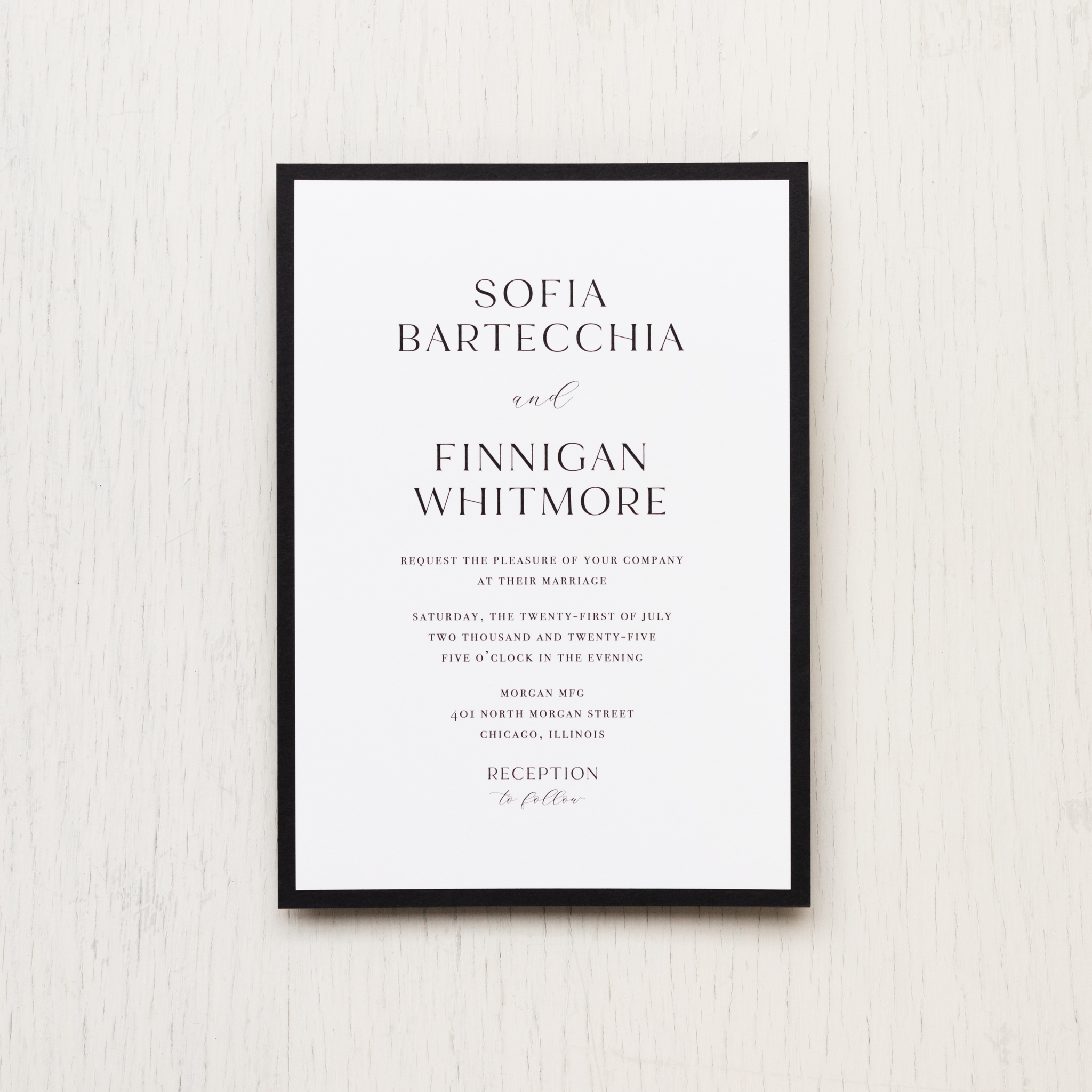 Chicago Modern wedding invitations layered with bold fonts, bright white paper and black accents. Black & white Chicago skyline envelope liners and paper band complete the theme. Simple and minimalist, they set a modern tone for your Chicago wedding!