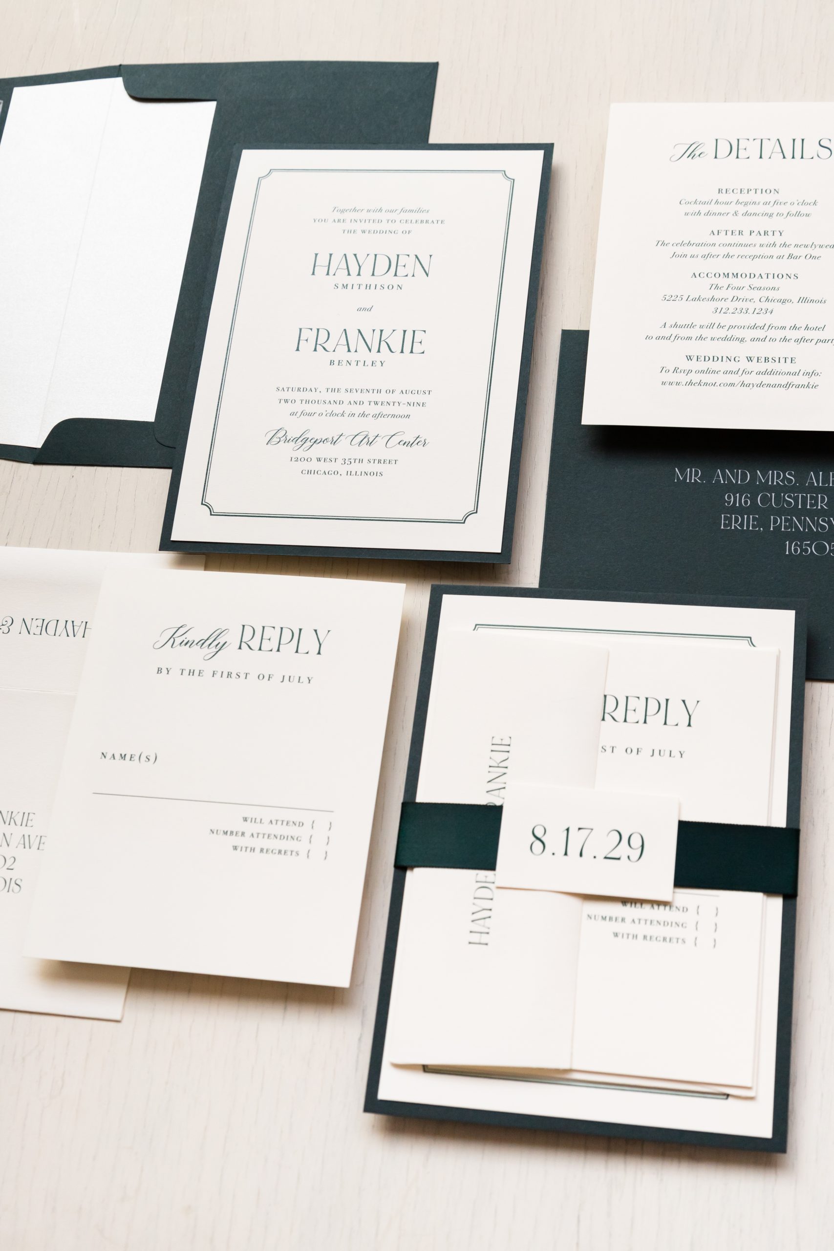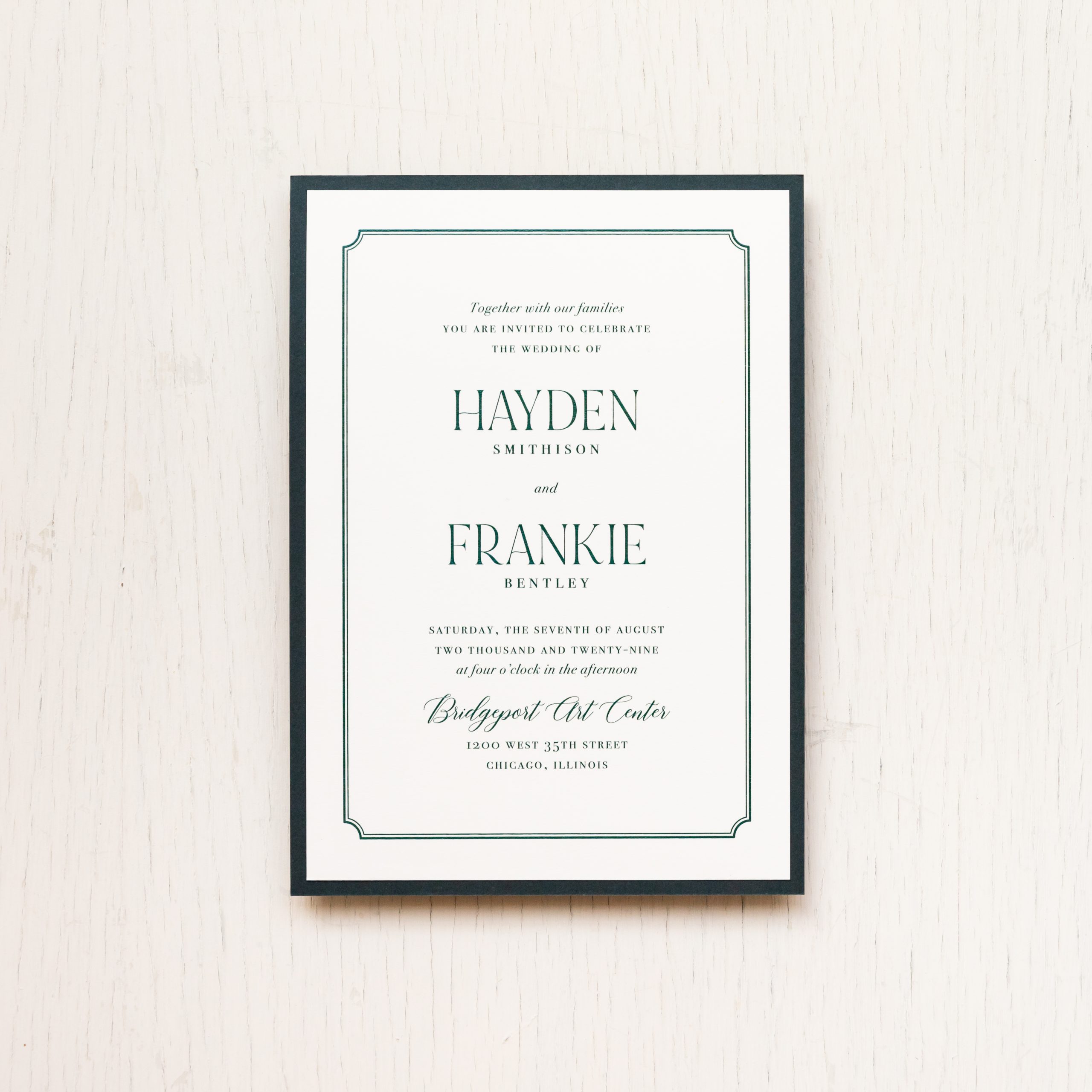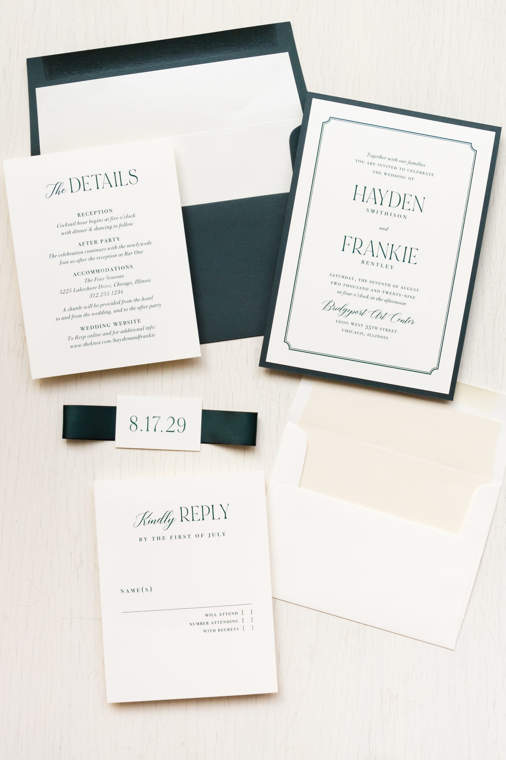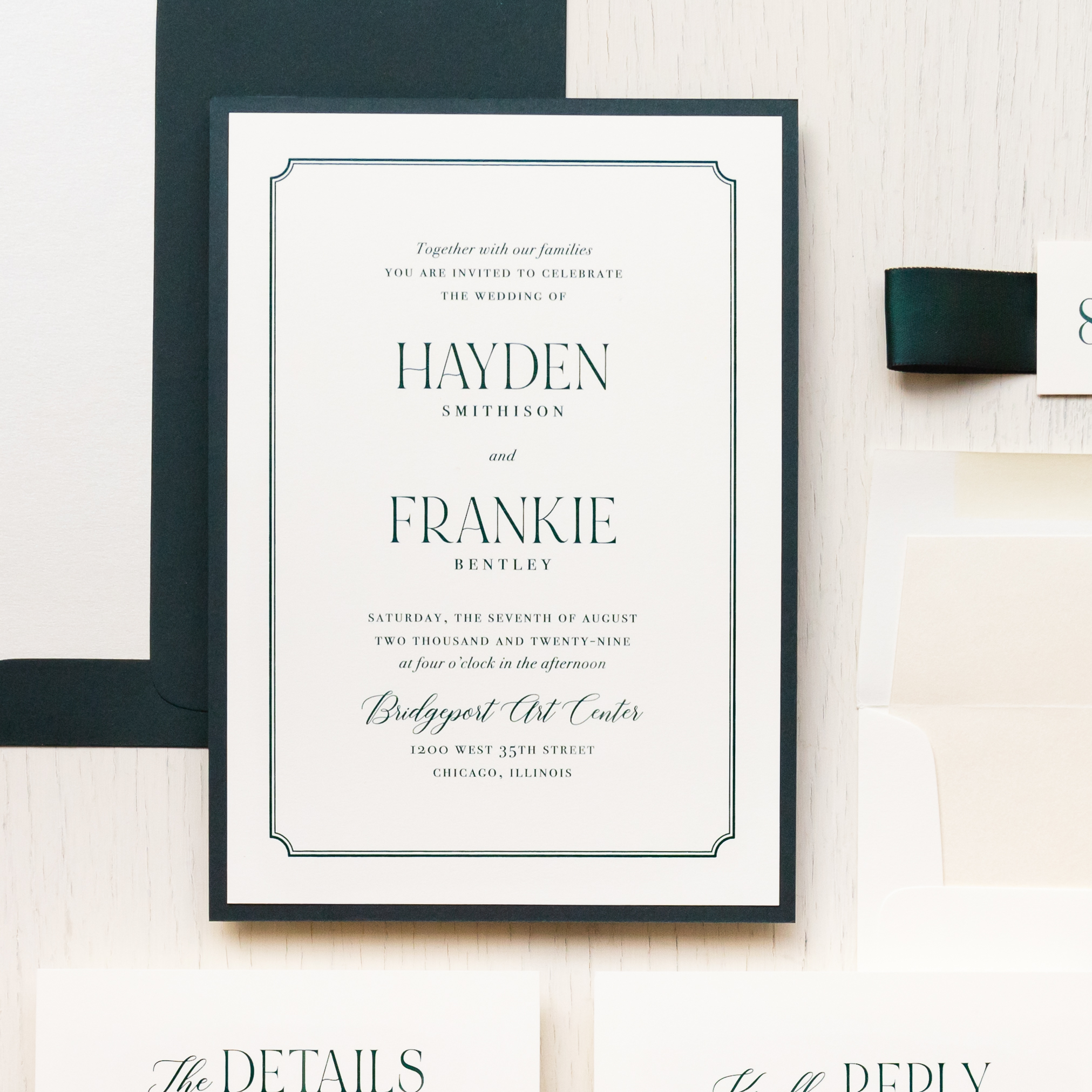 Dark green wedding invitations layered with modern fonts, emerald envelopes and soft ivory paper. Shimmery champagne envelope liners add just a touch of elegance. Simple yet classy, they set an elegant tone for your formal wedding!