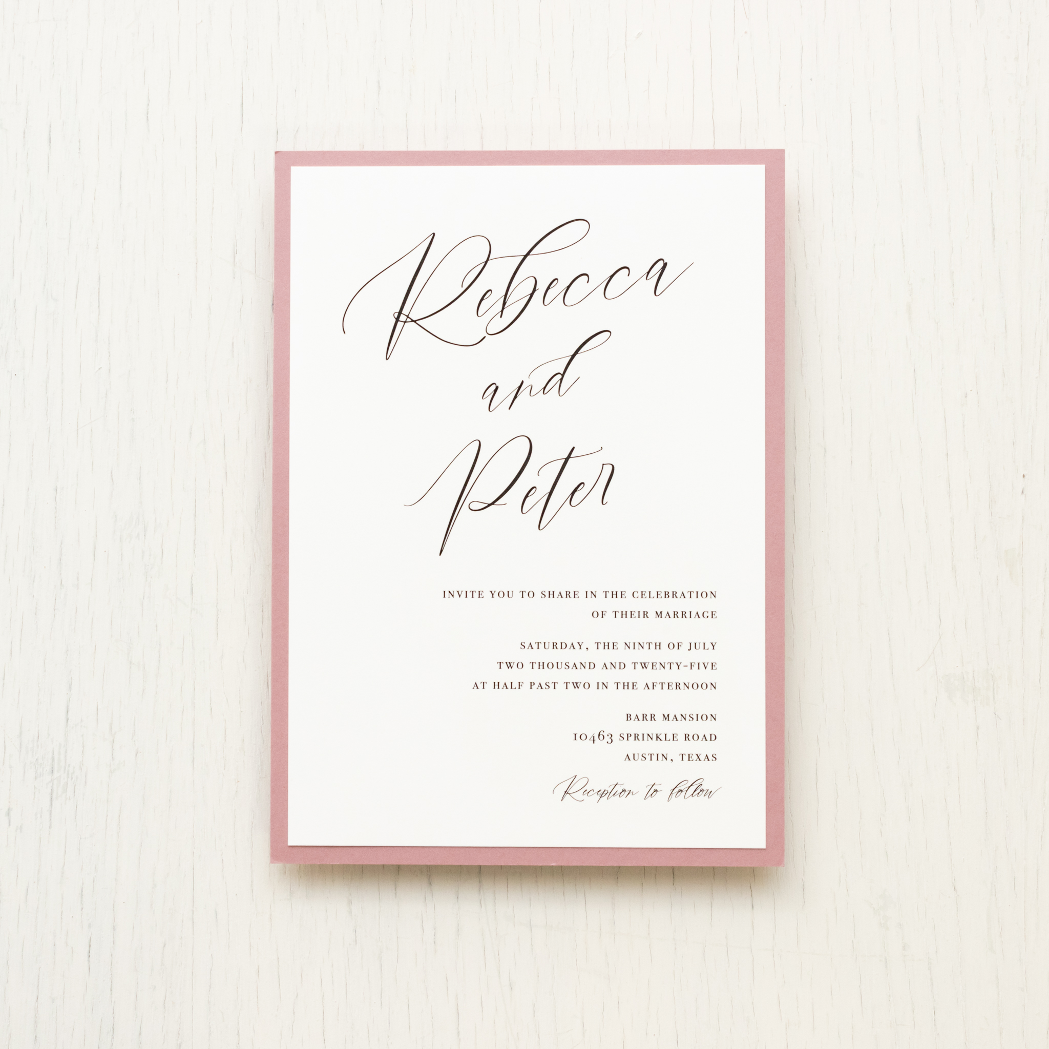 Dusty rose wedding invitations layered with modern fonts, rose envelopes and soft ivory paper. Blush metallic envelope liners add just a touch of elegance. Simple yet classy, they set an elegant tone for your wedding day.