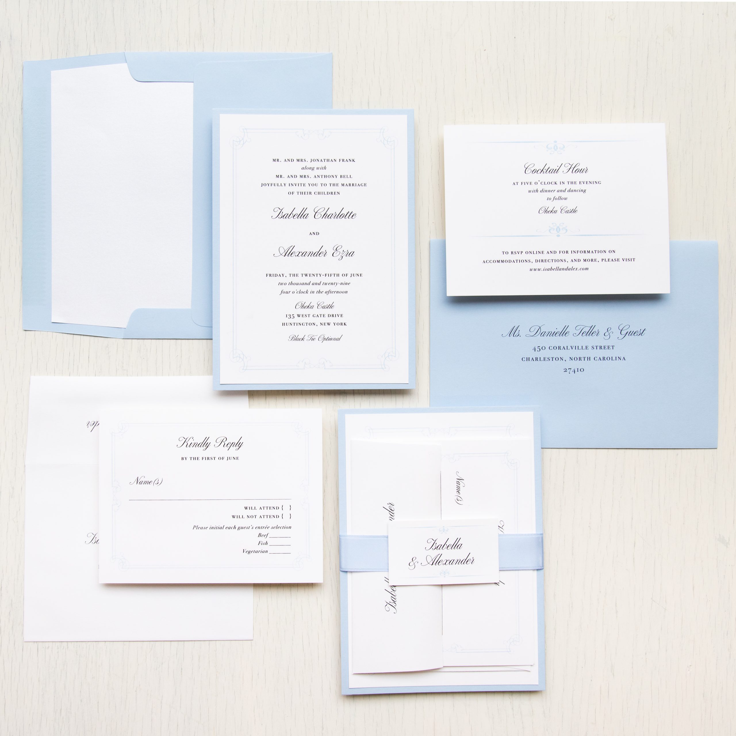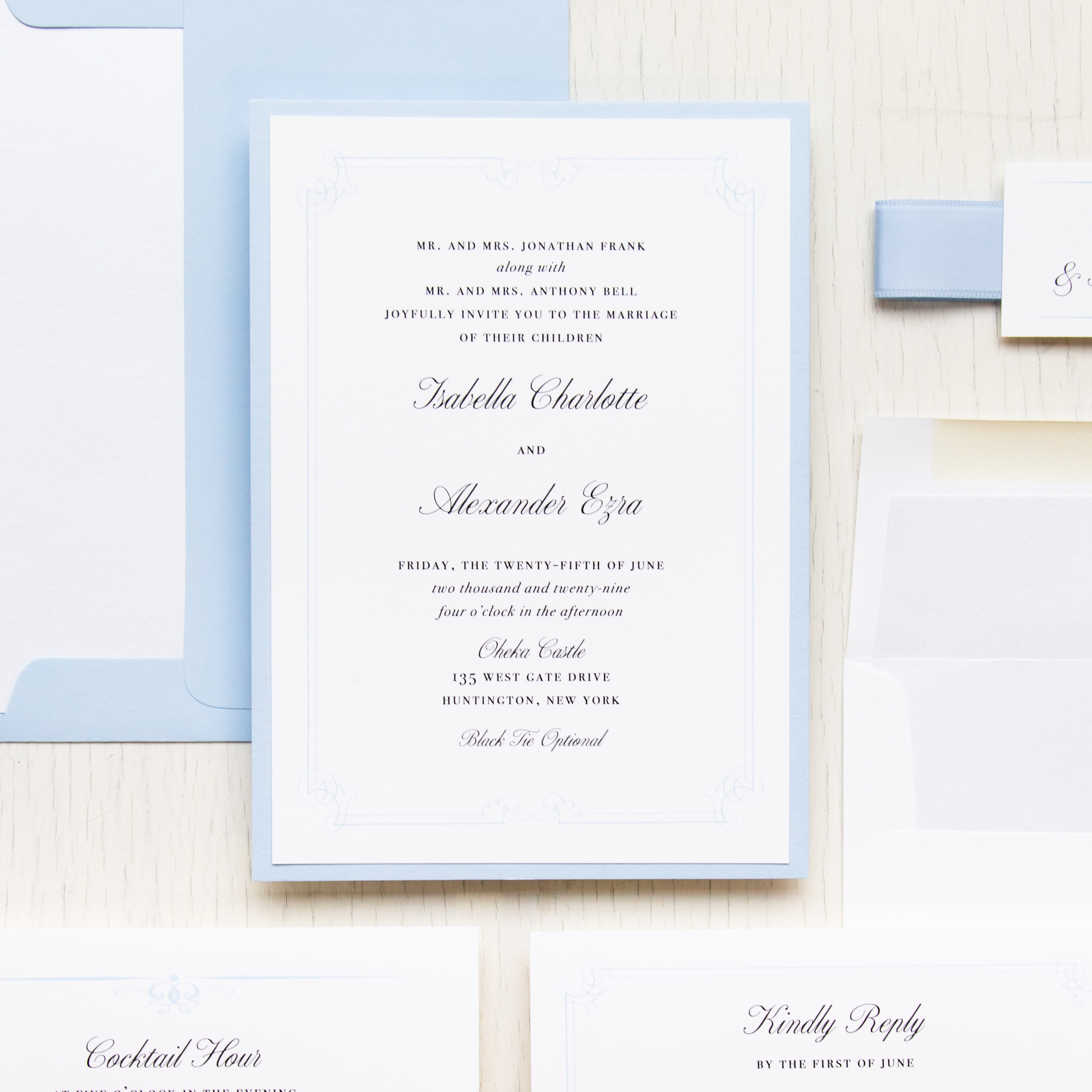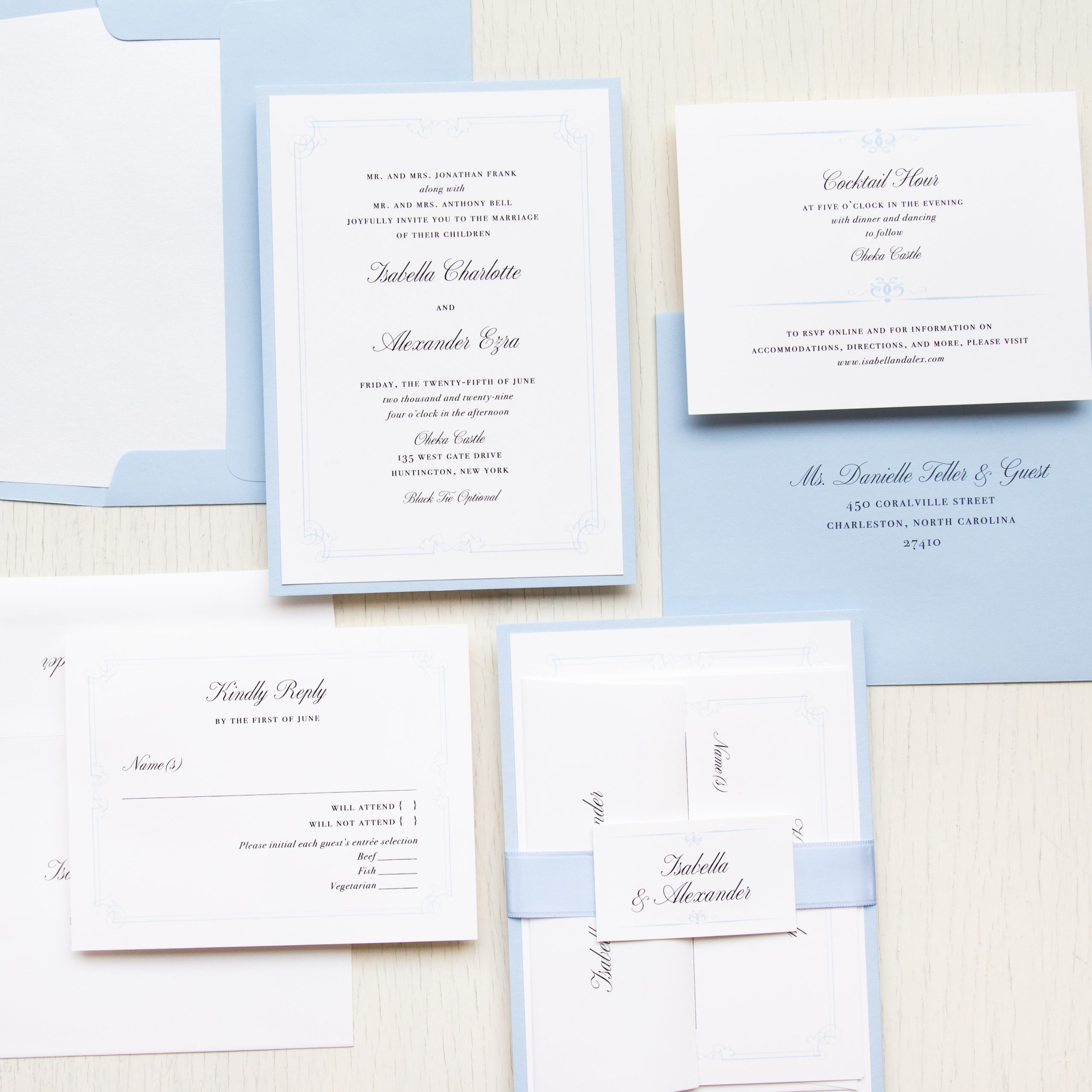 Stylish and modern elegant blue wedding invitations with pale blue details and calligraphy fonts. Work with a live designer to customize wording, fonts, materials, and colors until you are 100% happy!