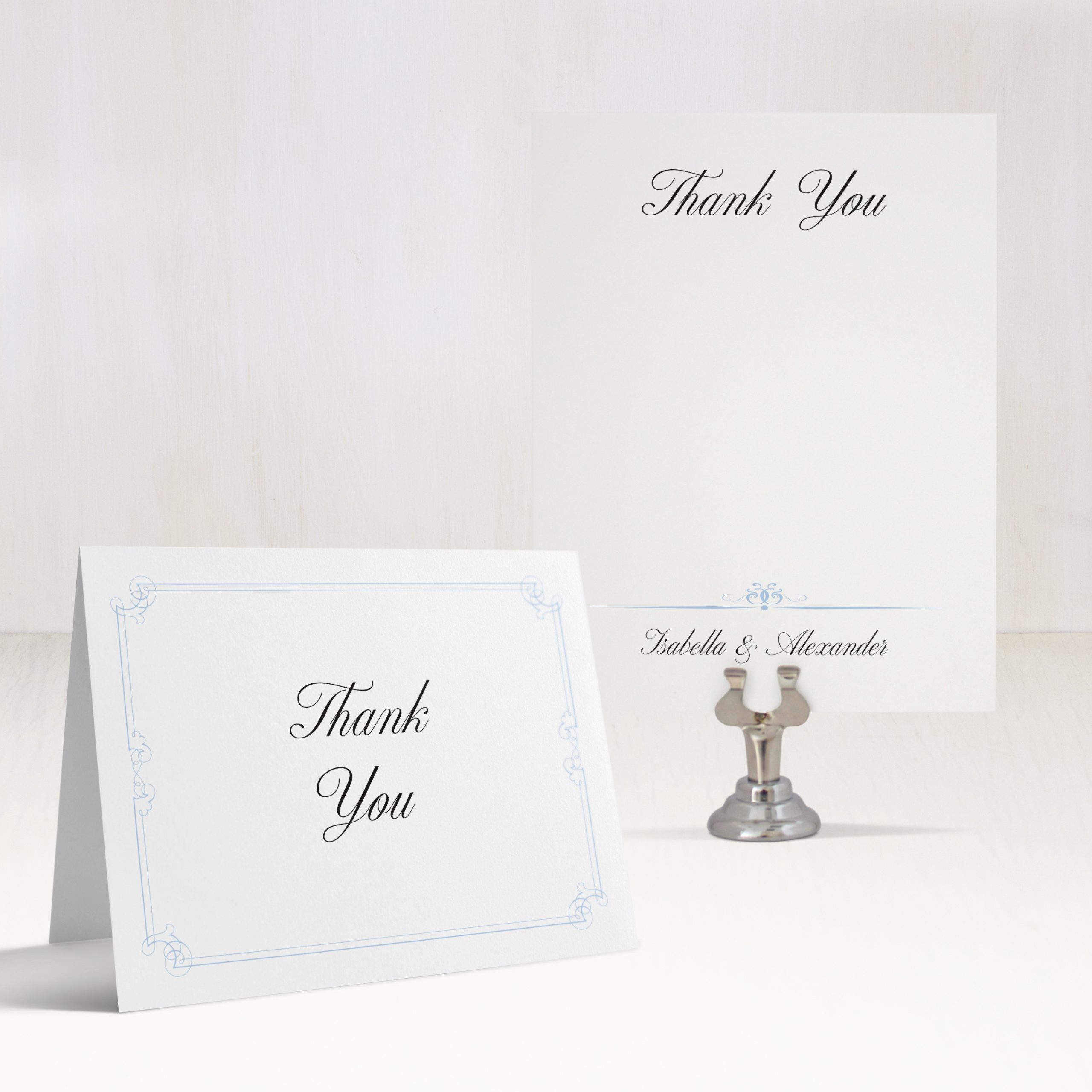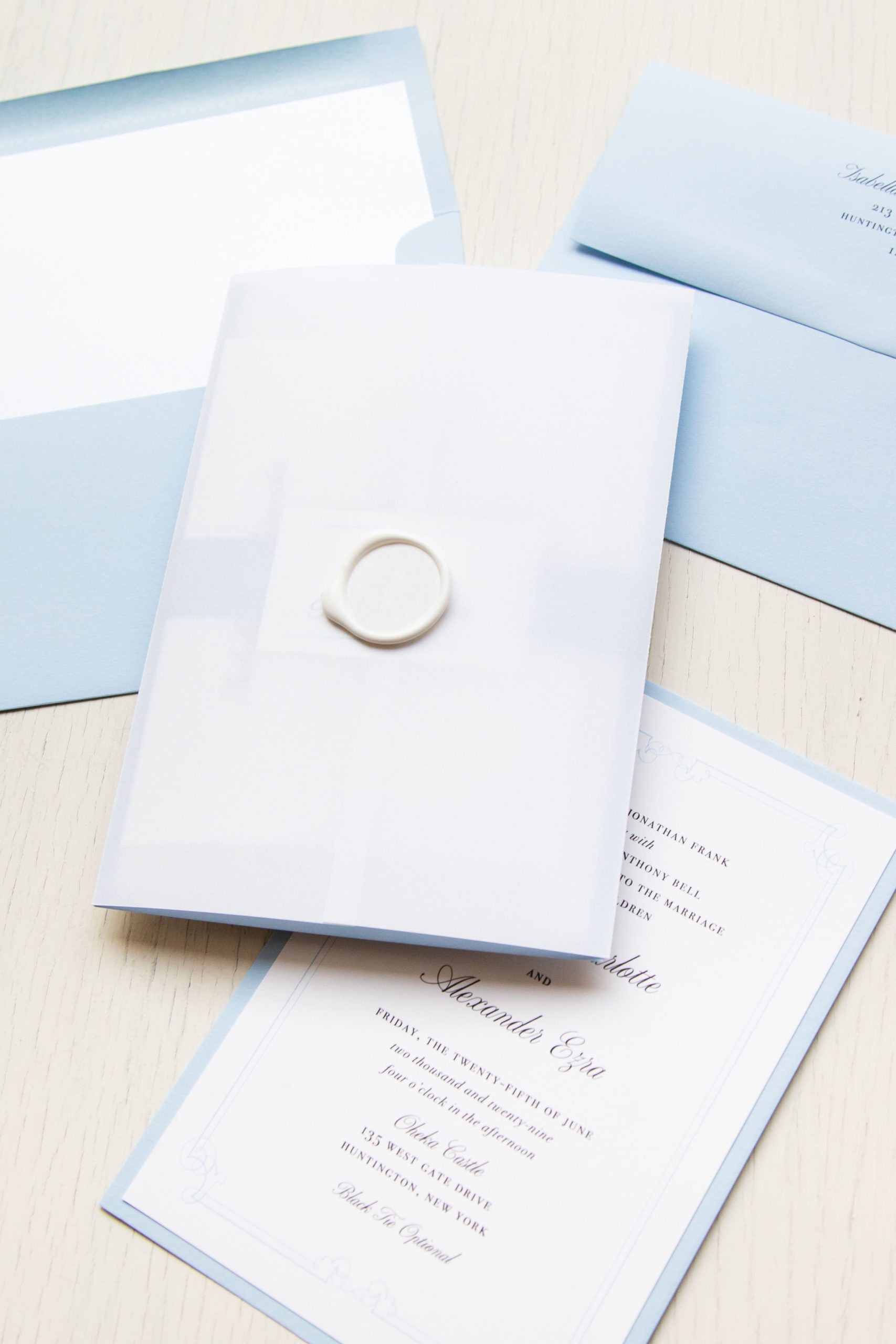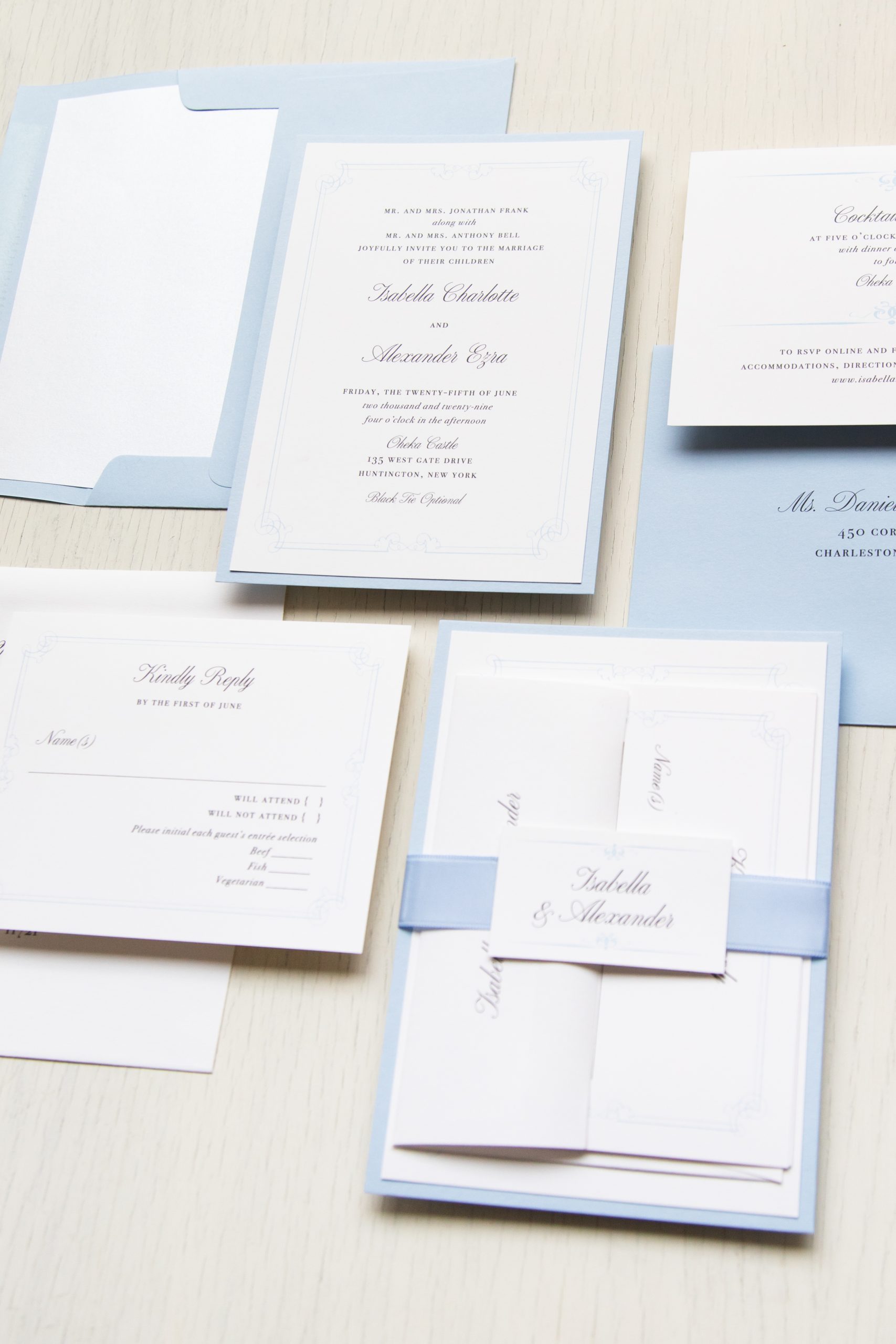 Stylish and modern elegant blue wedding invitations with pale blue details and calligraphy fonts. Work with a live designer to customize wording, fonts, materials, and colors until you are 100% happy!
