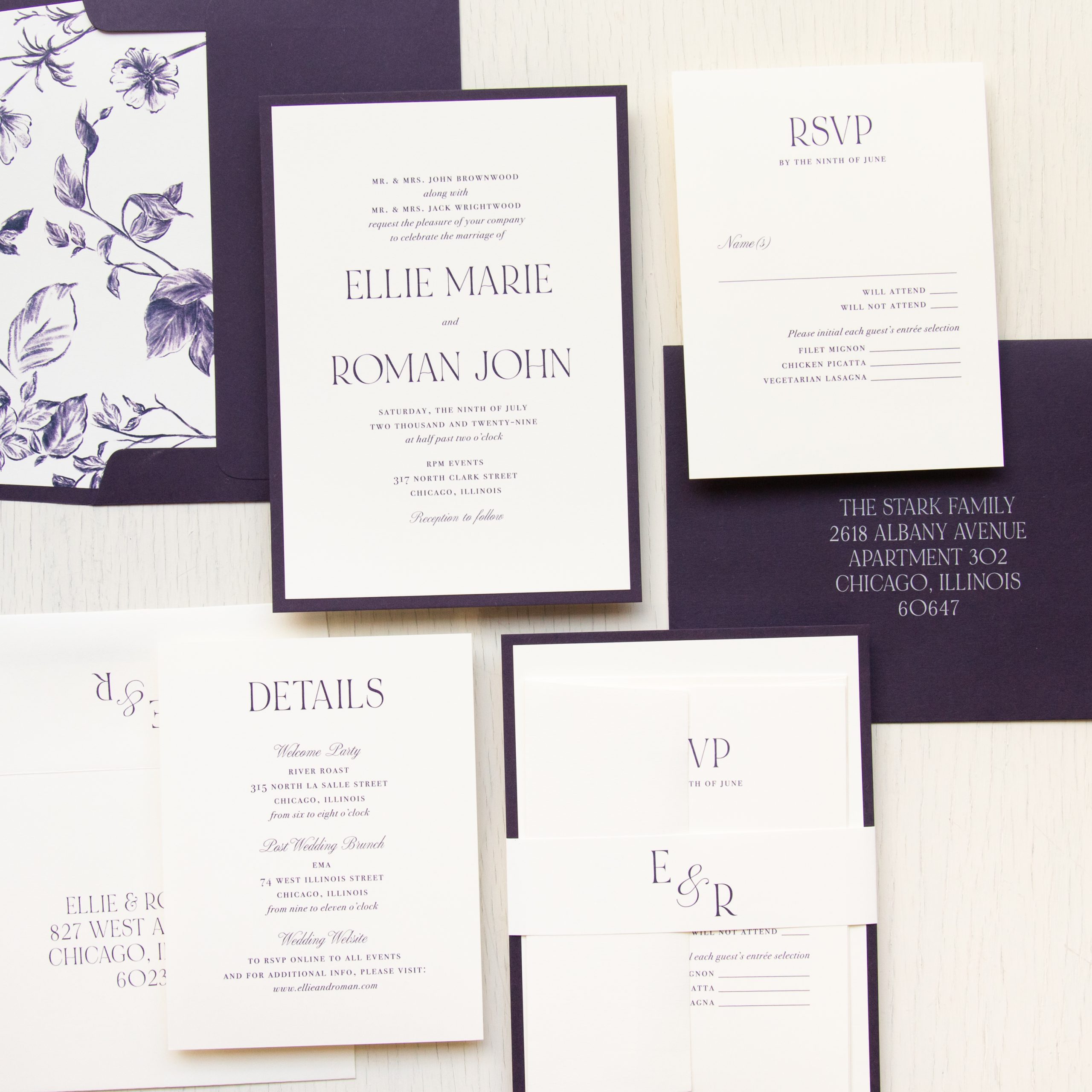 Stylish and modern dark purple wedding invitations with plum florals and bold fonts. Work with a live designer to customize wording, fonts, materials, and colors until you are 100% happy!