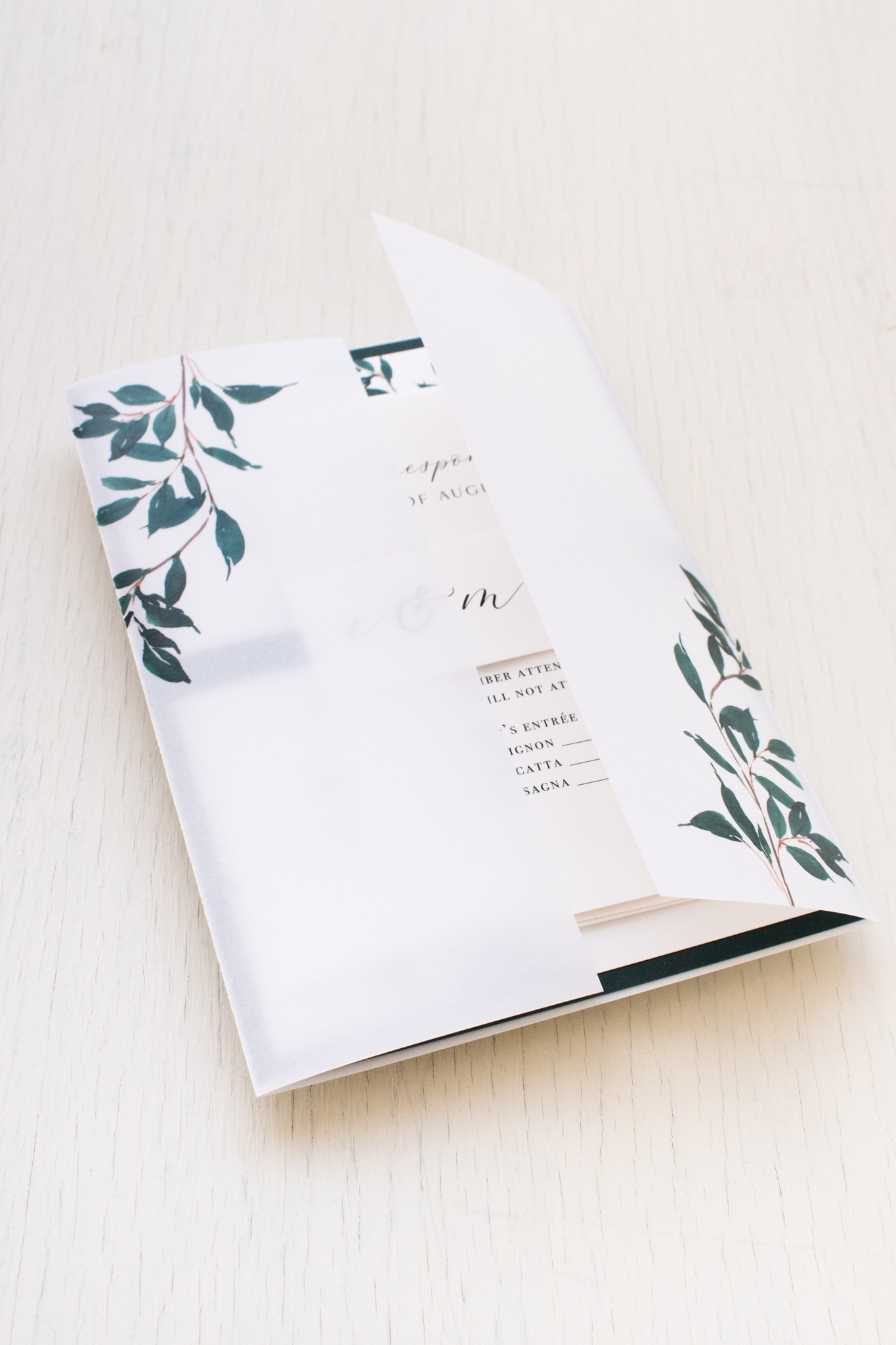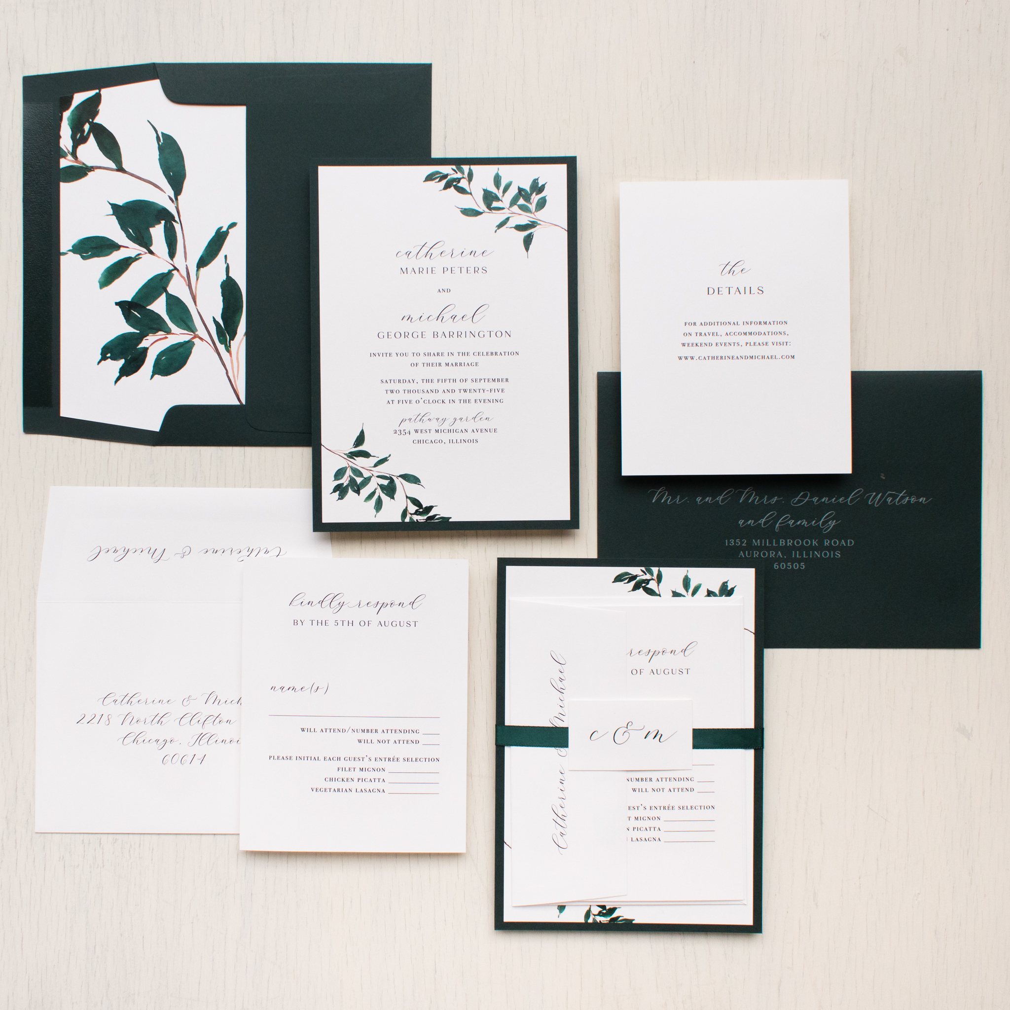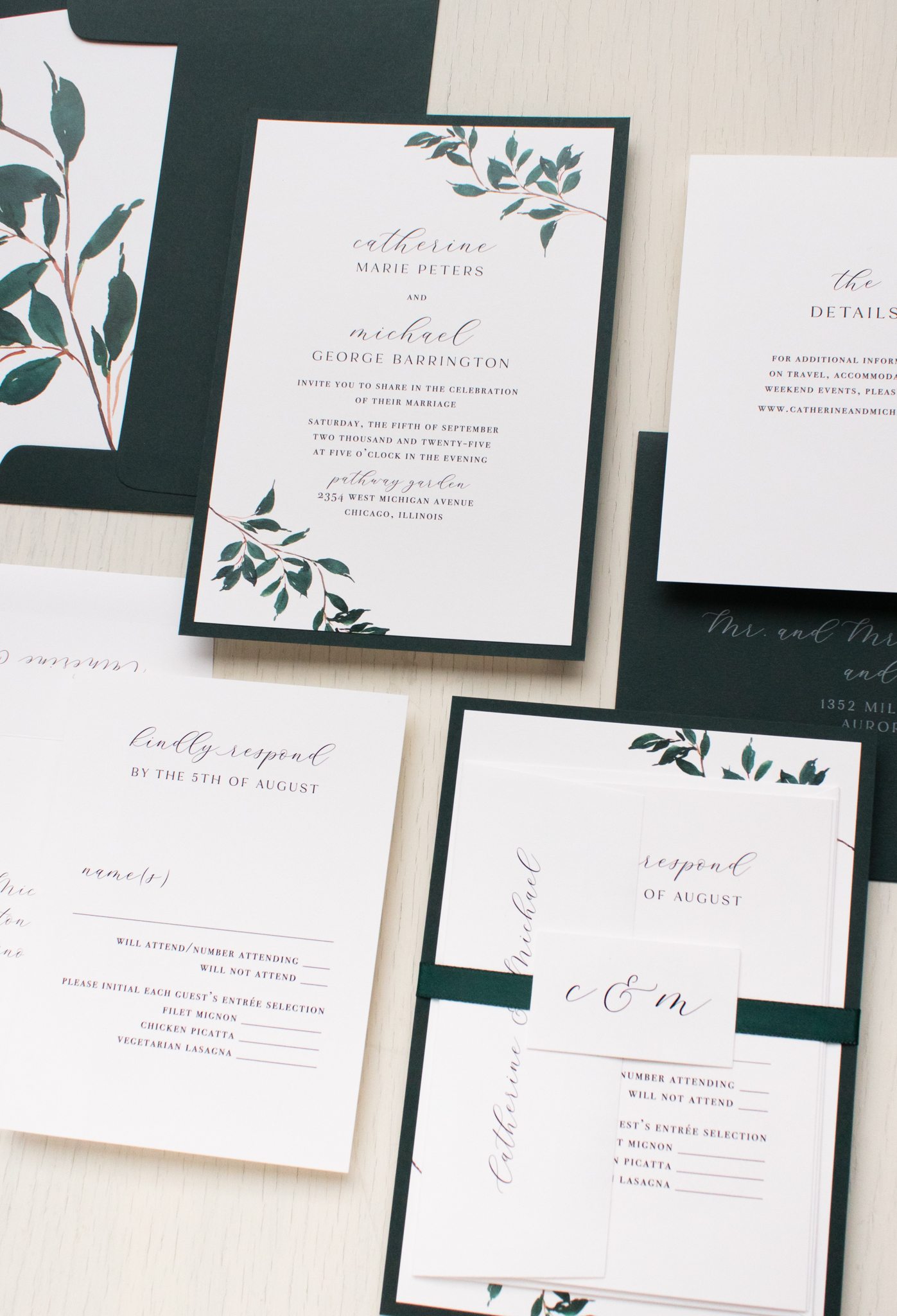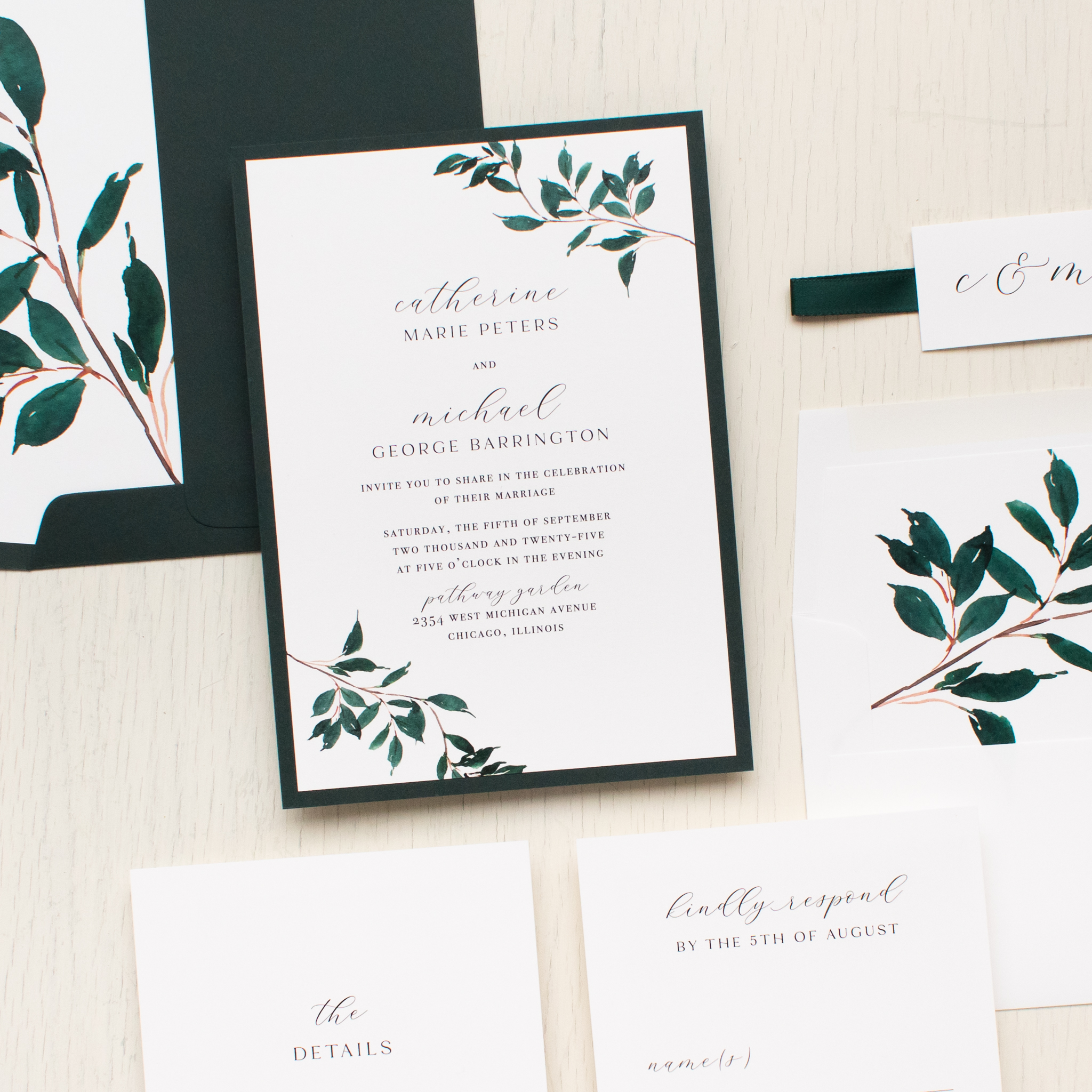 Forest Green Modern wedding invitations layered with modern fonts, emerald envelopes and printed on bright white paper. Matching greenery envelope liners add just a touch of elegance. Simple yet classy, they set an modern tone for your wedding day.
